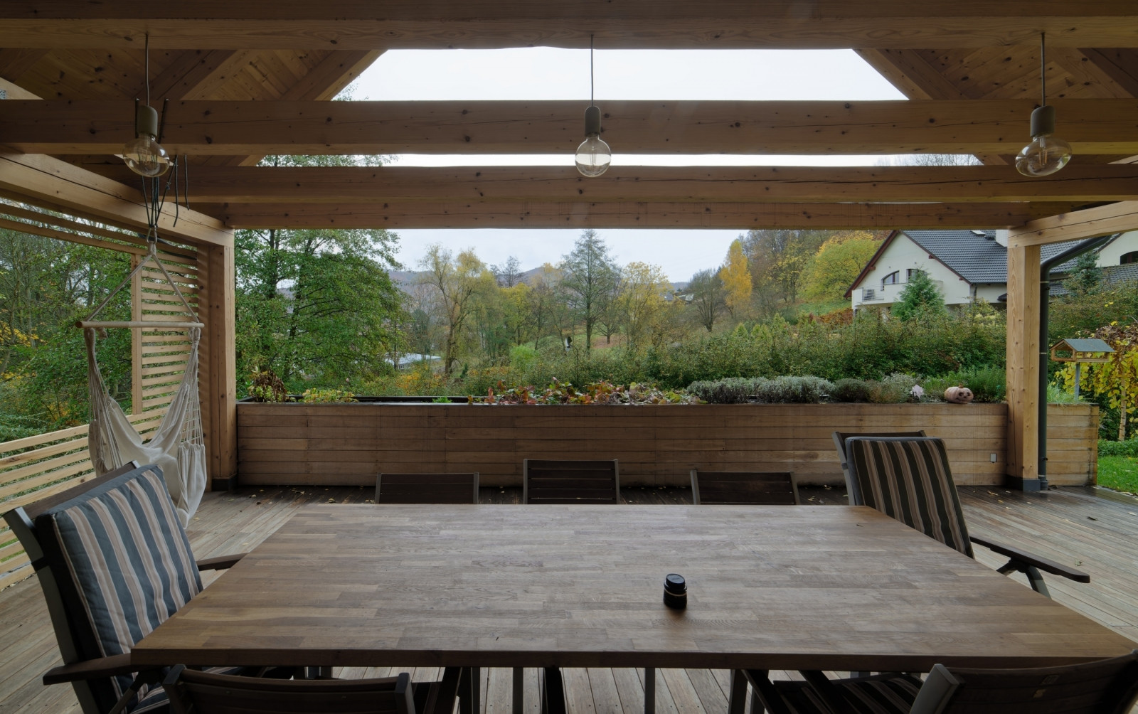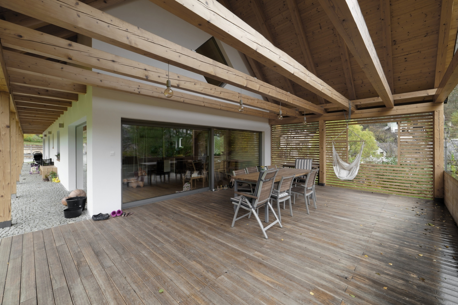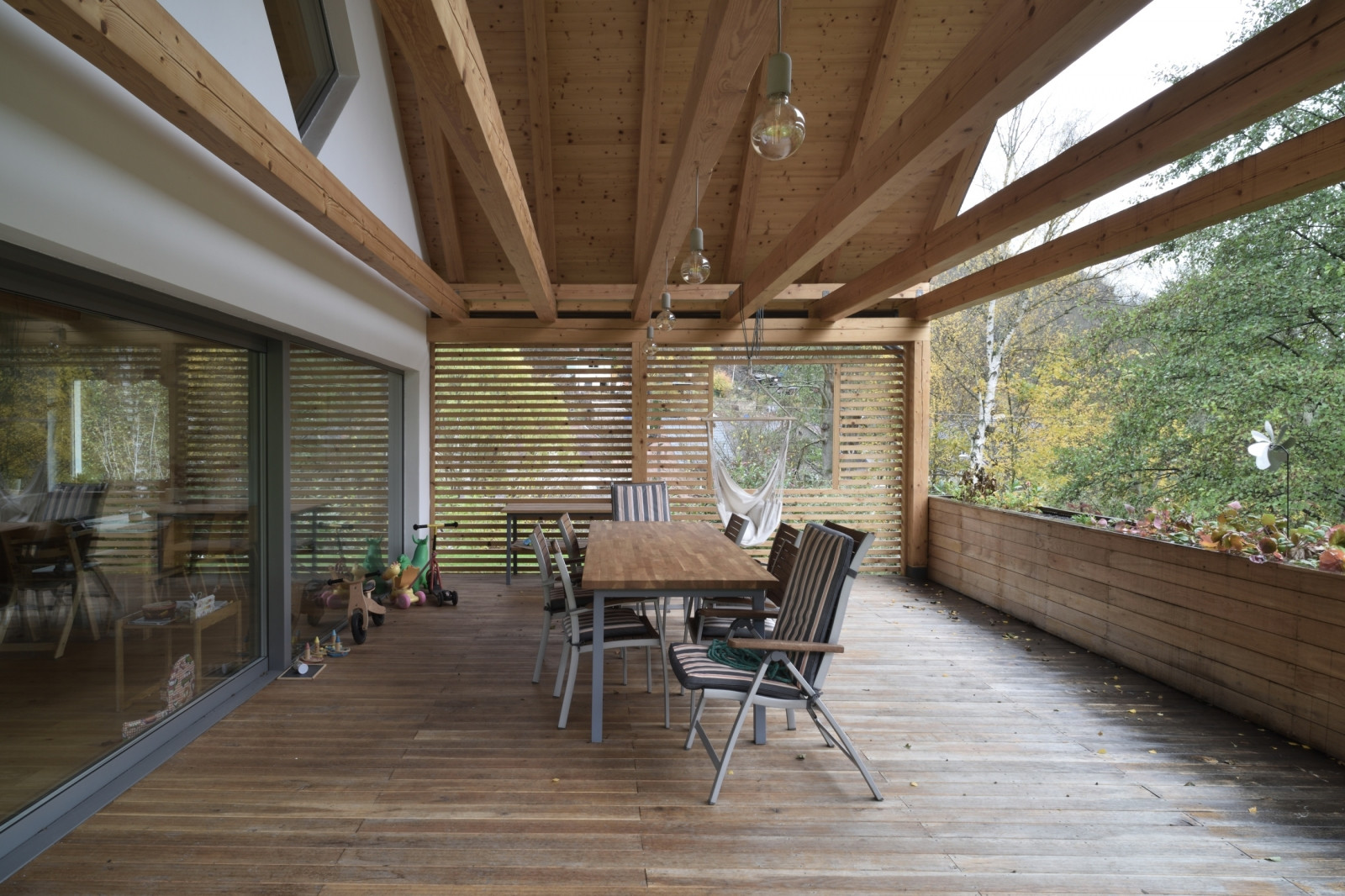 Ústřední motiv celého návrhu představuje sedlová střecha, která není pouhým „nostalgickým symbolem“ – její výrazné přesahy totiž vytváří kryté venkovní prostory, kolem kterých je organizována celá dispozice domu. Podél západní fasády směřující do zahrady vzniká loubí, na štítových stranách zase prostorné kryté plochy. Jedna z nich slouží jako praktický prostor pro skladování dřeva nebo kol, druhou využívají majitelé jako venkovní terasu, která je díky prosklené stěně s posuvnými dveřmi volným pokračováním hlavního obytného prostoru.
