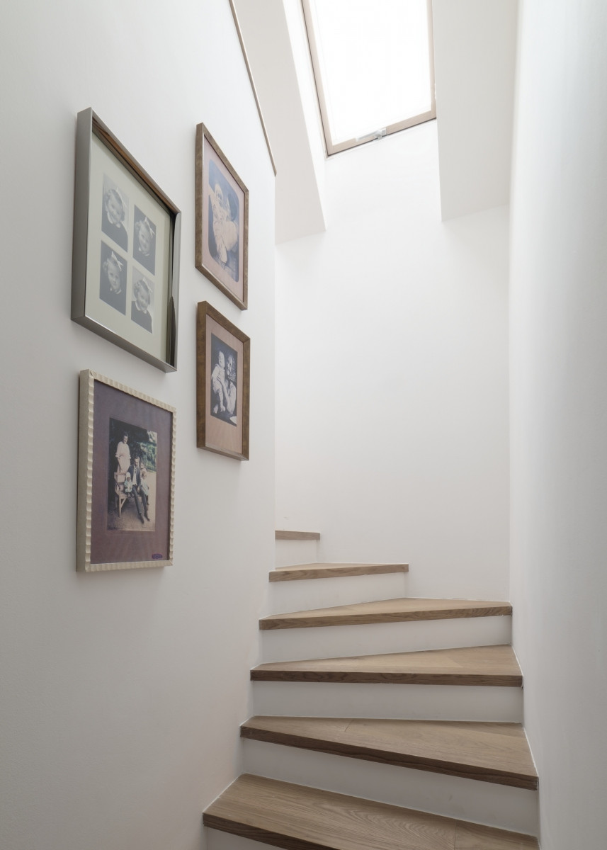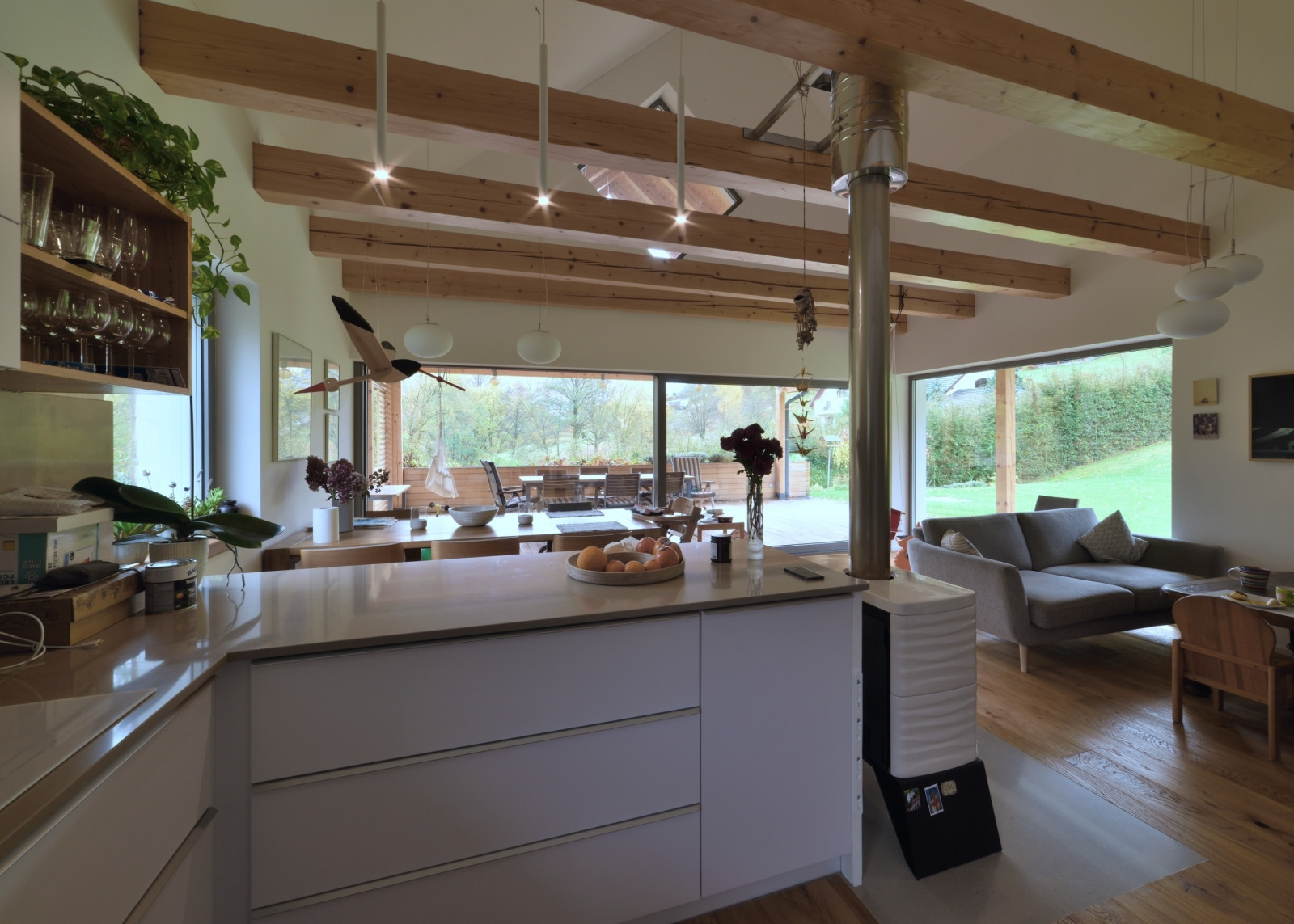 Napříč celou hmotou domu procházejí přiznané dřevěné trámy objevující se jak v obytných místnostech přízemí, tak i v krytých venkovních prostorech. Jak už bývá u domů z dílny studia 3+1 architekti zvykem, interiér je zařízen střídmě, ve světlých tónech a s důrazem na praktický provoz.
