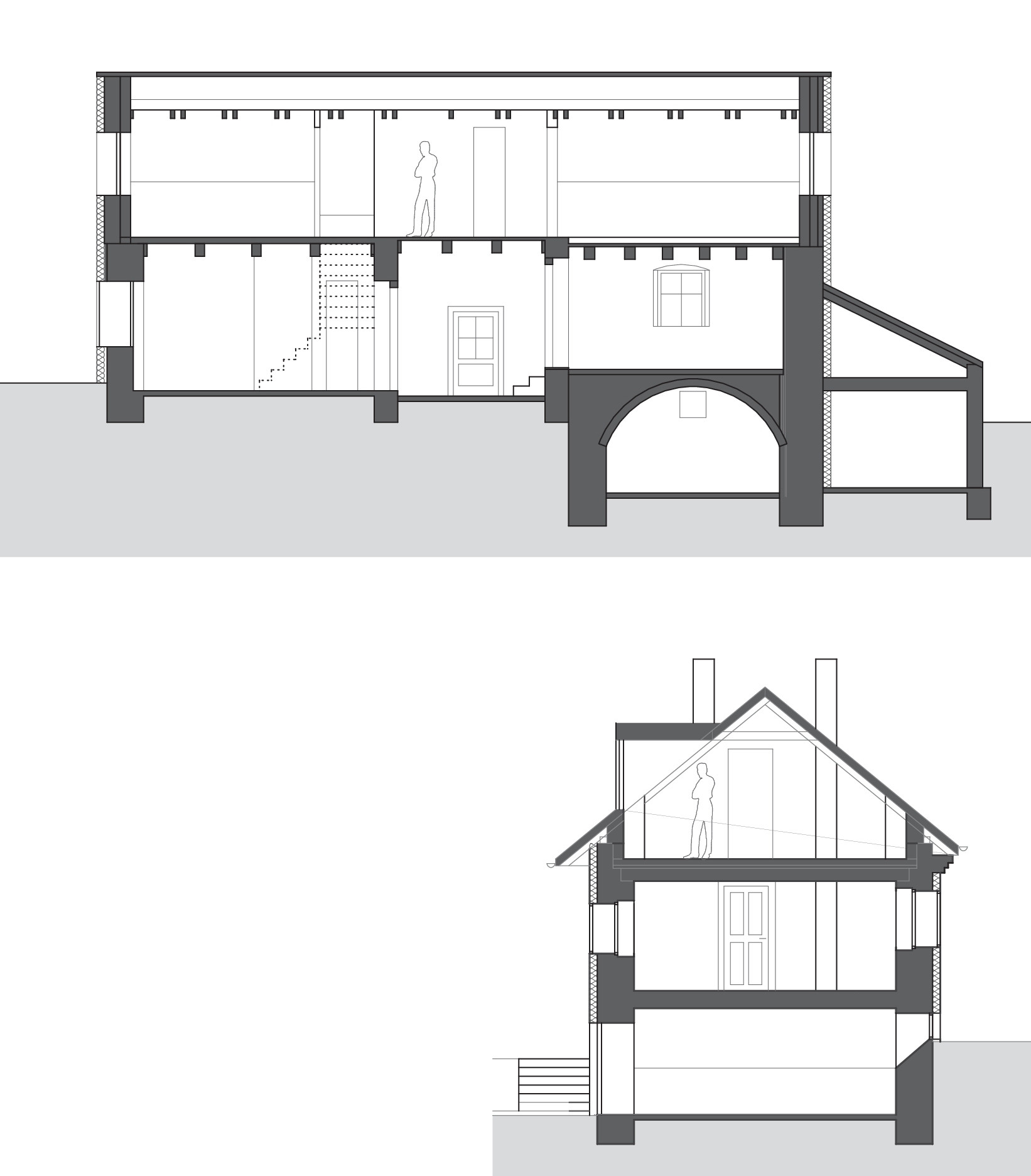 Rekonstrukce rodinného domu v Černošicích, řezy, 3+1 architekti