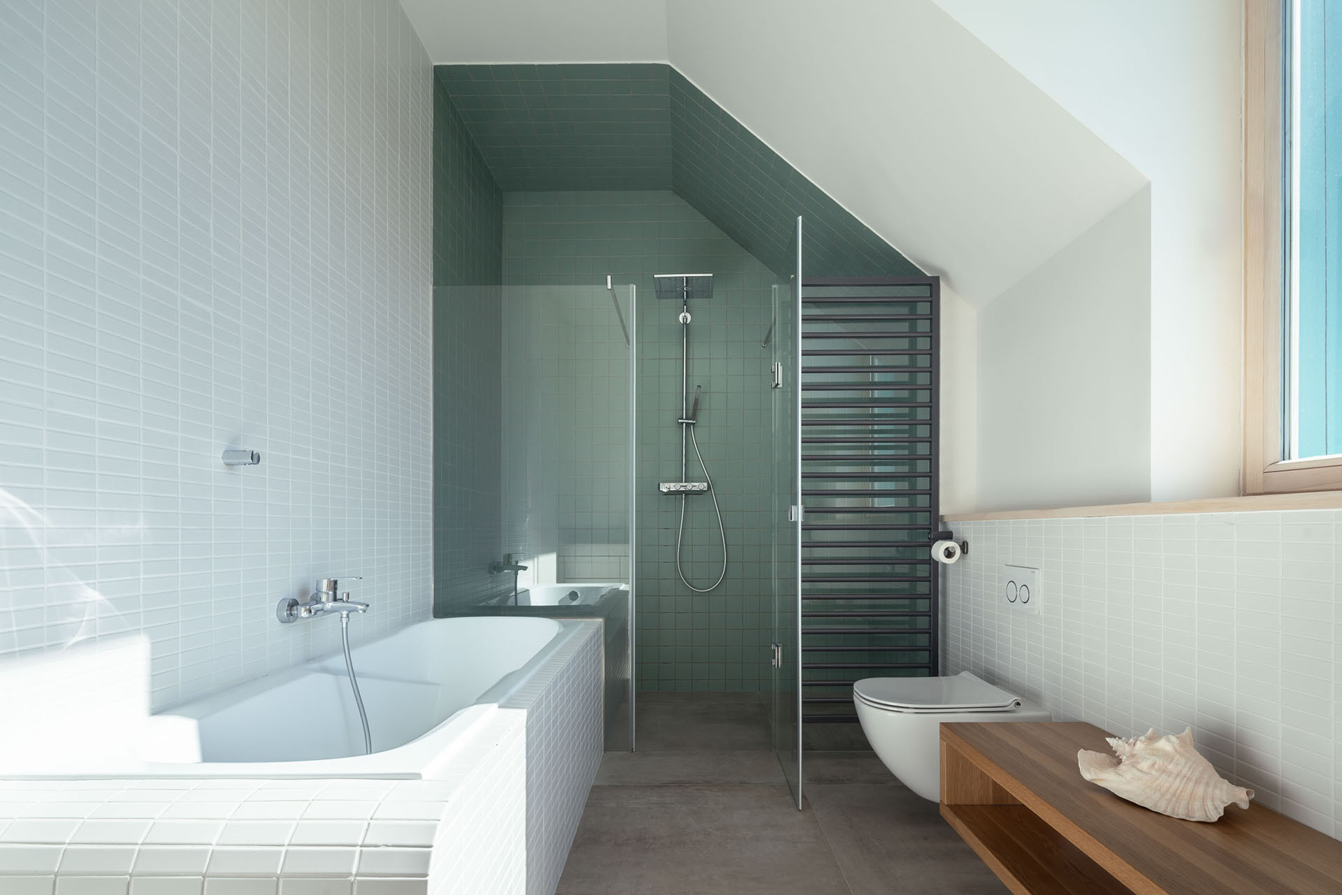 Když přirozené stínění nestačí, zajistí příjemné vnitřní klima stropní chlazení. Jeho spotřeba je přitom aspoň částečně pokryta elektřinou vyrobenou z fotovoltaiky osazené na zastřešení terasy. Domu tímto svým umístěním energeticky přispívá a přitom nekazí jeho architekturu – červená bobrovka na sedlových střechách hlavních hmot domu mohla zůstat bez málo vzhledných černých panelů.