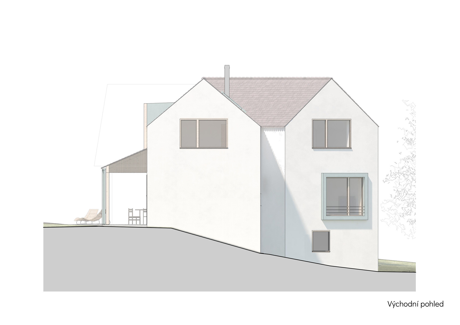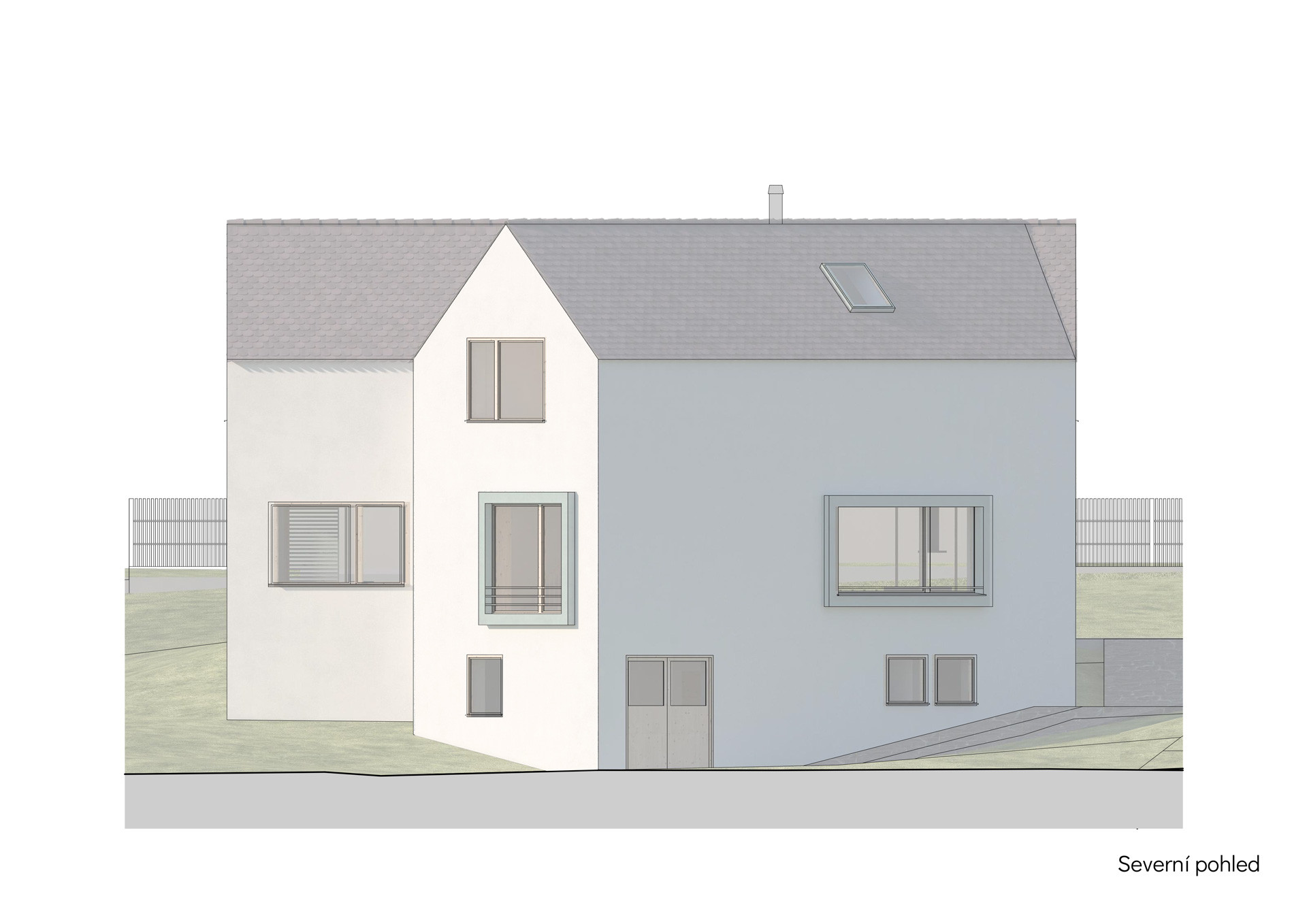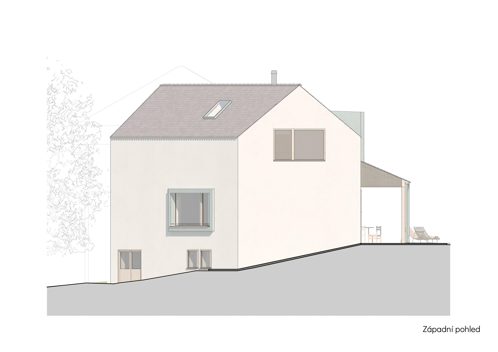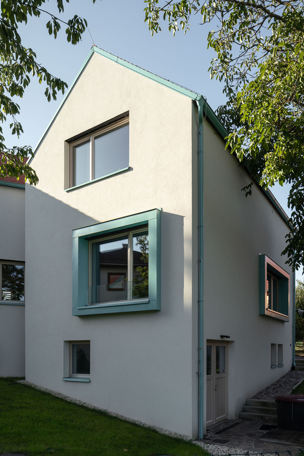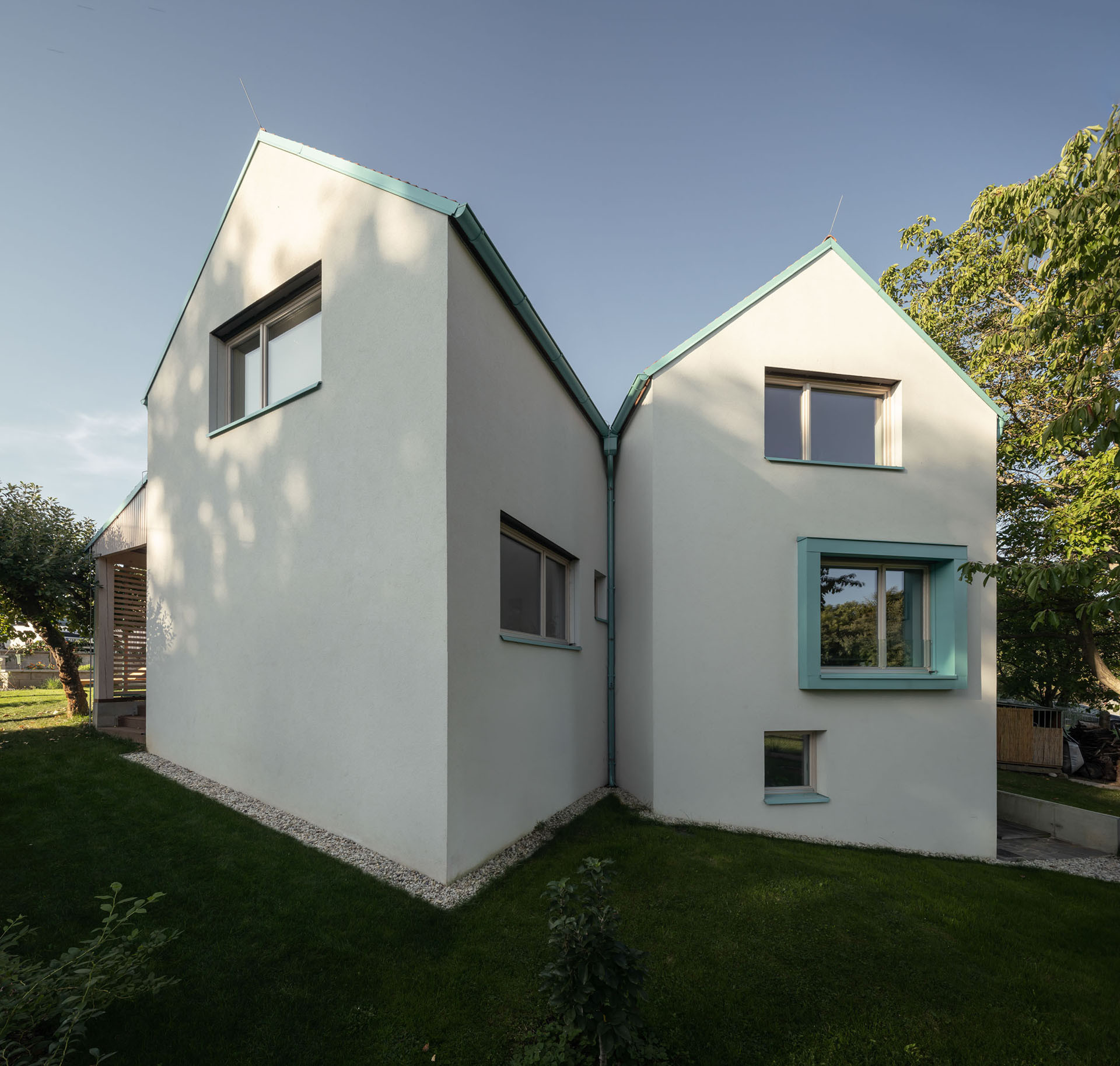 Právě díky rozdělení do dvou křídel působí výsledná stavba opticky menší, než ve skutečnosti je. Zadní křídlo s obývacím pokojem na přízemí zůstává při pohledu z ulice skryté. A obyvatelům domu to dává také více soukromí, hlavní obytné místnosti jsou orientované do krajiny, a na domy sousedů z novostavby obecně směřuje jen jedno okno.
