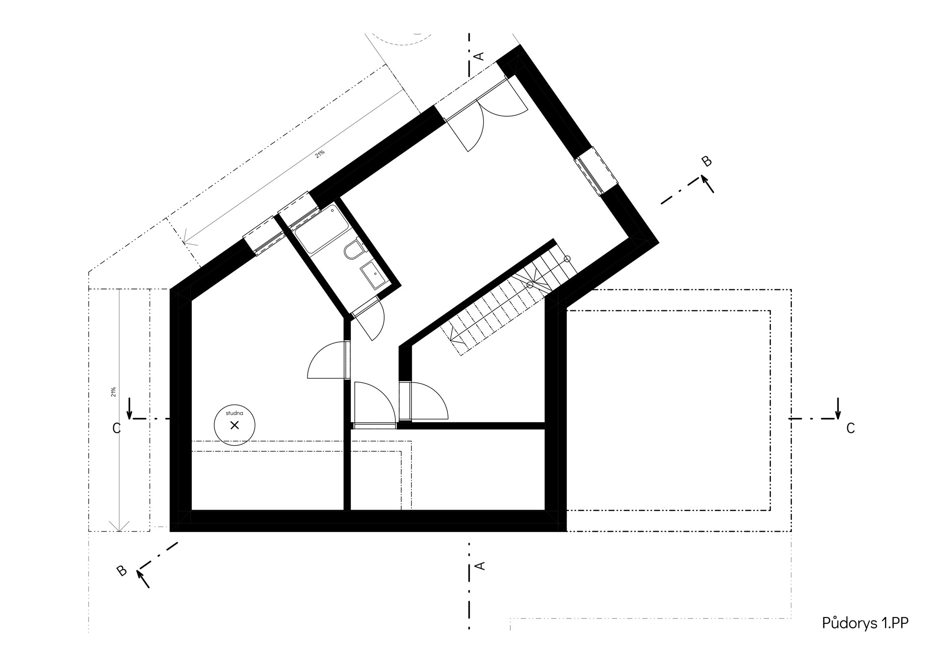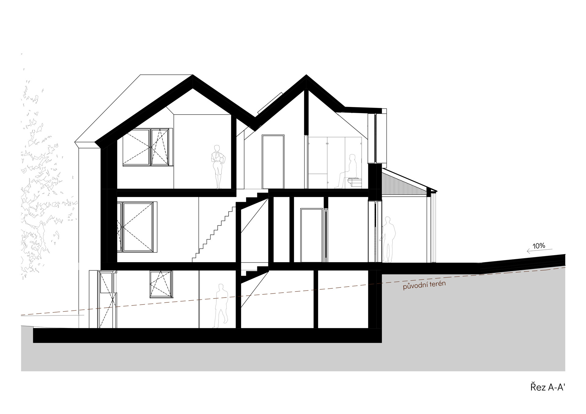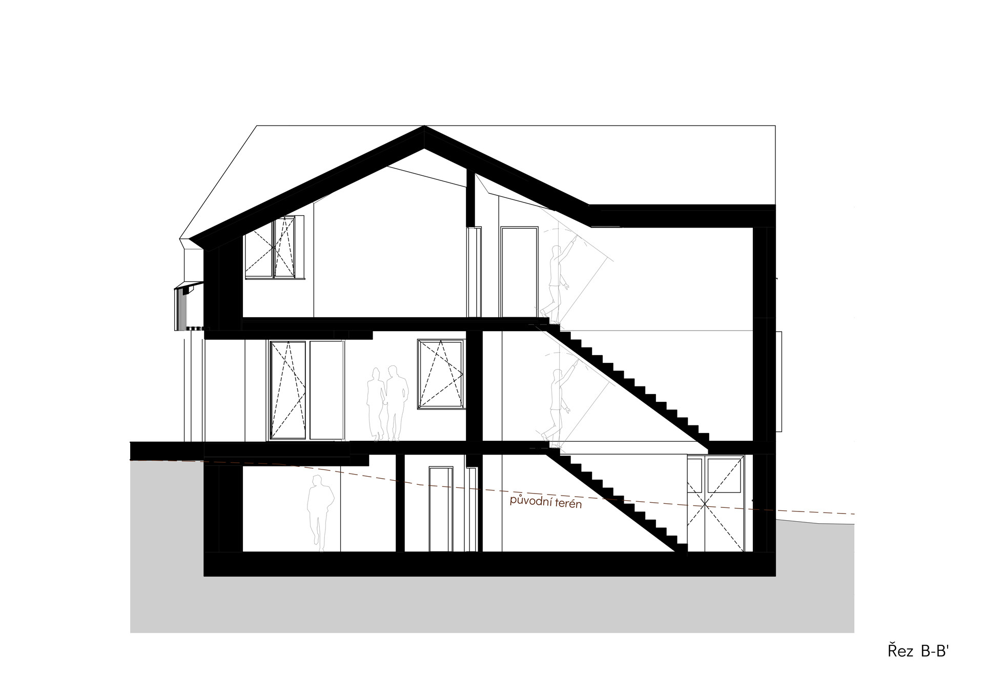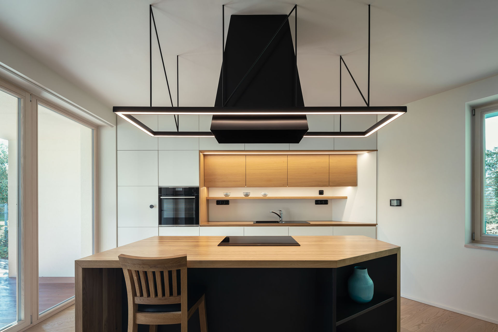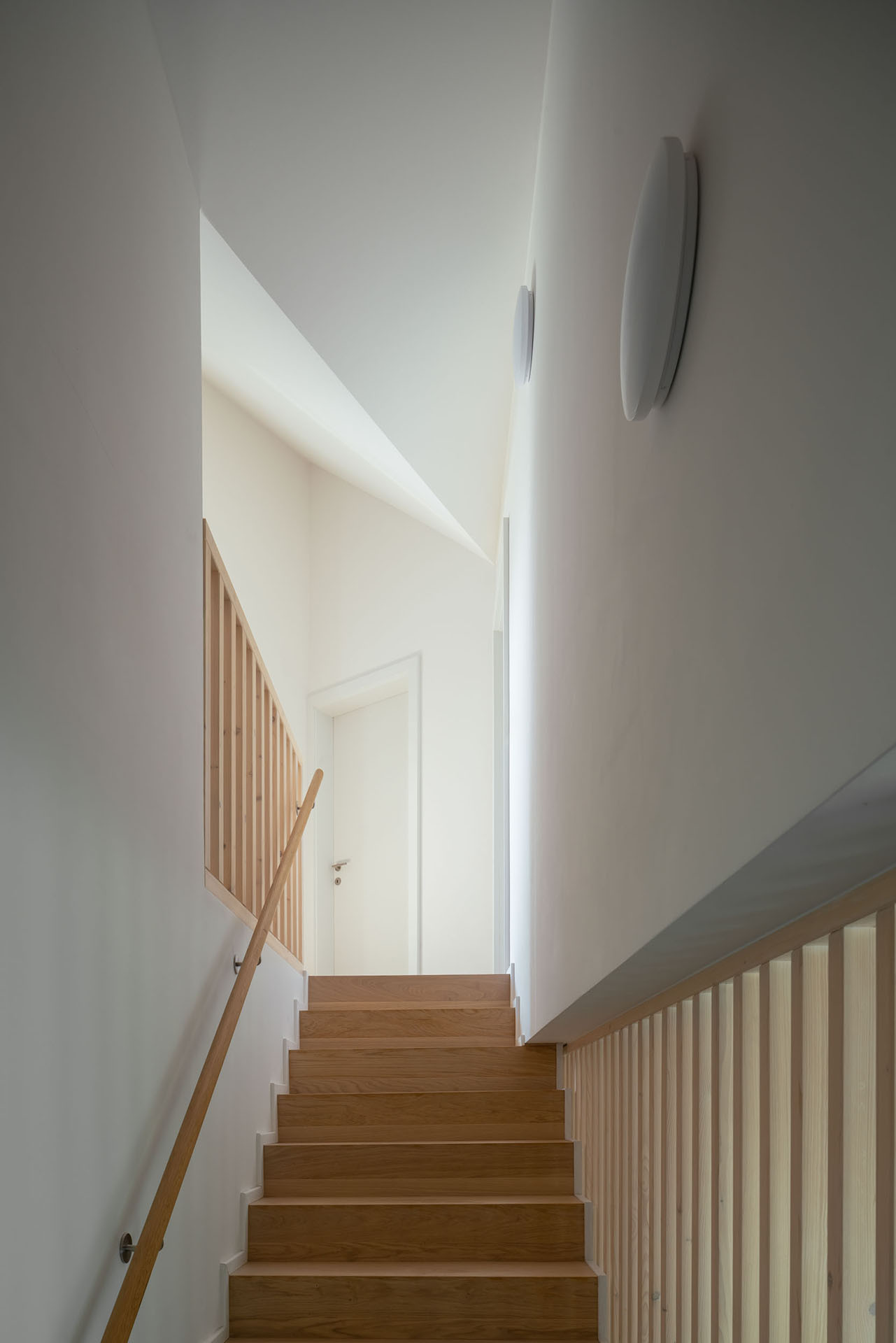 Právě díky rozdělení do dvou křídel působí výsledná stavba opticky menší, než ve skutečnosti je. Zadní křídlo s obývacím pokojem na přízemí zůstává při pohledu z ulice skryté. A obyvatelům domu to dává také více soukromí, hlavní obytné místnosti jsou orientované do krajiny, a na domy sousedů z novostavby obecně směřuje jen jedno okno.