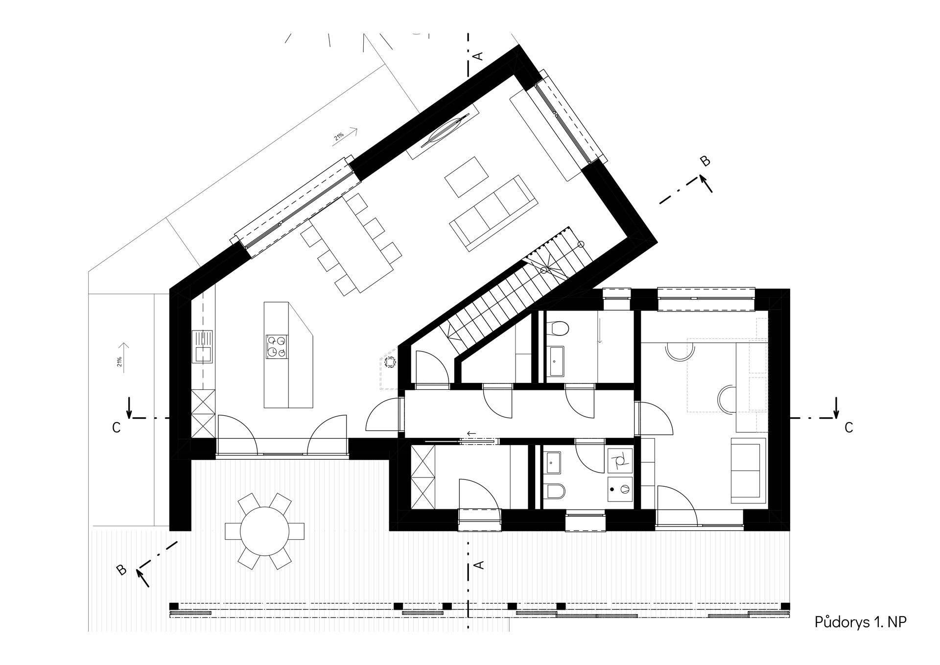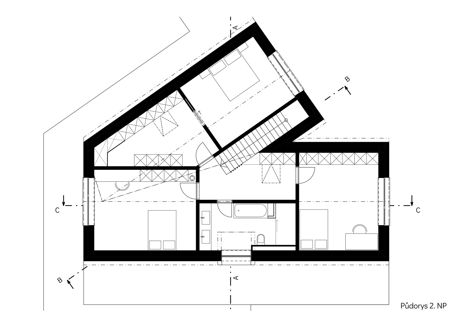 Dům od Chrama tvoří dvě rozevírající se hmoty – každá míří jiným směrem, každá má svou vlastní roli ve vztahu k okolí. Nezvyklý tvar nevznikl čistě z touhy po vizuální originalitě a odlišení se. Naopak – záměrem architektů bylo, aby dům dobře zapadl do místního kontextu. Jedno křídlo je vidět z obecní komunikace a druhé ze zadní části zahrady, na kterou pak navazují louky a les.