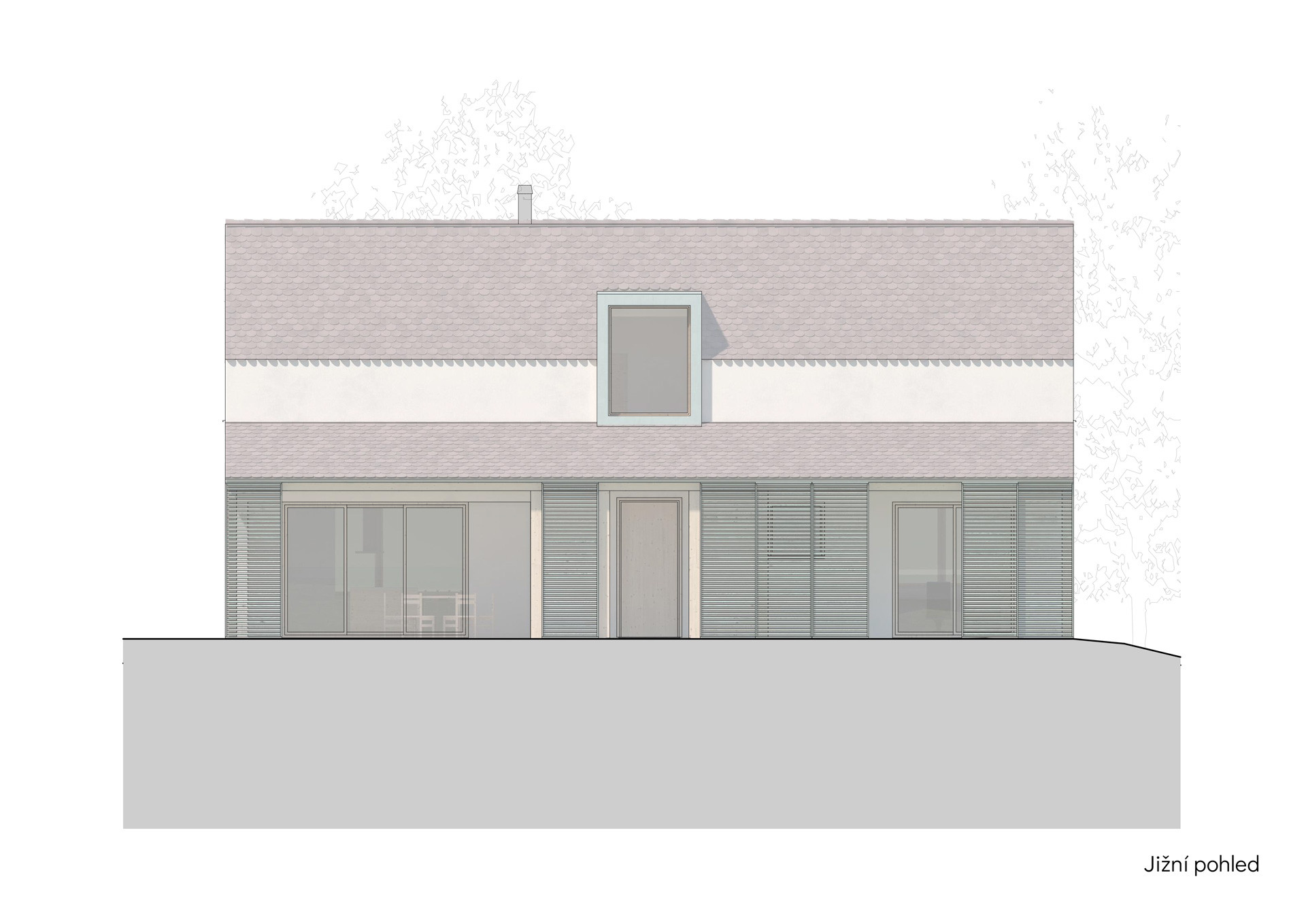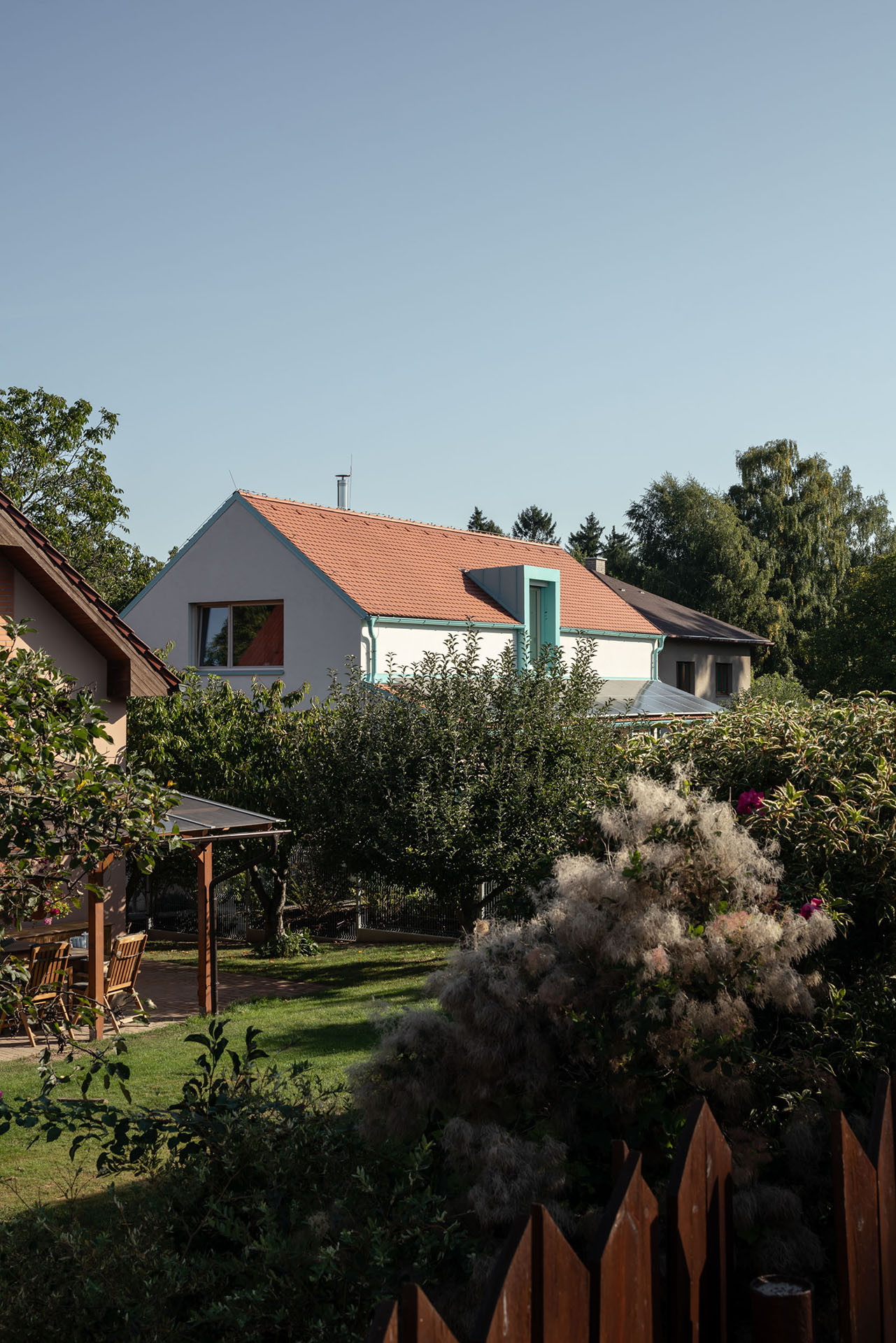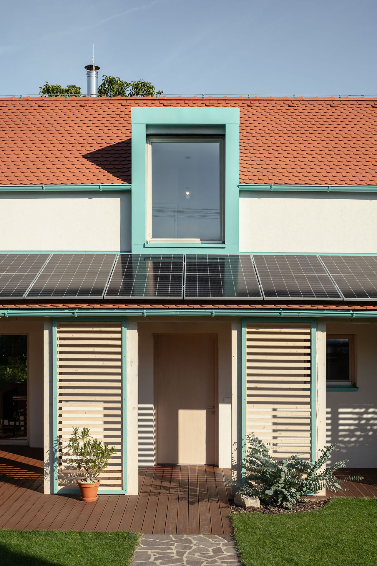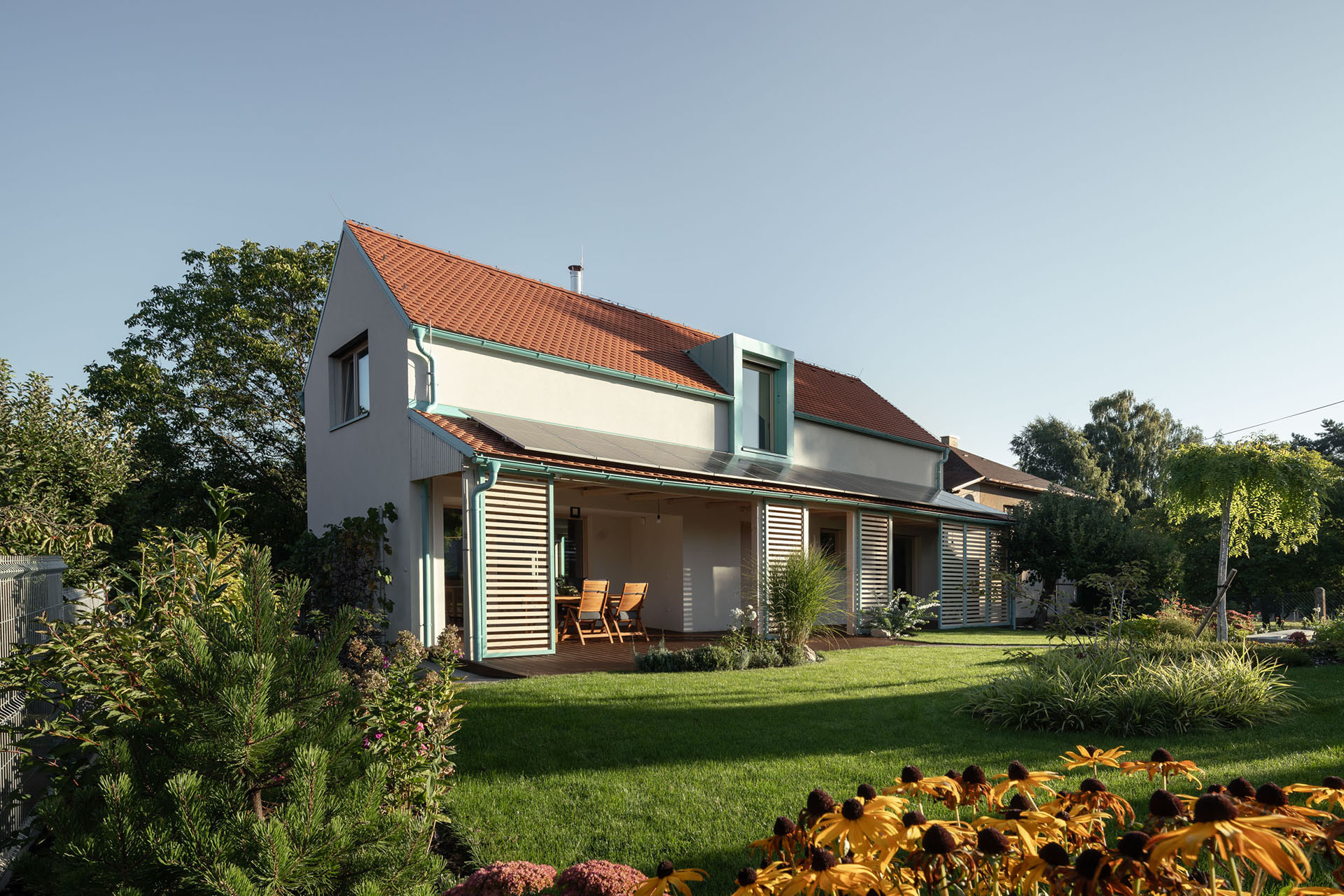 Při pohledu z ulice je dům kompaktní, do přední části pobytové zahrady směřuje terasou. Přestože se obrací k veřejnému prostoru, díky chytrému návrhu poskytuje dostatek soukromí. Terasa je zastřešená a částečně ji kryjí slunolamy, což současně zabraňuje přílišnému přehřívání interiéru za letních hork.