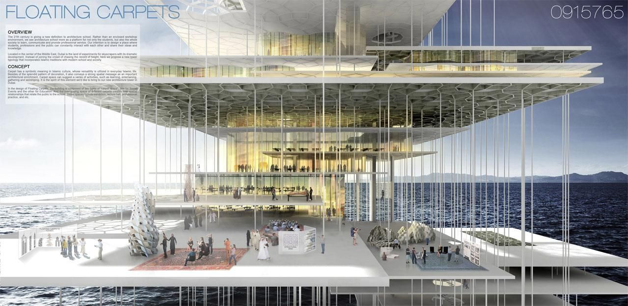 V dalším oceněném projektu je hlavním motivem koberec jakožto symbol islámské společnosti, který se zde promítá do návrhu jednotlivých horizontálních úrovních architektonické věže.