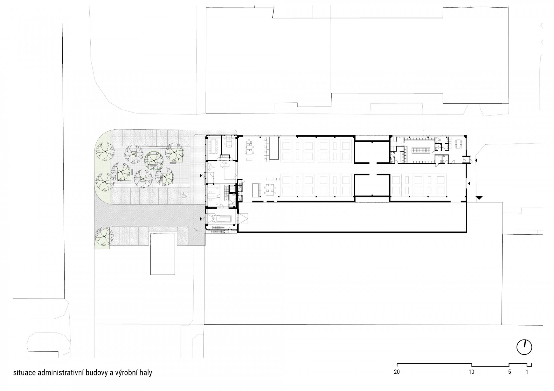 Výrobní a administrativní objekt firmy Pilana Karbid v Hulíně, Ellement architects, situace administrativní budovy a výrobní haly