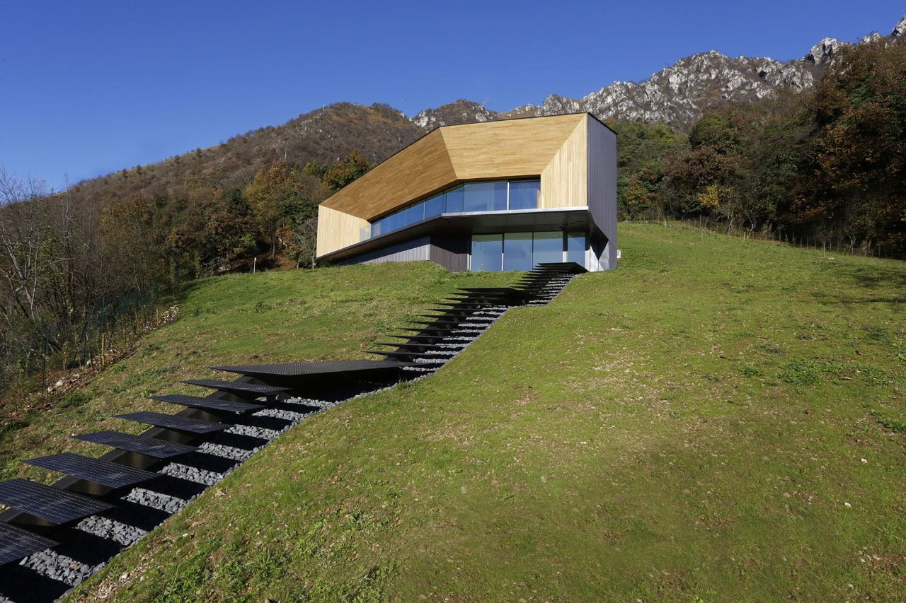 Garáž spojuje s obývacím prostorem výtah. Technické a servisní prostory se nacházejí v suterénu. Dům vypadá, že patří do krajiny, nejsou zde žádné nepřírodní prvky kromě vysunutého schodiště, prořezávajícího travnatý svah. Objekt má geotermální systém tepelného čerpadla a ventilované stěny, vytvářející přirozené větrání i přes silné stěny (65 cm), které chrání proti chladu i teplu (italské energetické hodnocení je vyšší než "A"). Pomáhají tak vytvořit dům s velmi nízkými náklady na vytápění a s téměř nulovou spotřebou paliva, tedy i bez emisí.