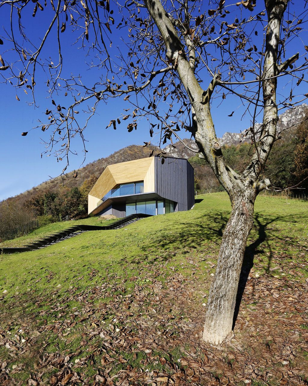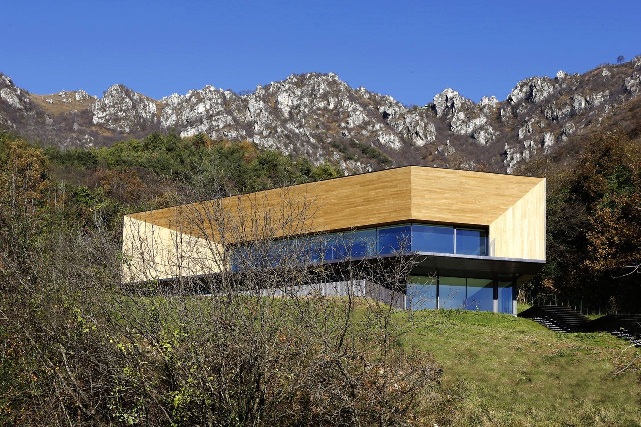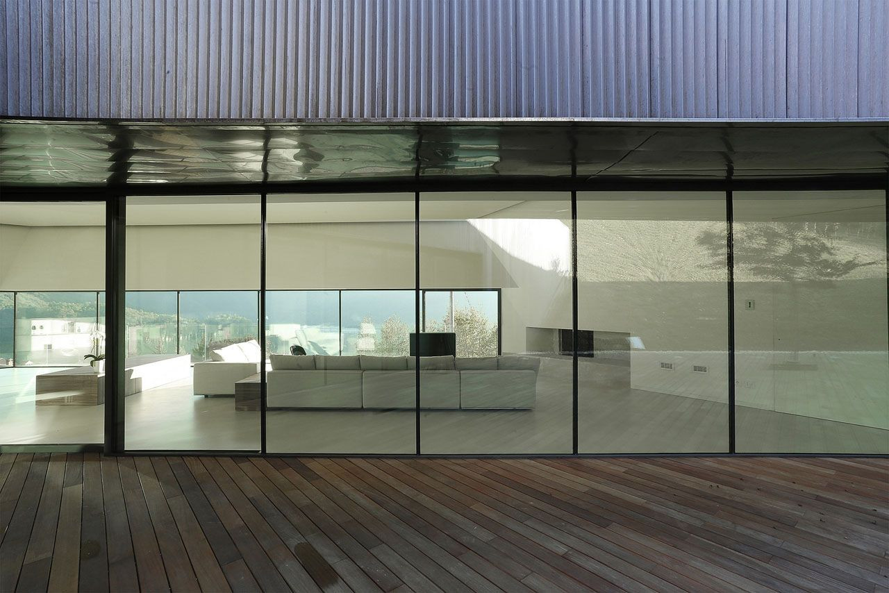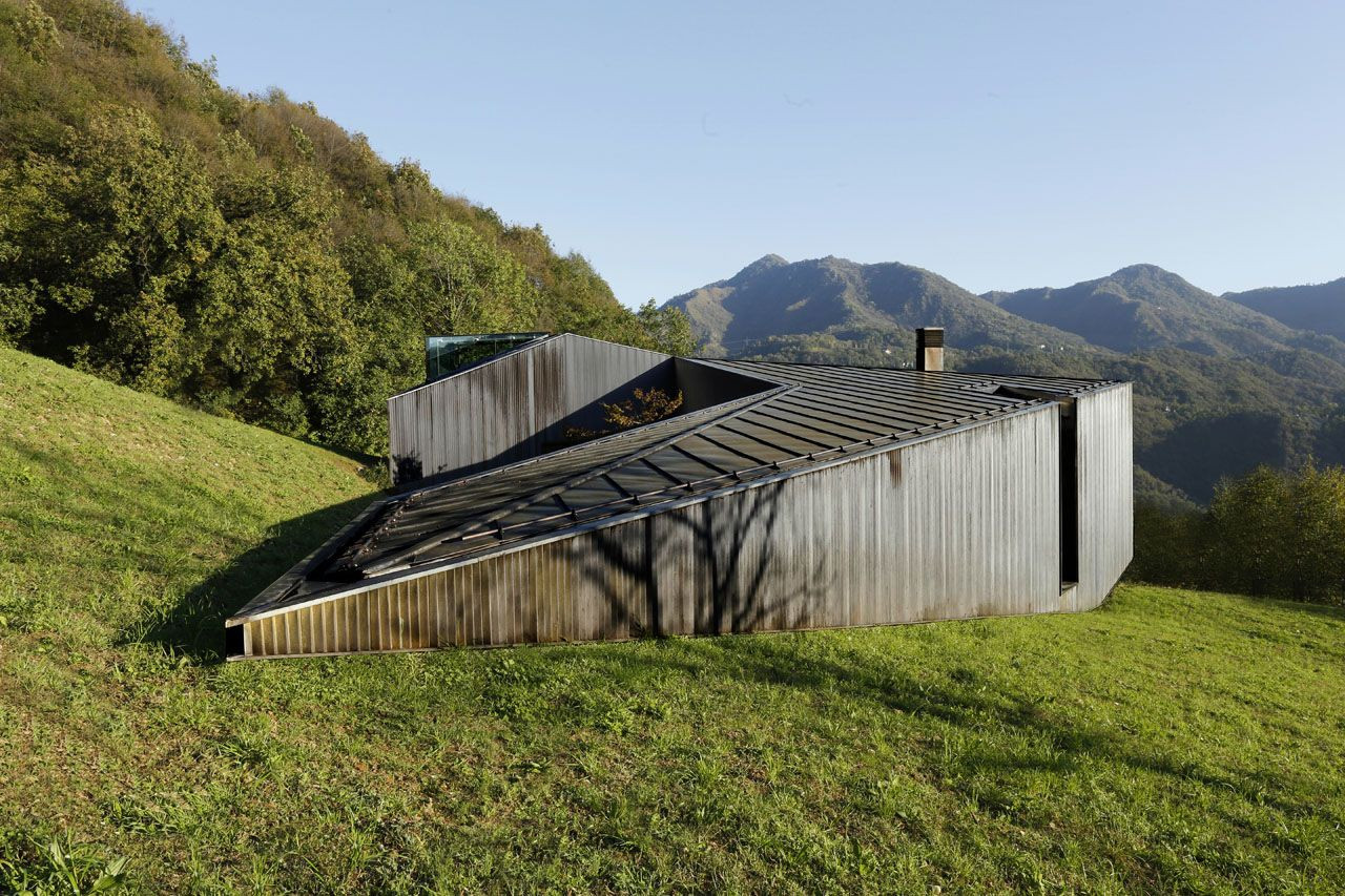 Dům z mědi a dřeva ve tvaru „C“, jenž se zařezává do zeleného úbočí alpského vrcholu, nabízí kromě jedinečných výhledů také nadstandardní bydlení. Rozvržení prostoru umožňuje průchod celou budovou, která je tvořena třemi hmotami.