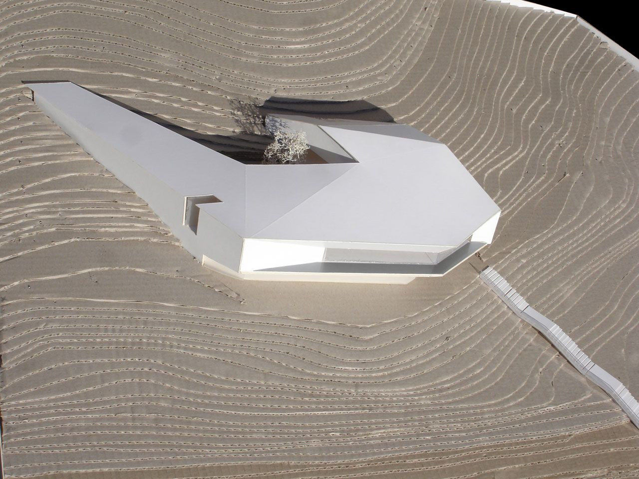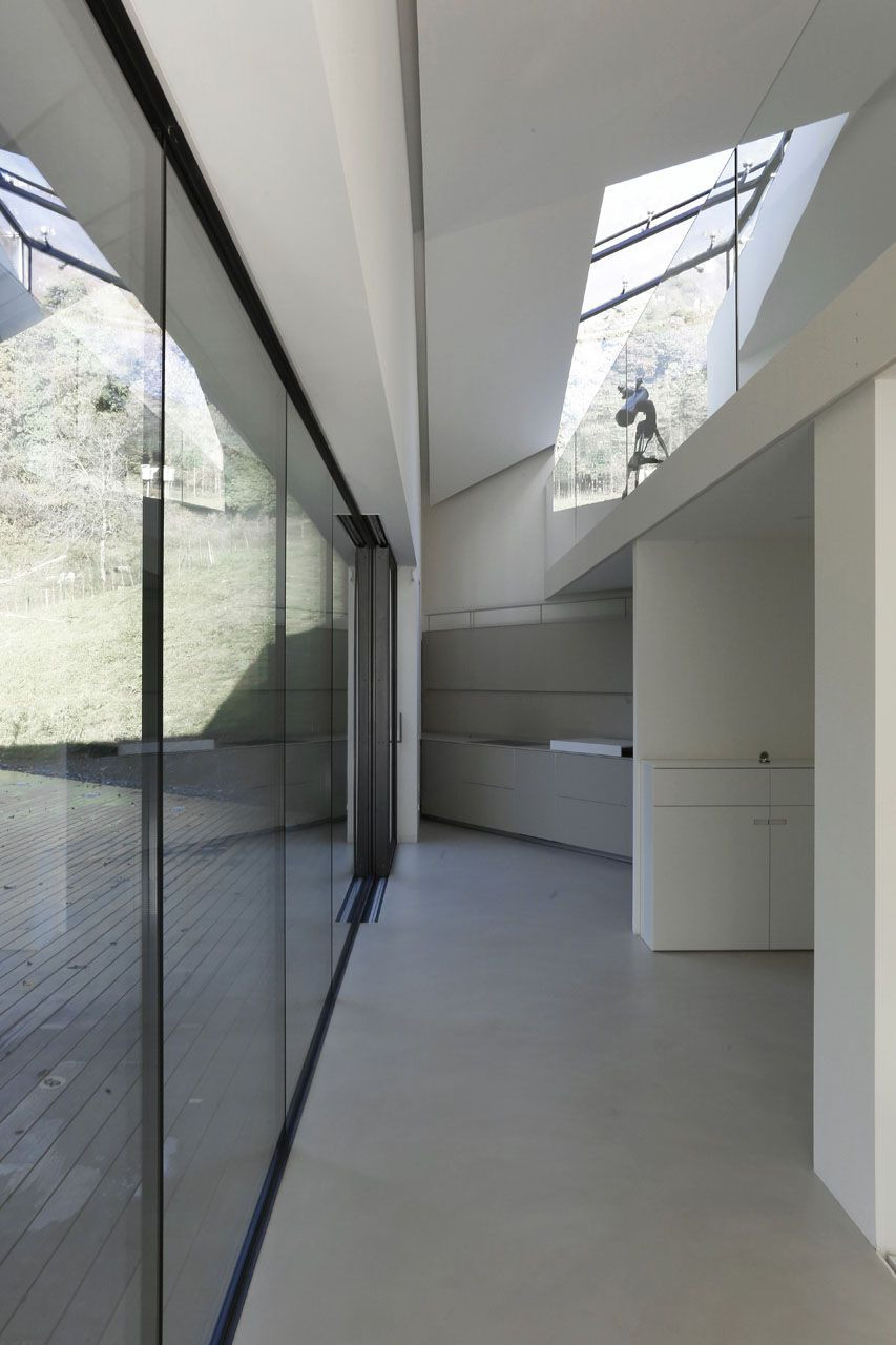 Stavební materiály odrážejí vztah mezi zemí a krajinou: ve svahu severní části pozemku země poskytuje projektu kořeny, takže se zdá, že se dům zařezává do hory. To na jihu, nad převisem, kterým objekt vstupuje do údolí, krajina poskytuje svobodu zejména ve formě výhledu.