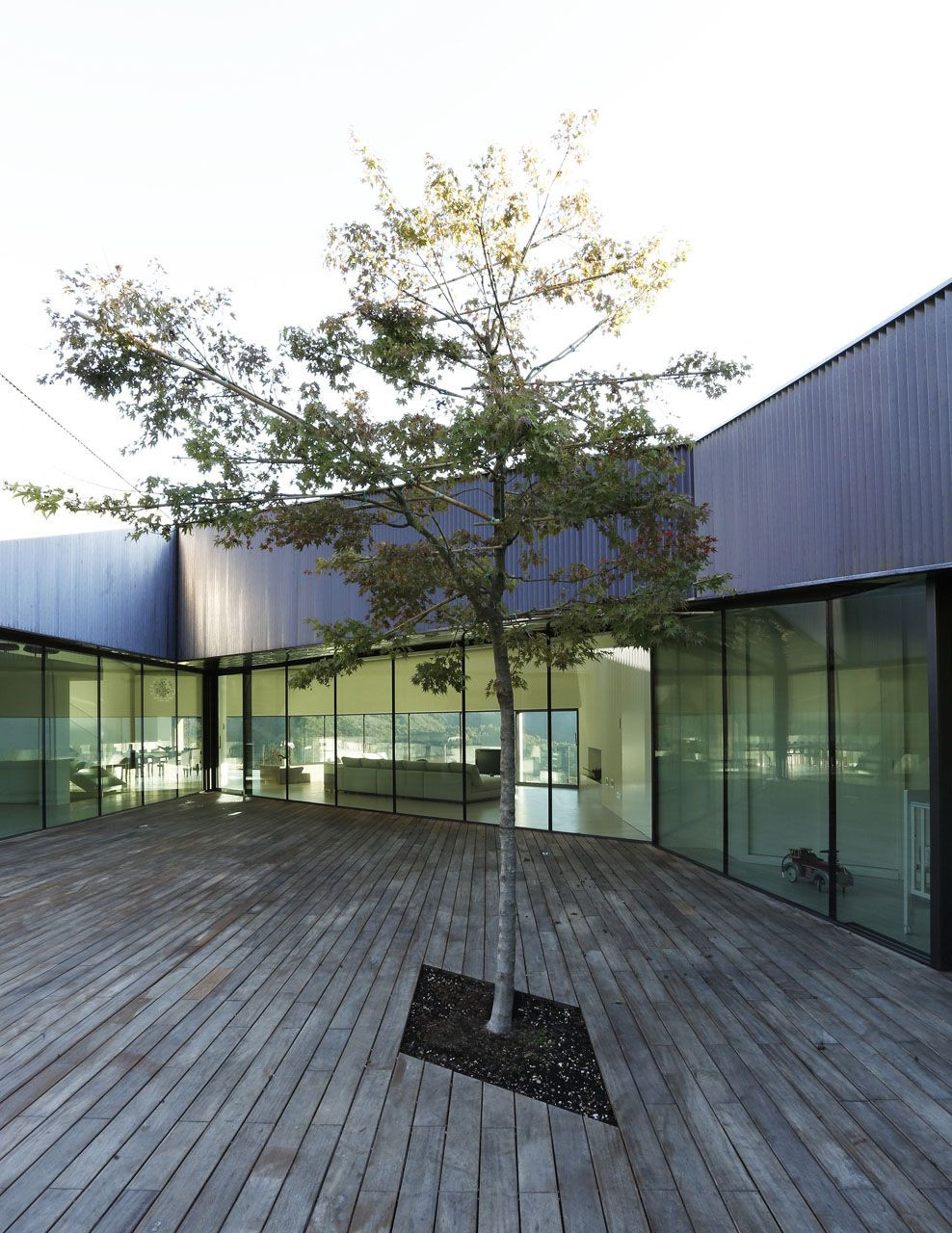 Měď na ventilované stěně je modulována mírným plisováním, rozkmitávajícím světlo na nereflexním povrchu. Dřevo kolem terasy odráží světlo, které se láme od jihu. Podlaha terasy je ze dřeva iroko a velká okna, integrovaná do měděného pláště, definují prostor, který je umocněn zeleným javorem, přinášejícím kus přírody – to jsou také materiály, které vytvářejí srdce domu.