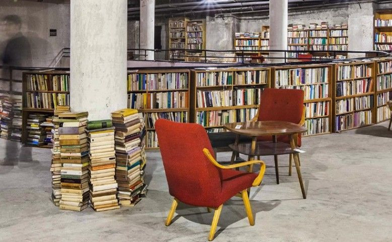 Holé zdi, industriální vzhled, a přece jedinečný prostor. V části, kterou po příchodu člověk uvidí jako první, se nachází knihovny podél všech stěn. O jejich zaplnění se postaral Antikvariát 11. Kuatým průhledem do spodního patra je vidět na skupinu lidí, kteří připravují prostor na večerní akci.