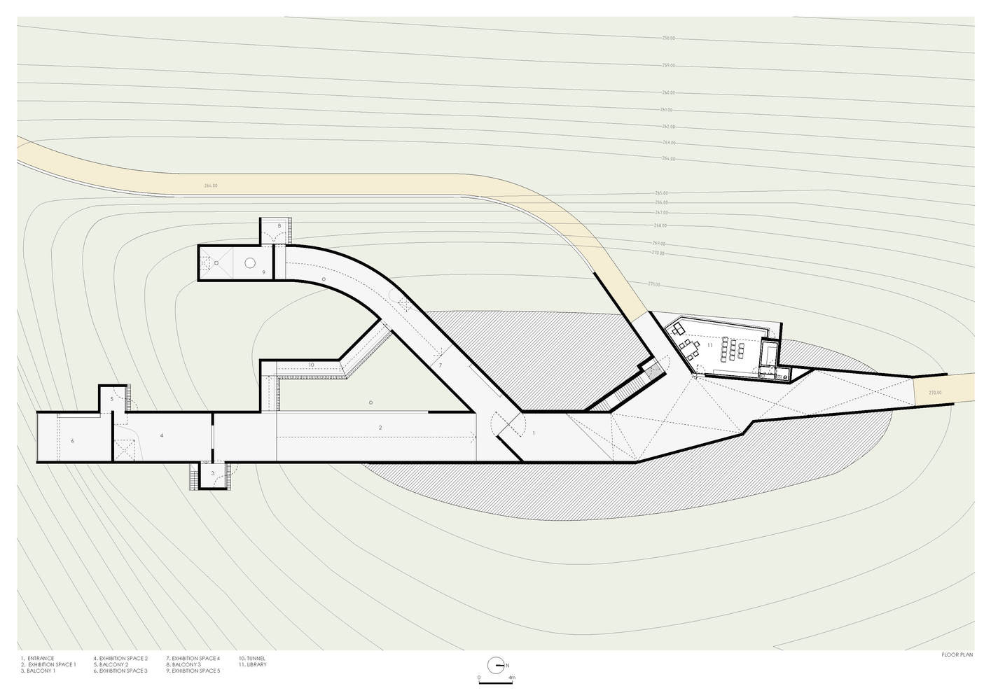 Komplex se skládá ze tří objektů zcela odlišných funkcí i tvarů. Největším z nich je výstavní pavilon s knihovnou umístěný na vyvýšeném pahorku. Jeho netradiční půdorys má tvar podlouhlých, nepravidelně běžících vidlic vzájemně propojených tunelem, jehož drobná (a oproti oběma hlavním ramenům stavby nenápadná) konstrukce vymezuje v centru budovy intimní zelené nádvoří. Chodbové řešení pavilonu návštěvníky zcela pohlcuje. Architektura se stává sochou pracující s hrou stínu a světla, které do interiéru vpouští nepravidelně umístěné okenní otvory prořezané skrz silné stěny betonového monolitu. Proměnlivost přírodního osvětlení hraje v případě jihokorejského projektu zásadní roli – utváří prostor, dramaticky a nepředvídavě může měnit jeho atmosféru. Otevírání se exteriéru vrcholí na konci chodeb, kde architekti navrhli terasy poskytující široký výhled do okolních lesů.