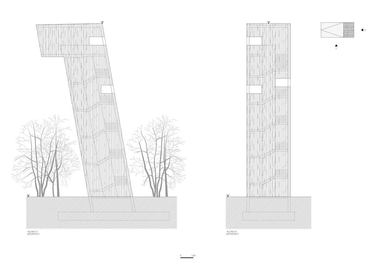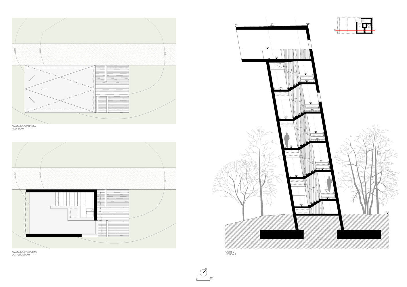 Posledním ze souboru staveb je rozhledna tyčící se nad borovicový les jako periskop ponorky. Při výstupu vzhůru touto nakloněnou konstrukcí je pohled do okolí zprvu možný jen drobnými průzory ve zdi, vpouštějícími do interiéru letmé záblesky denního světla. Na vrcholku se uzavřená vertikální stavba otevírá pomocí jižně orientované terasy, z níž je možno obdivovat panorama horské krajiny.