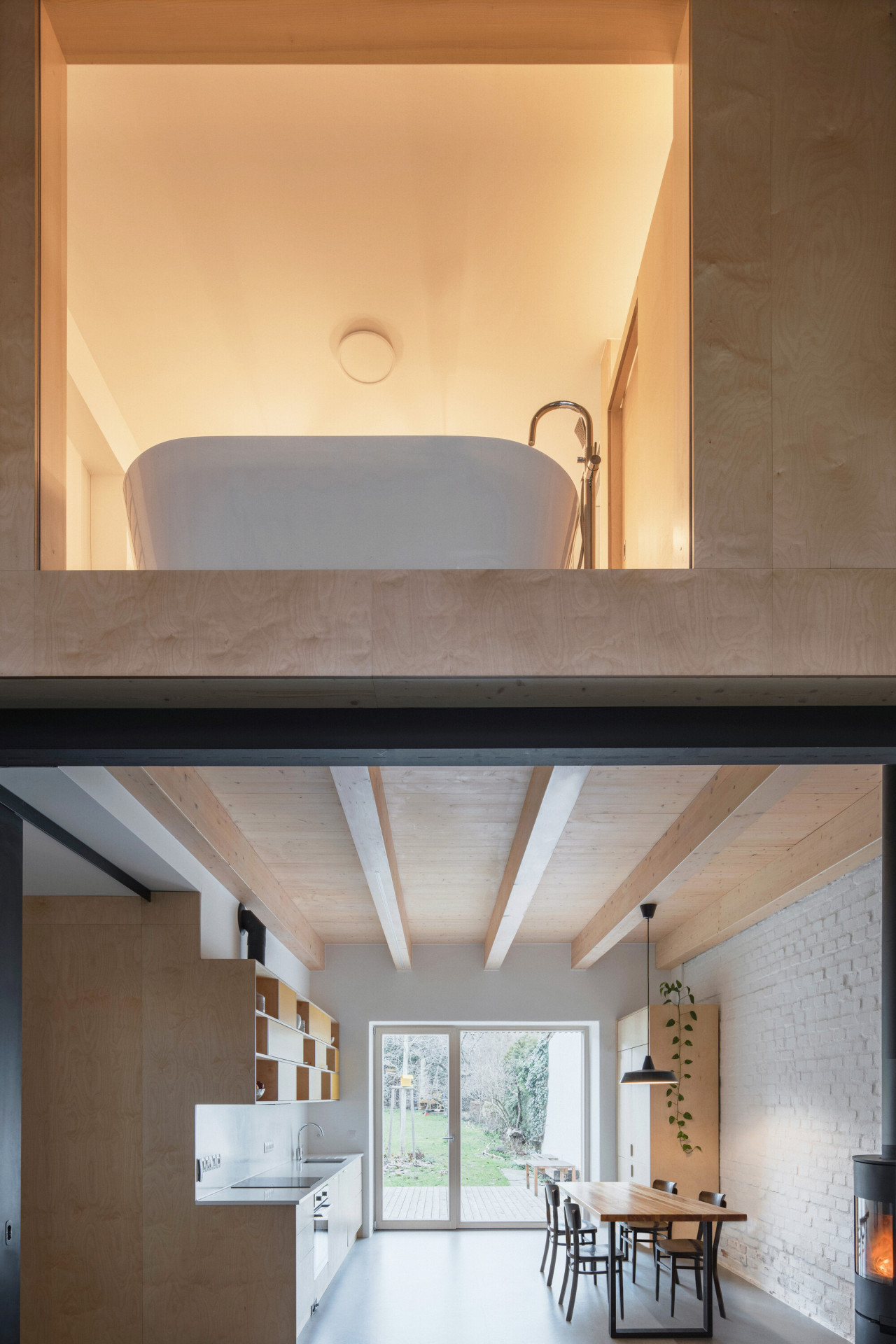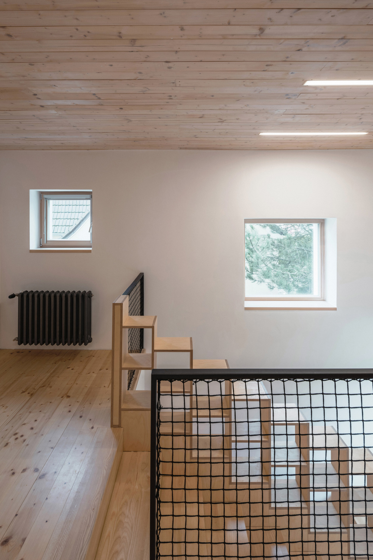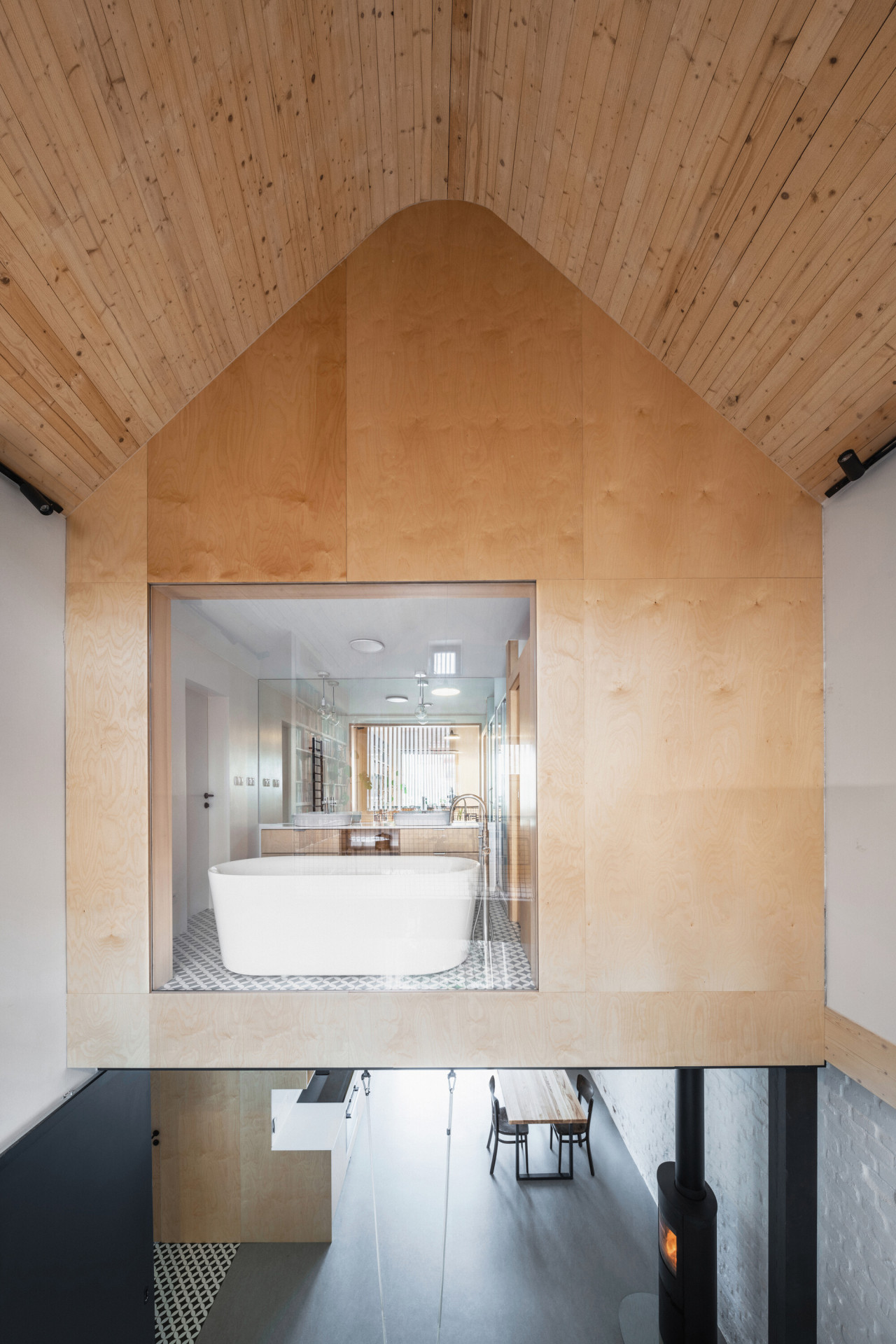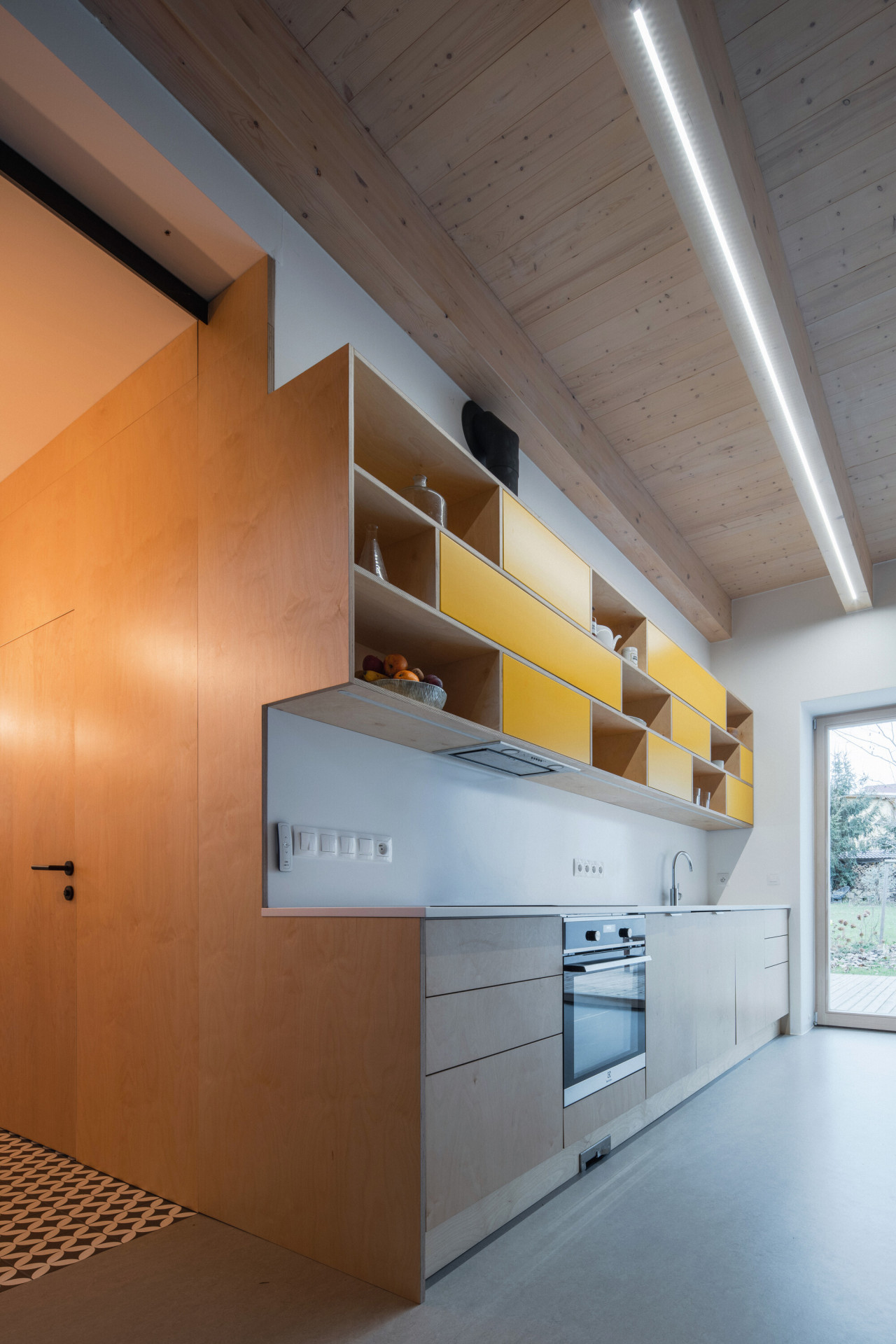 Charakteristickým materiálem pro ztvárnění přístavby se stalo dřevo, to je jak venku, tak vevnitř v interiérech. Je z něj vestavný nábytek, včetně v kuchyně, nejvíce ale upoutá podhled ze smrkových prken. A pak taky obklad stěny koupelny, která visí v převýšeném prostoru nad obývacím pokojem. Z toho je vidět až do štítu, prostorové souvislosti jsou v domě netradiční. Zvenčí je tomu naopak, záměrně, autoři totiž říkají, že chtěli dojít umírněného výsledku. To se jim podařilo, výsledek je ale současně zábavný a když projdete kolem, všimnete si ho.
