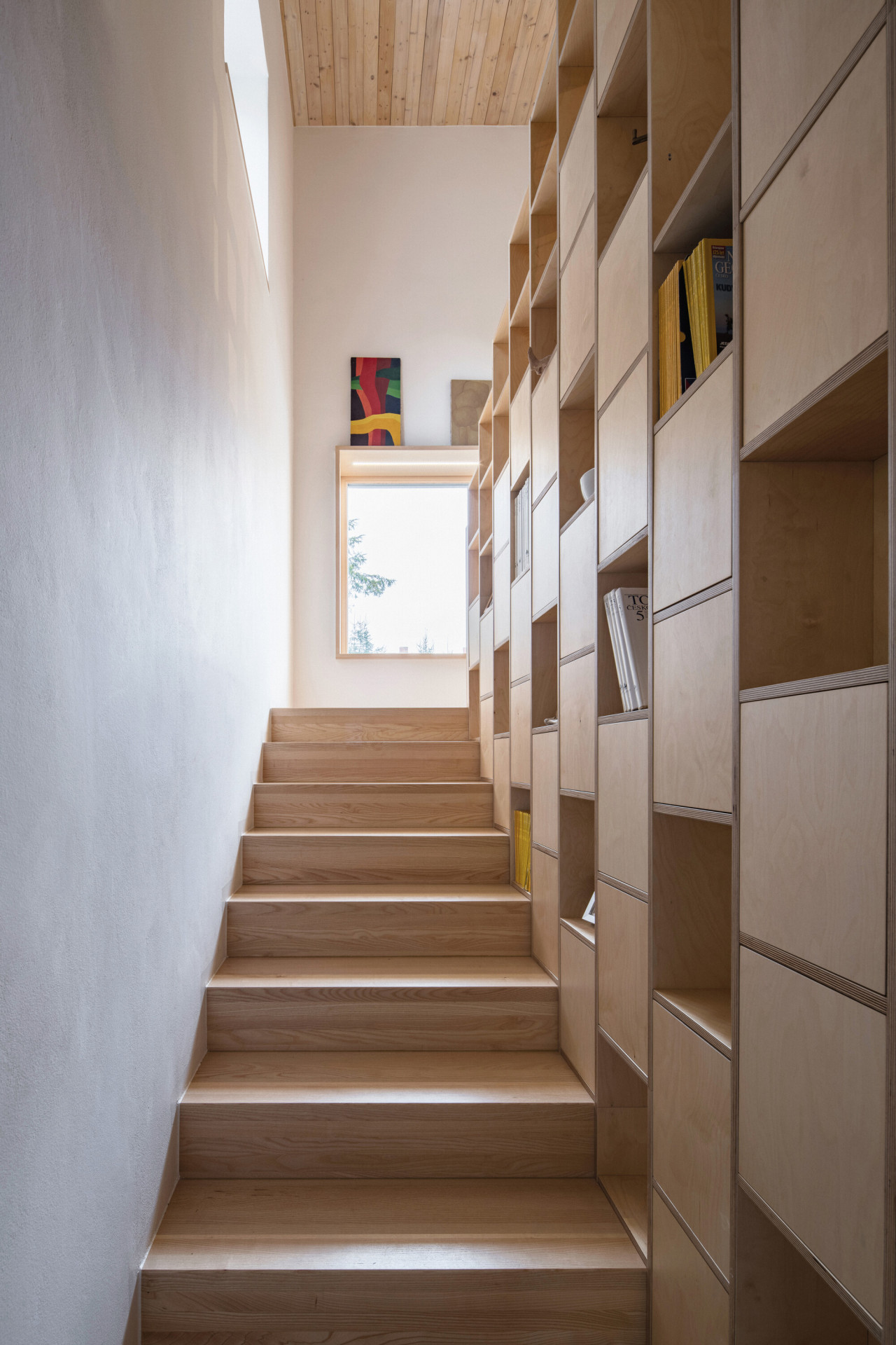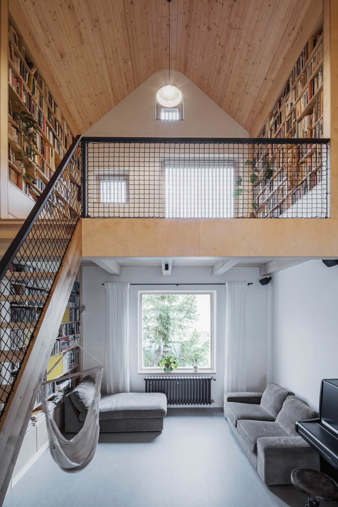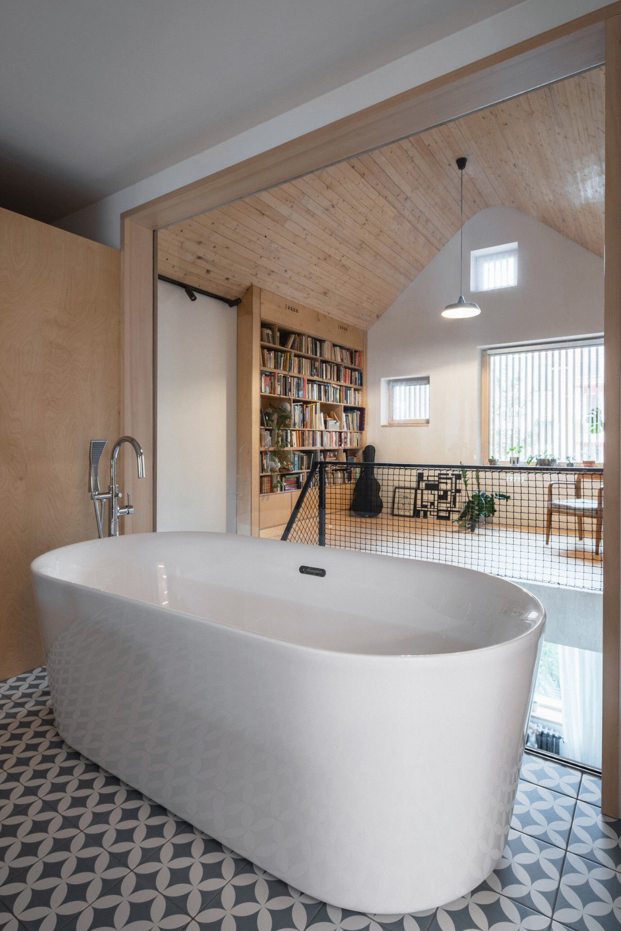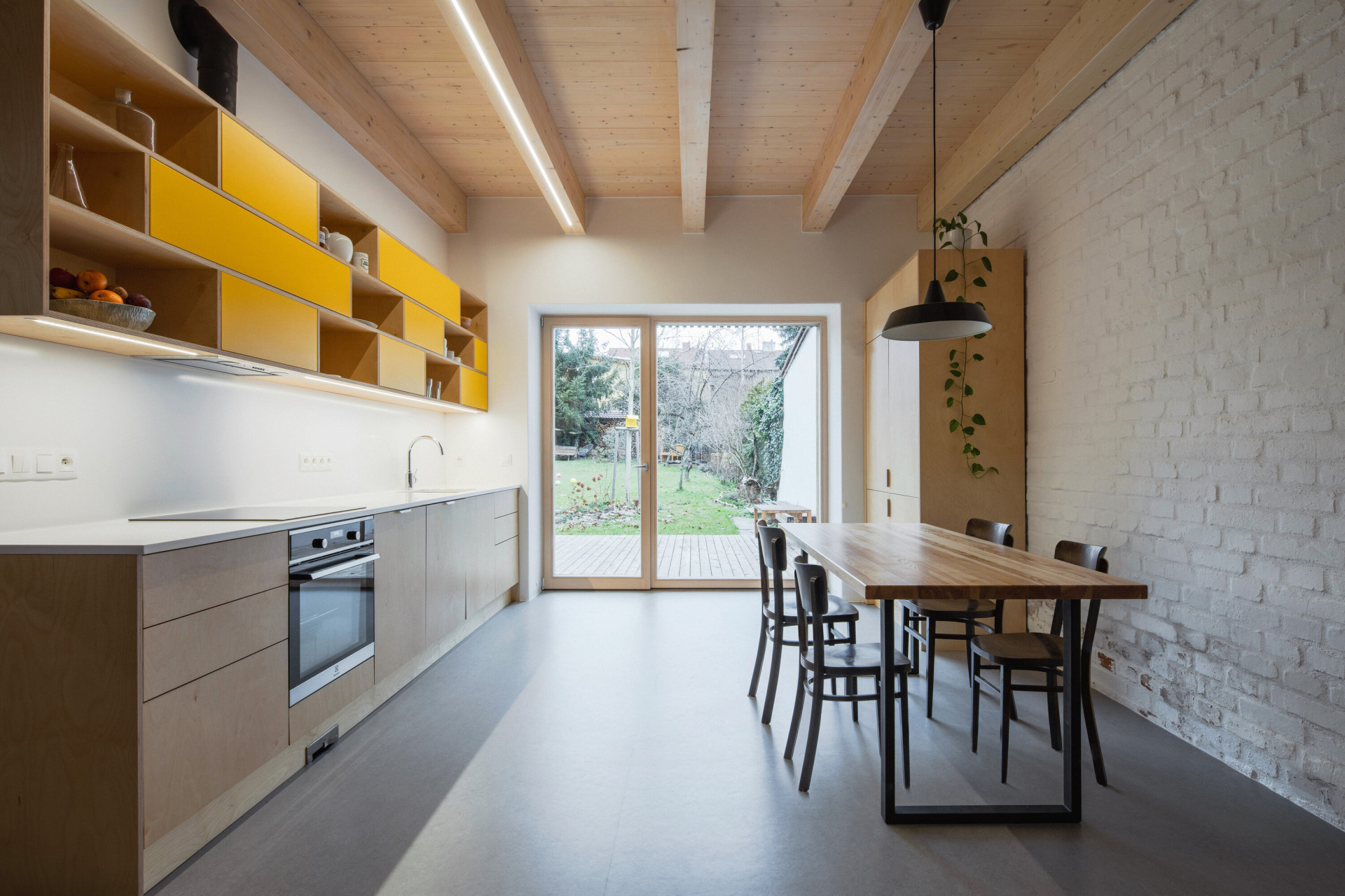 Charakteristickým materiálem pro ztvárnění přístavby se stalo dřevo, to je jak venku, tak vevnitř v interiérech. Je z něj vestavný nábytek, včetně v kuchyně, nejvíce ale upoutá podhled ze smrkových prken. A pak taky obklad stěny koupelny, která visí v převýšeném prostoru nad obývacím pokojem. Z toho je vidět až do štítu, prostorové souvislosti jsou v domě netradiční. Zvenčí je tomu naopak, záměrně, autoři totiž říkají, že chtěli dojít umírněného výsledku. To se jim podařilo, výsledek je ale současně zábavný a když projdete kolem, všimnete si ho.