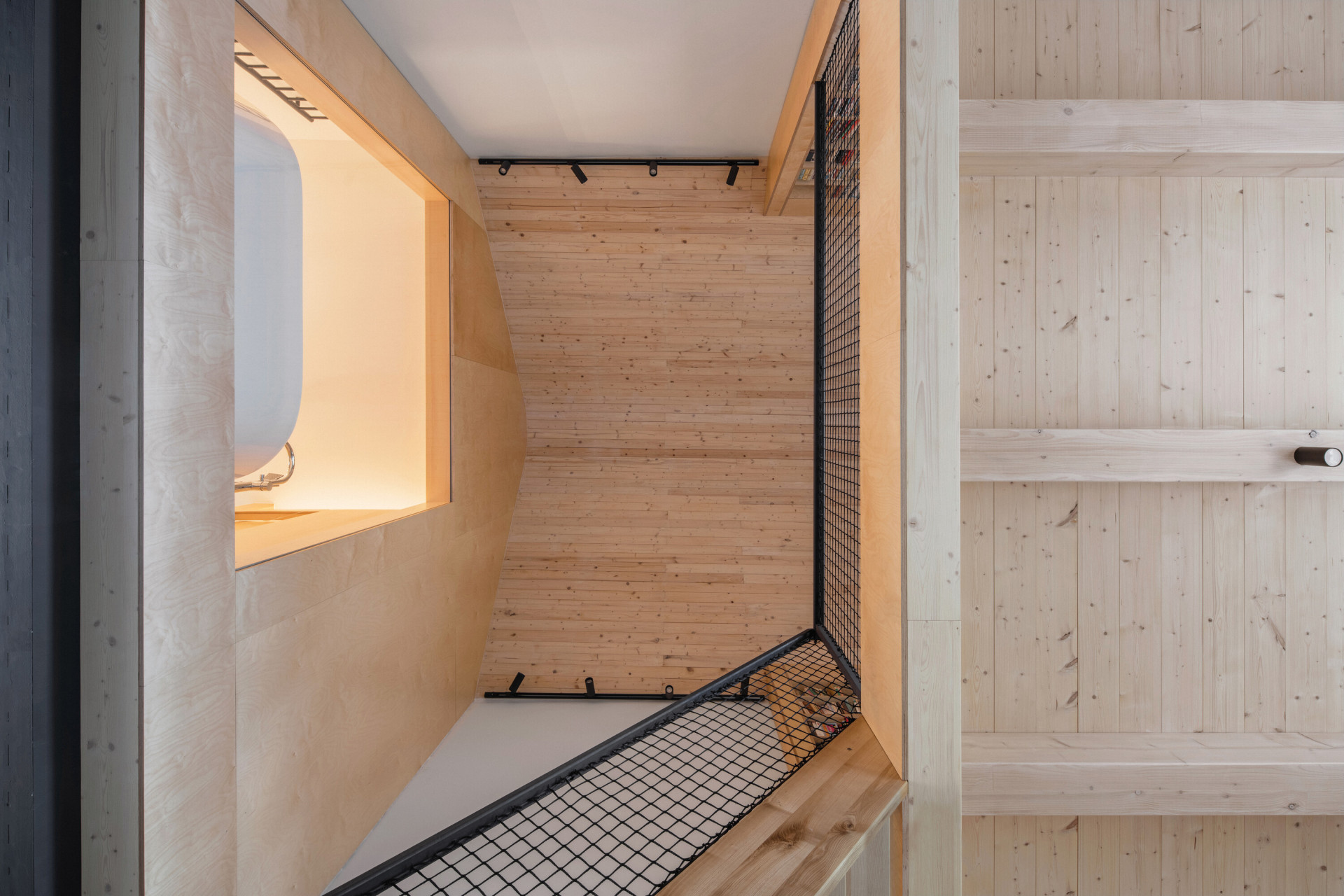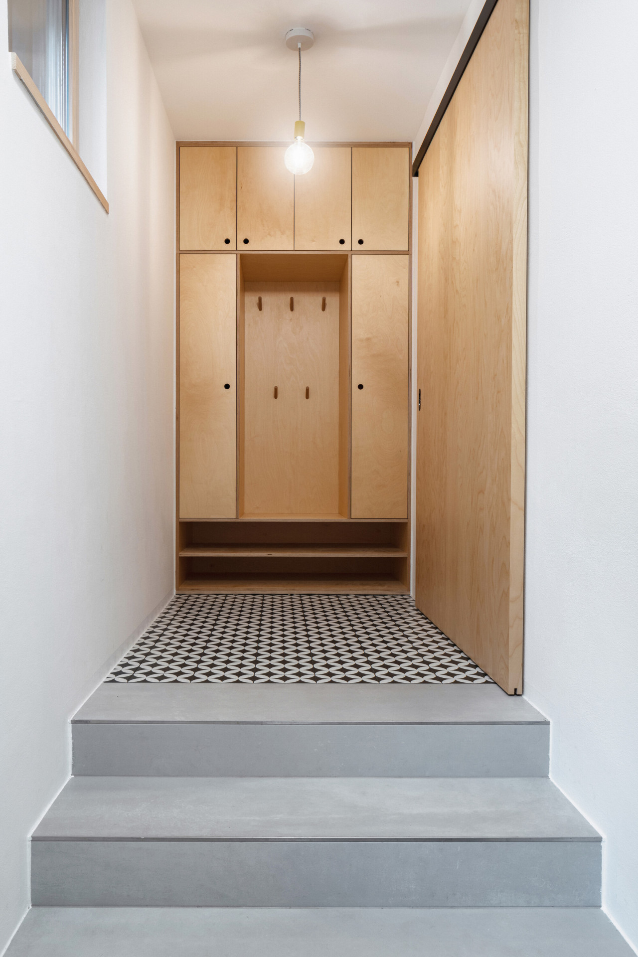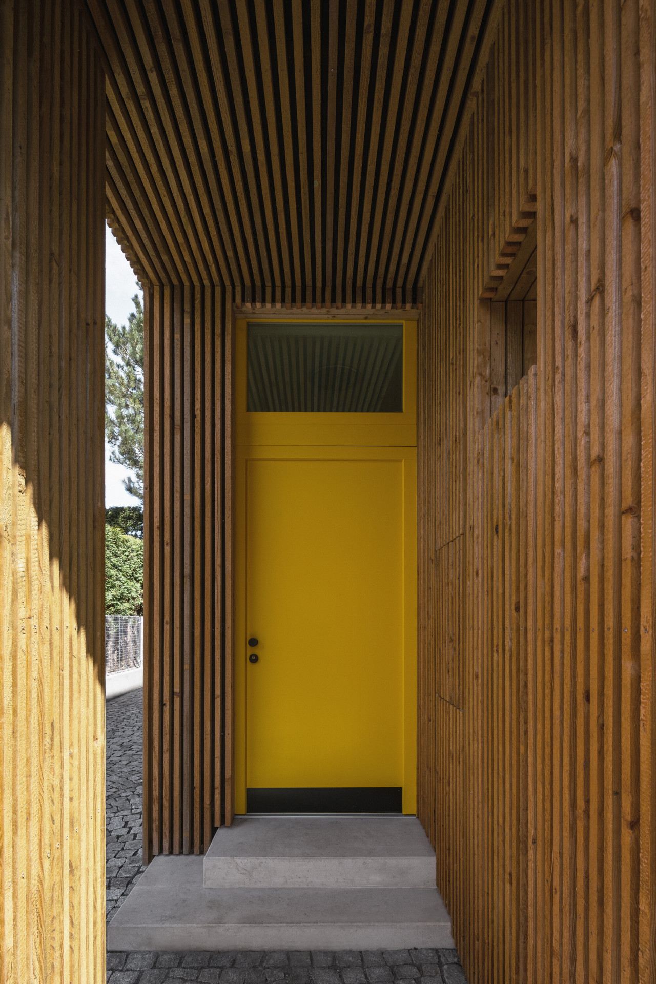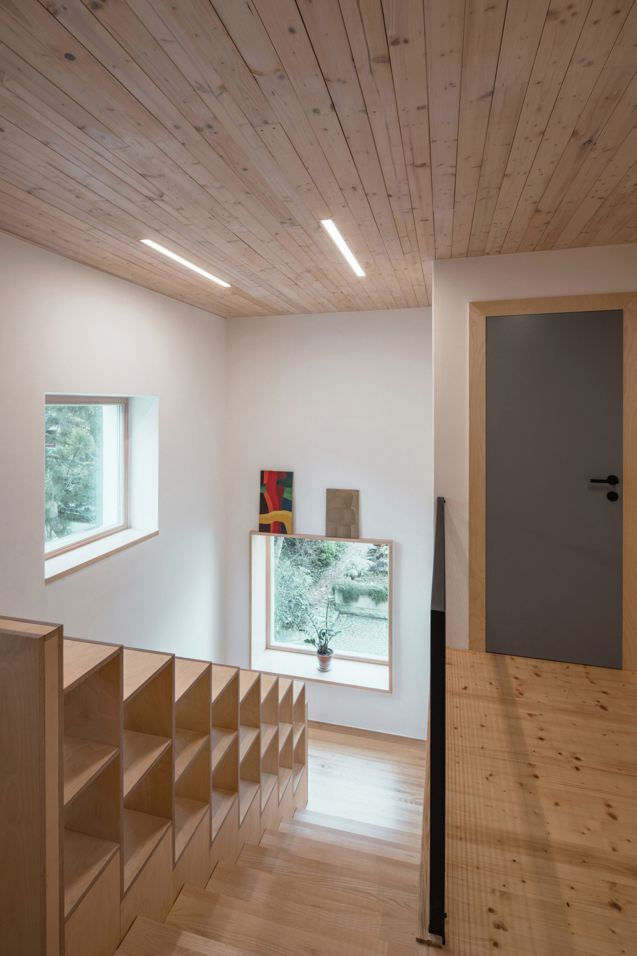Charakteristickým materiálem pro ztvárnění přístavby se stalo dřevo, to je jak venku, tak vevnitř v interiérech. Je z něj vestavný nábytek, včetně v kuchyně, nejvíce ale upoutá podhled ze smrkových prken. A pak taky obklad stěny koupelny, která visí v převýšeném prostoru nad obývacím pokojem. Z toho je vidět až do štítu, prostorové souvislosti jsou v domě netradiční. Zvenčí je tomu naopak, záměrně, autoři totiž říkají, že chtěli dojít umírněného výsledku. To se jim podařilo, výsledek je ale současně zábavný a když projdete kolem, všimnete si ho.