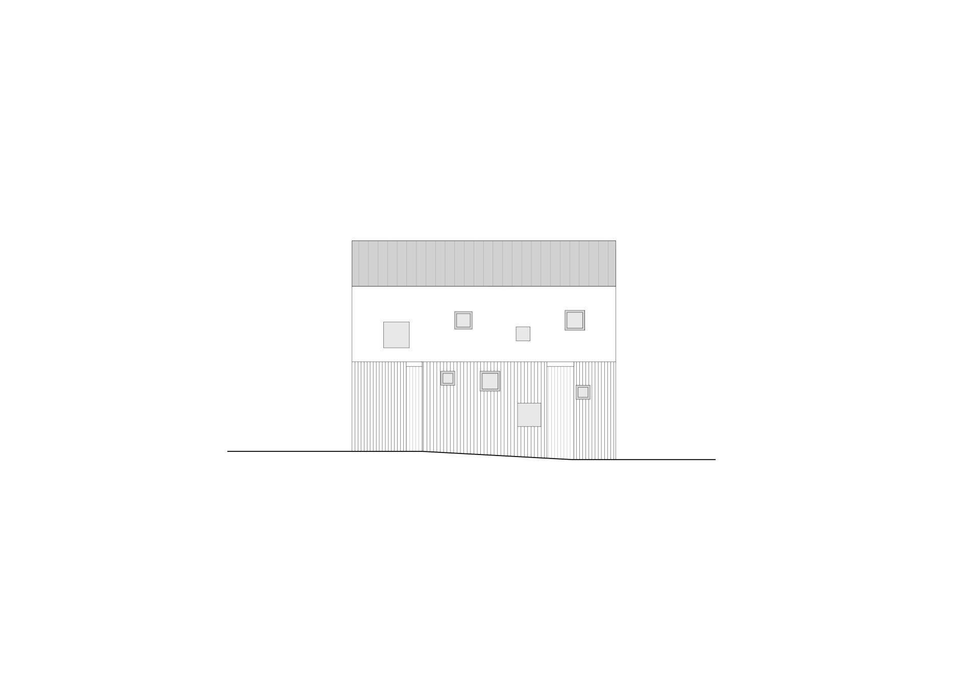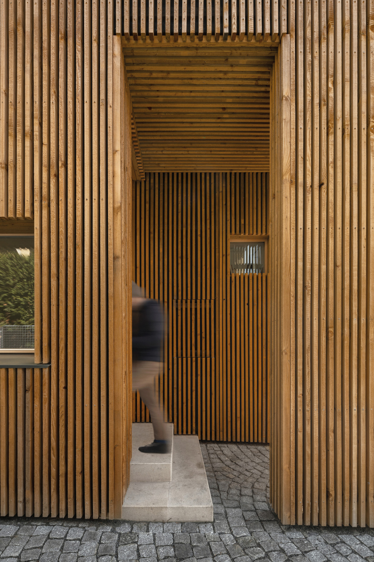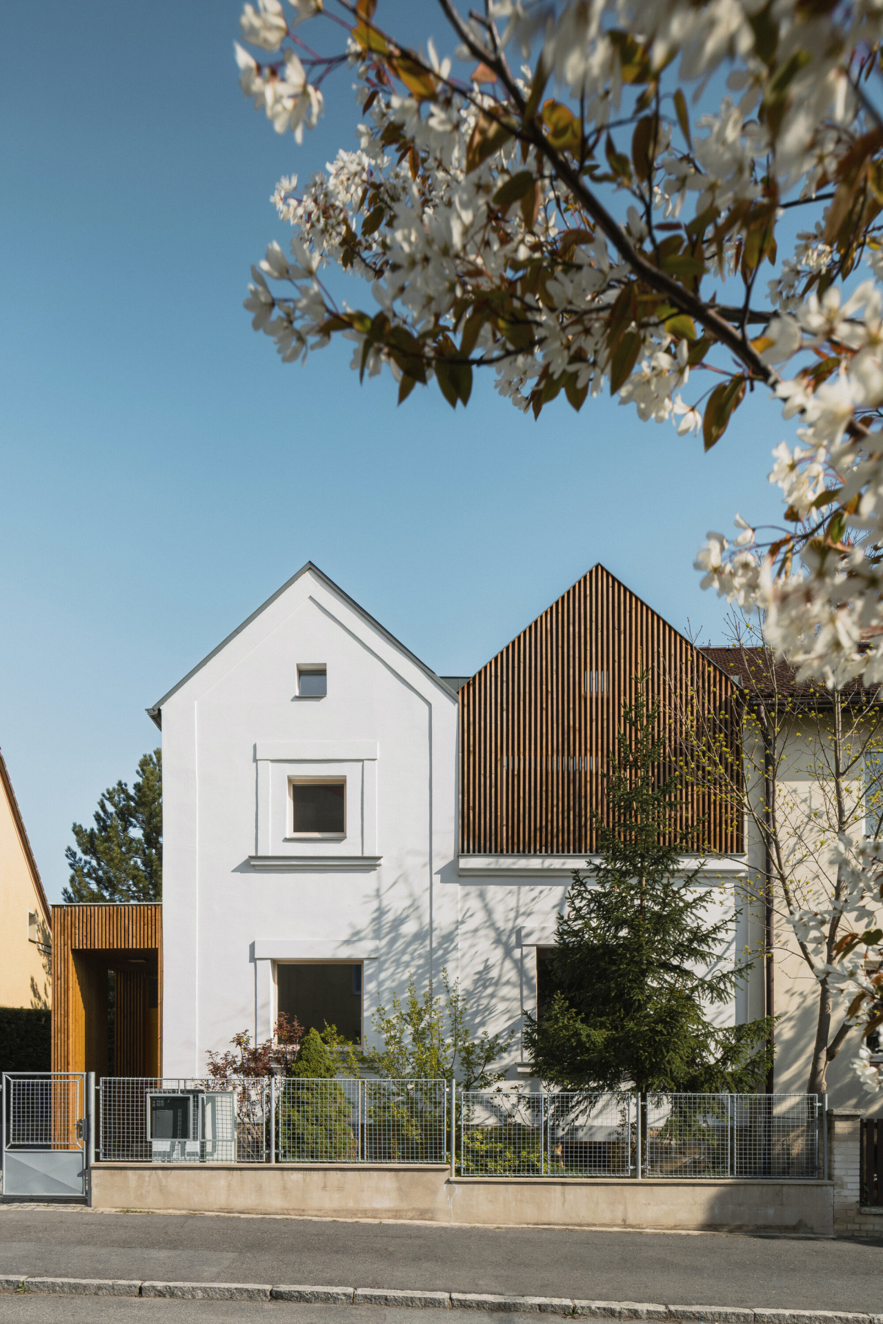 Dům má dva štíty, jeden původní, bíle omítnutý s okýnkem ve středu, druhý s fasádou z dřevěných latí. Od původní hmoty je tak na první pohled odlišitelný, což pro autory bylo důležité. „Co je původní, návrh přiznává a co je nové, není replikou, ale je nově pojaté,“ říkají Tereza Nová a Jiří Zábrana z ateliéru PRO-STORY.