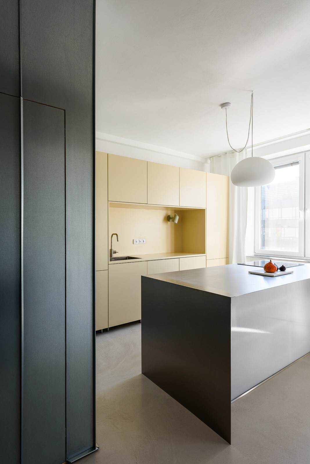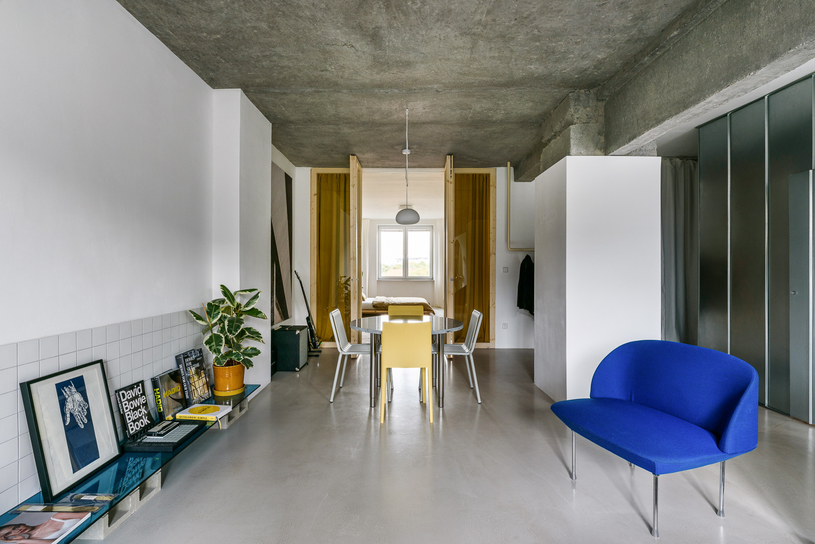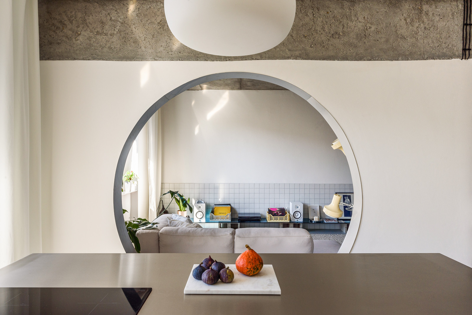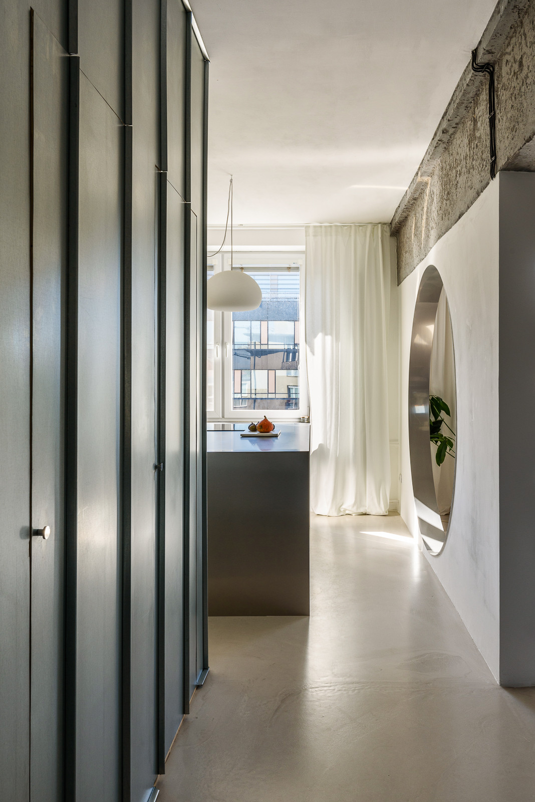 Nový interiér bytu na nejstarším bratislavském sídlišti z 50. let zaujme svou otevřenou dispozicí. Slovenský architekt Alan Prekop radikálně zasáhl do původního půdorysu třípokojového bytu a zanechal v něm pouze nosné zdi. Jediným dělícím prvkem je dřevěná konstrukce s prosklenými výplněmi a stěna s kruhovým průhledem, díky němuž se opticky propojuje kuchyň s obývacím pokojem. V interiéru získal hlavní slovo kov, nerezový kuchyňský bar a parapety doplňují dveře obložené pozinkovaným plechem. Aby architekt ještě více posílil pocit z otevřeného prostoru, zvolil místo vestavěného nábytku volně stojící.