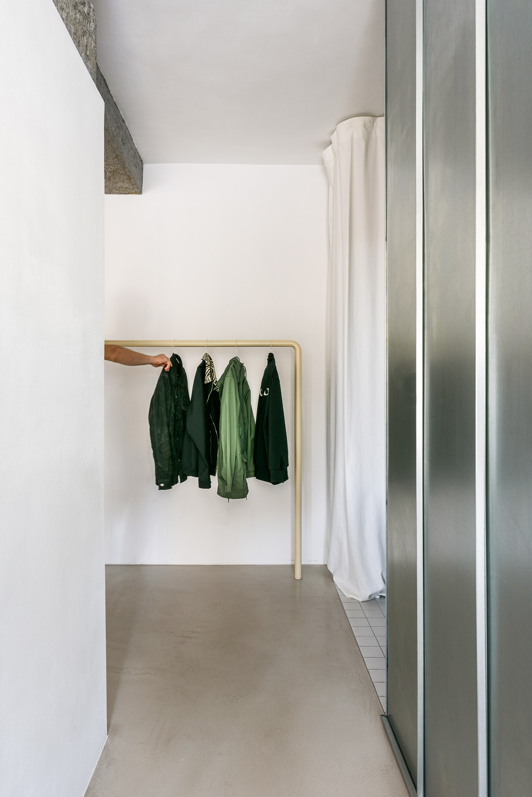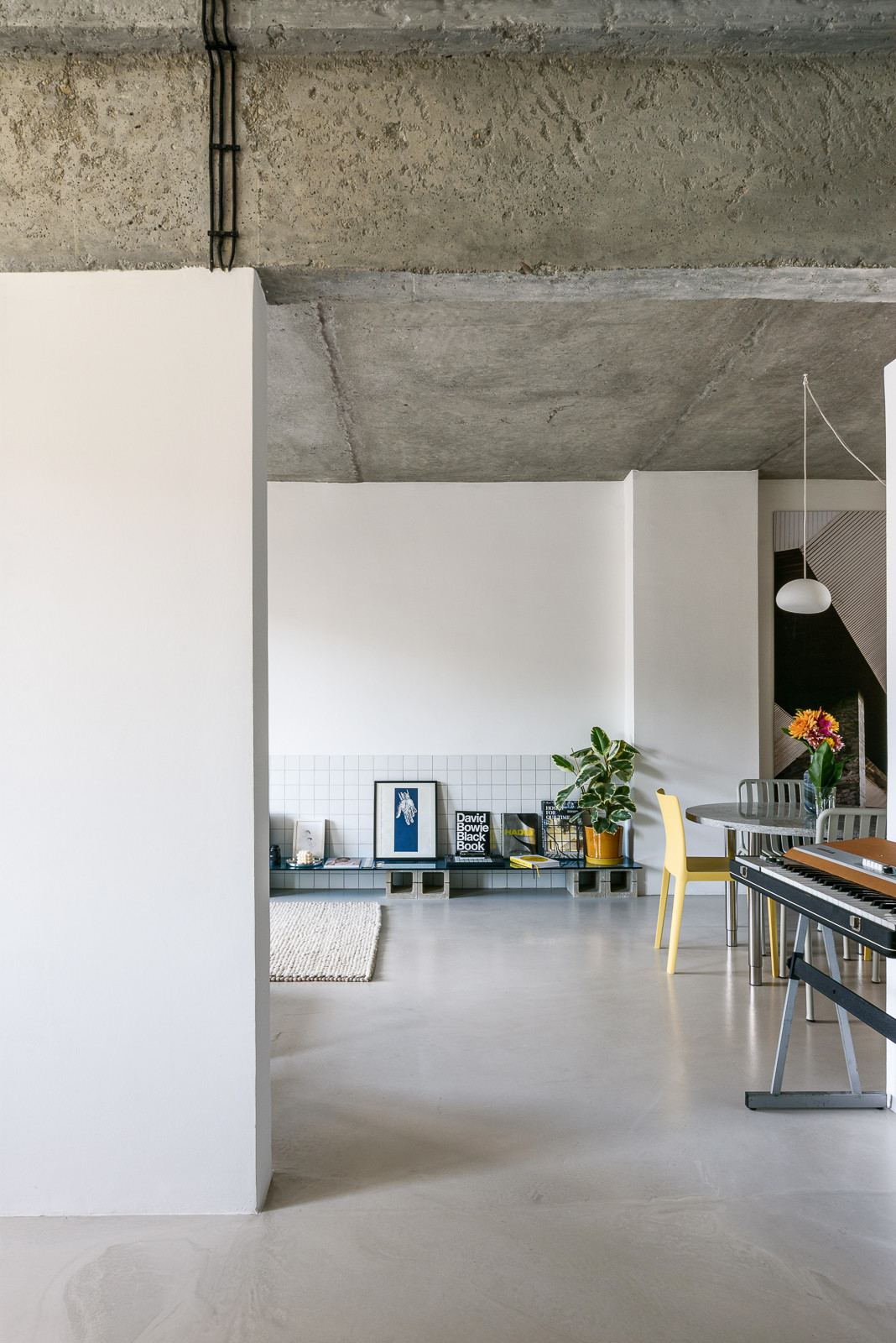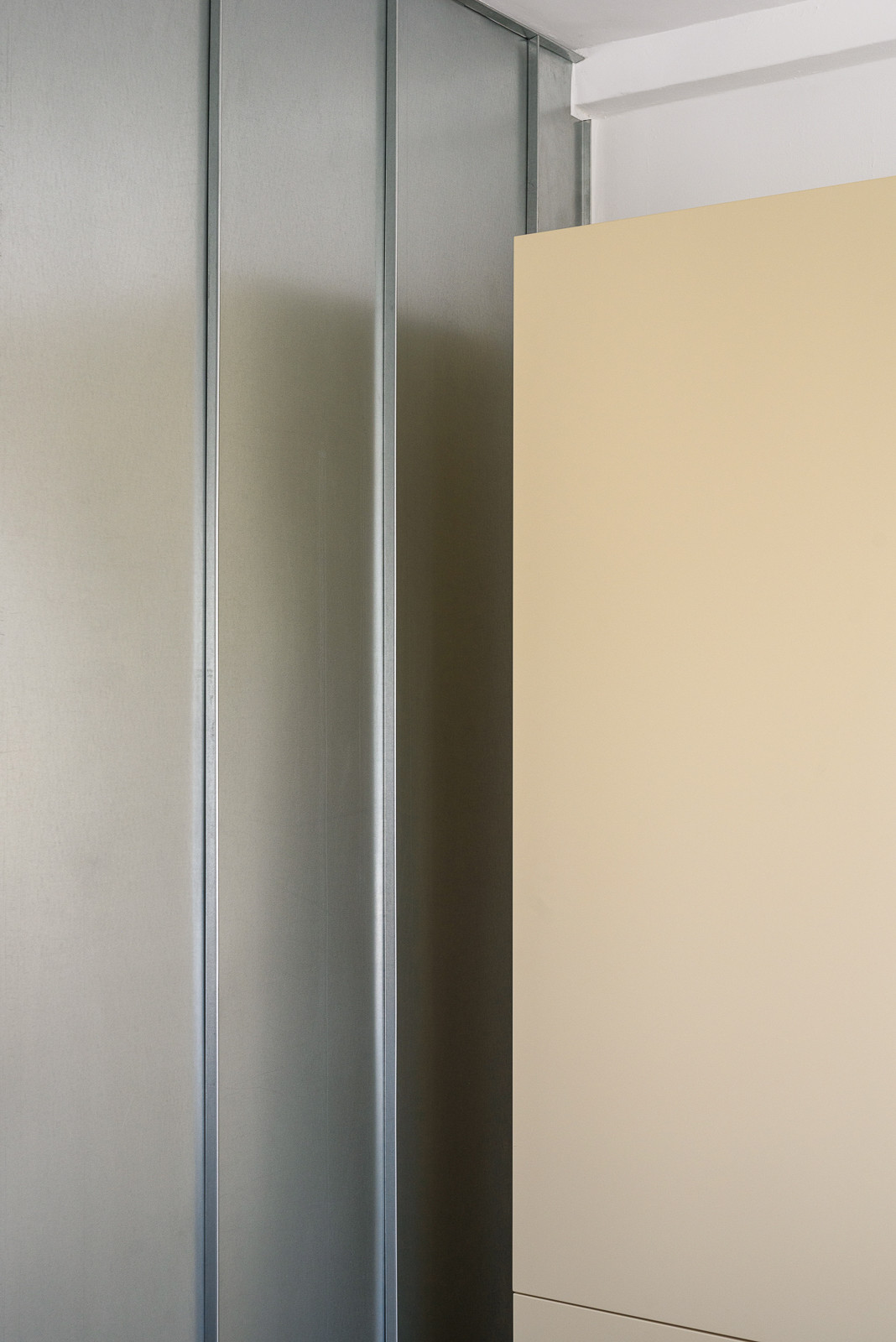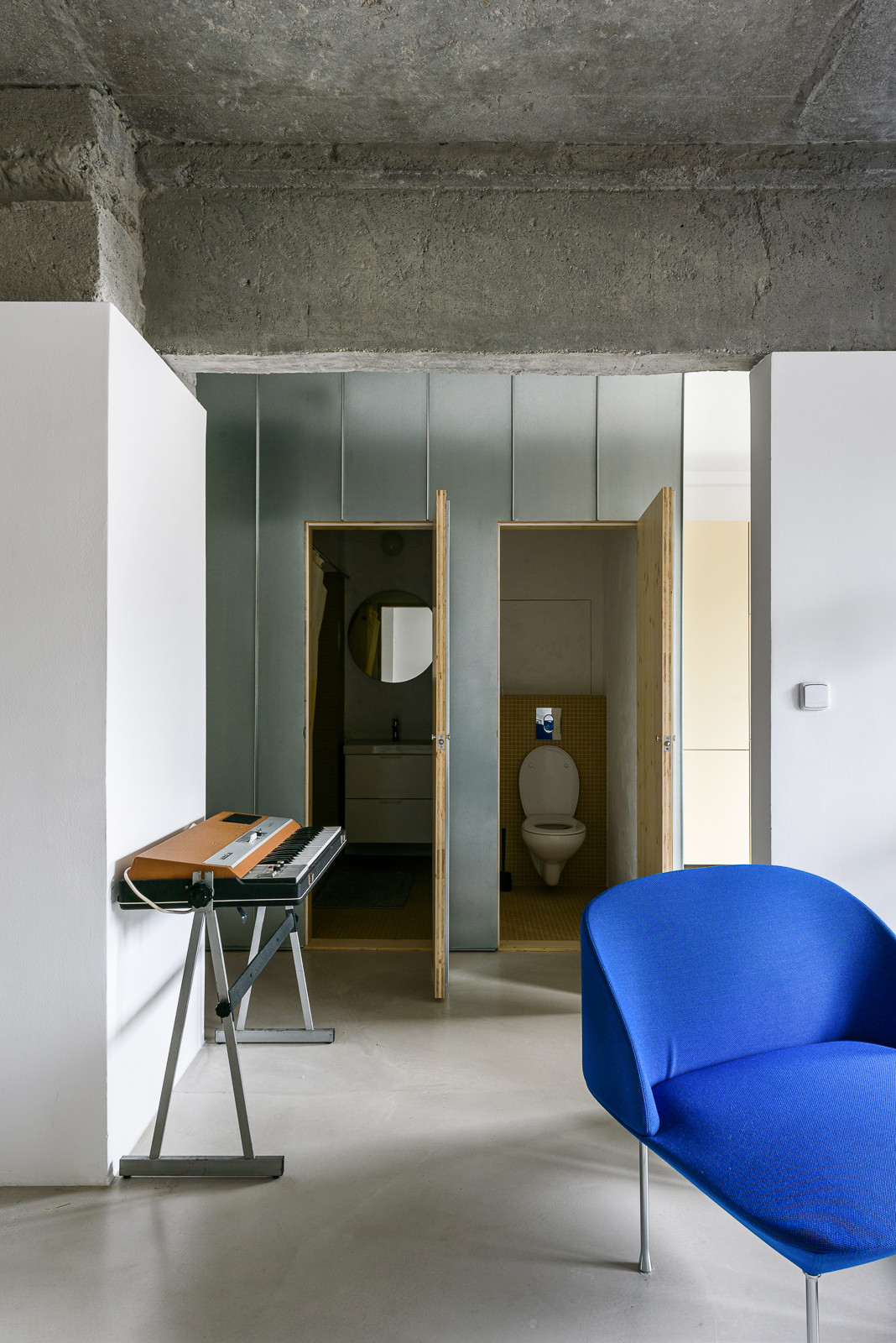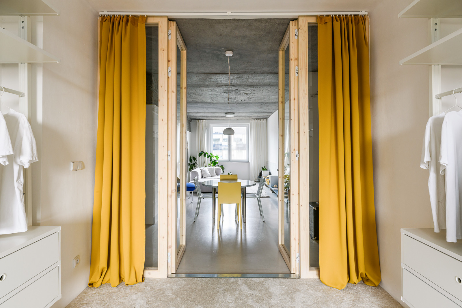 Nový interiér bytu na nejstarším bratislavském sídlišti z 50. let zaujme svou otevřenou dispozicí. Slovenský architekt Alan Prekop radikálně zasáhl do původního půdorysu třípokojového bytu a zanechal v něm pouze nosné zdi. Jediným dělícím prvkem je dřevěná konstrukce s prosklenými výplněmi a stěna s kruhovým průhledem, díky němuž se opticky propojuje kuchyň s obývacím pokojem. V interiéru získal hlavní slovo kov, nerezový kuchyňský bar a parapety doplňují dveře obložené pozinkovaným plechem. Aby architekt ještě více posílil pocit z otevřeného prostoru, zvolil místo vestavěného nábytku volně stojící.