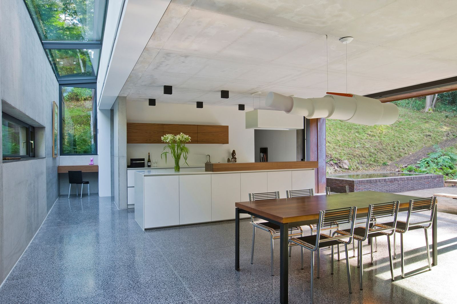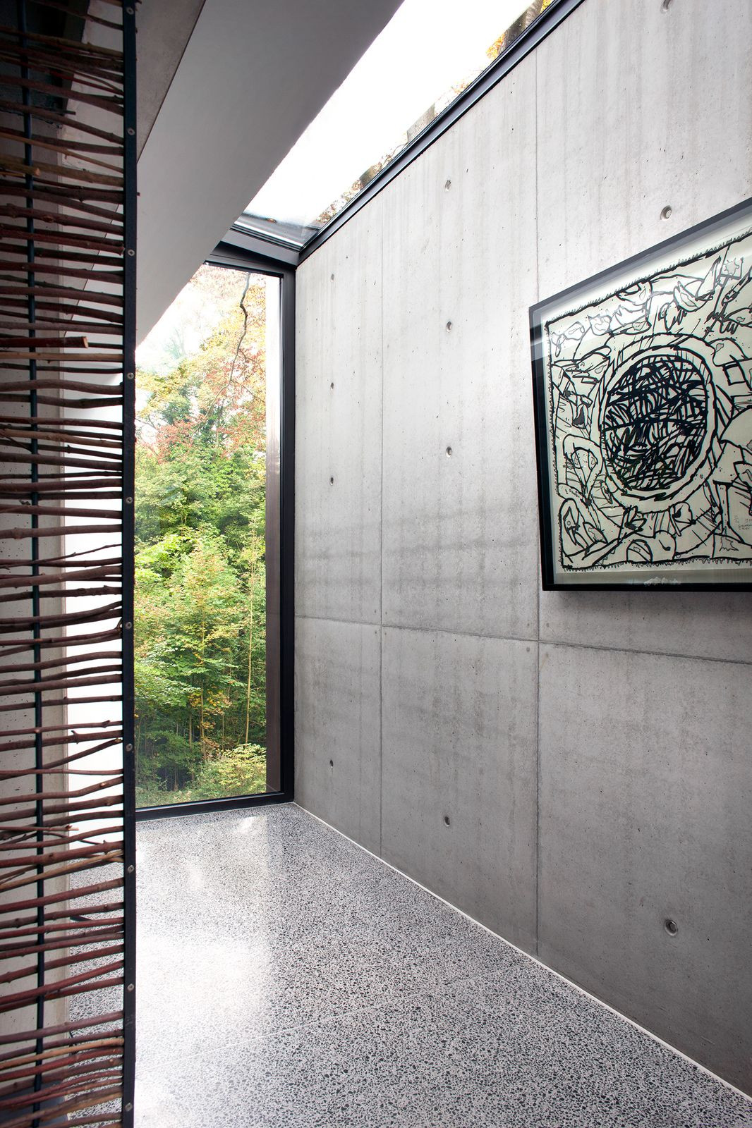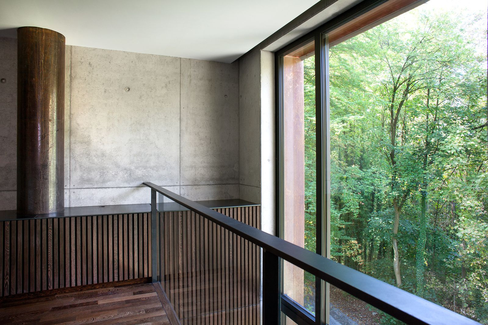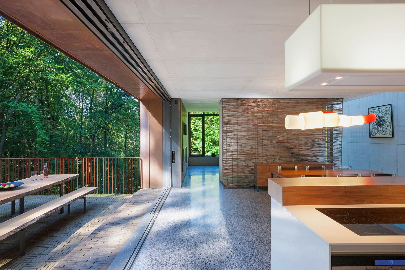 Interiér je pravým opakem zevnějšku. Dominují mu světlé plochy pohledového betonu, šedý přírodní kámen na podlaze a dřevěné doplňky. Pokud bychom ale hledali spojitosti, možná jich najdeme víc, než jsme čekali. Jednak to je přiznání materiálu v jeho surové podobě, a dále stejně jako je měď patinovaná (což je přirozený chemický proces), tak ani beton není nijak upraven. Podobně jako cihly připomínaly hlínu, z které vznikly, tak i dřevěné doplňky nás neustále spojují s přírodou. S tou nás ale nejvíce propojují výhledy a nepatrný předěl mezi obývacím pokojem a terasou. Takové místo ve vás vytváří dojem, kde si nejste jistí, jestli jste venku, nebo uvnitř.