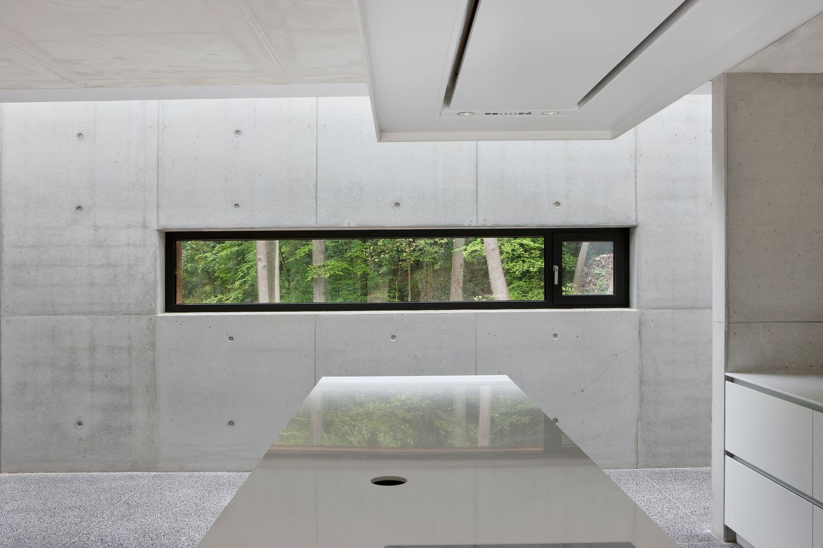 Nepřehlédnutelným rysem každého okna je jeho štíhlý hliníkový rám od německé značky Schüco v sytě černém odstínu. Pásová okna a systém posuvných dveří, díky nimž se dostanete na terasu, byla osazena izolačním trojsklem. Konkrétně se jedná o výrobky: Schüco FW 50+, Schüco AWS 75.SI, Schüco ASS 70.HI.