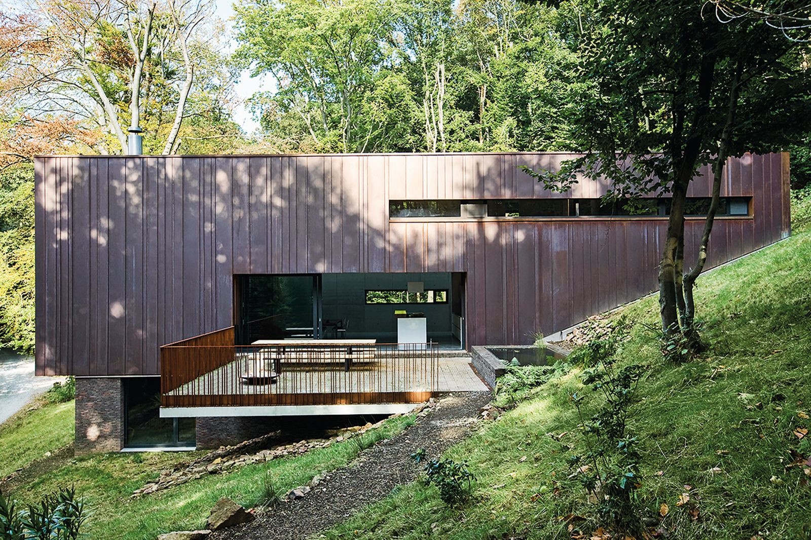 Jestli budete mít tu čest a architekt vás pozve na návštěvu (my bychom rádi, ale naše diáře jsou plné), potom fasáda, kterou při příjezdu po soukromé cestě uvidíte, bude téměř bez oken a místo rodinného domu bude připomínat spíš obrněný kryt. Aby dům nepůsobil příliš monstrózně, suterén byl od zbytku hmoty oddělen. Definují ho cihly; možná proto, že by se bez půdy, ke které mají svou povahou nejblíž, neobešly. Nadzemní podlaží jsou opláštěna patinující mědí, pro každý z hmotových celků domu byla zvolena jiná struktura. Zatímco hlavní obytný prostor ji má nepravidelnou a vertikální, nižší část objektu je tvořena horizontálními obdélníkovými pláty. Dojem z fasády je v každý okamžik jiný, sluneční paprsky si s povrchem pohrávají a díky vrženým stínům vypadá v každý okamžik trochu jinak.