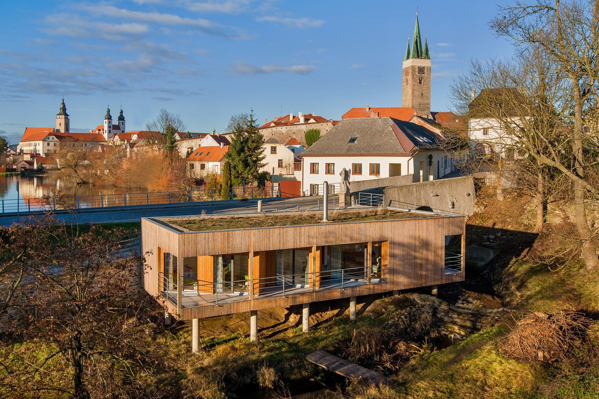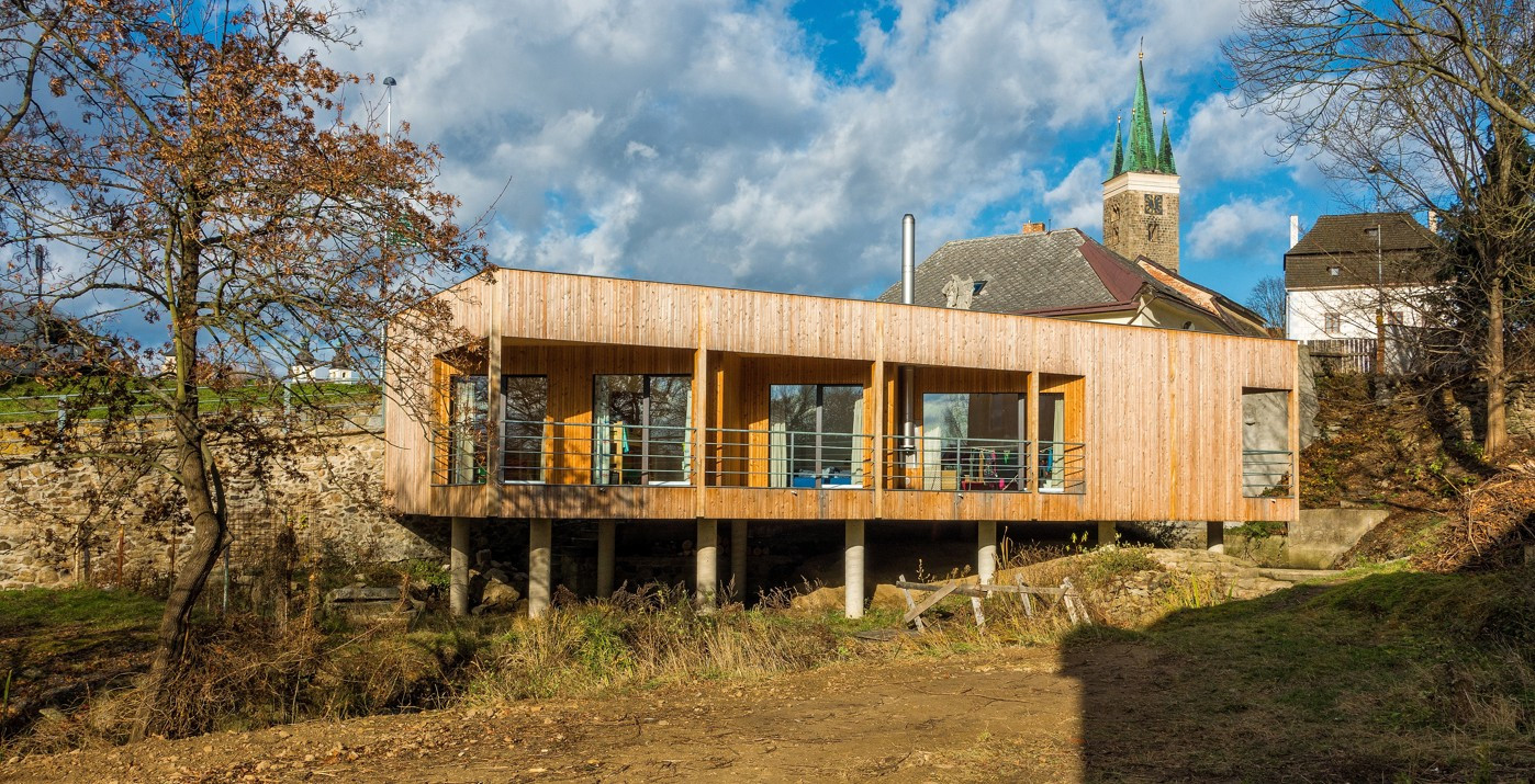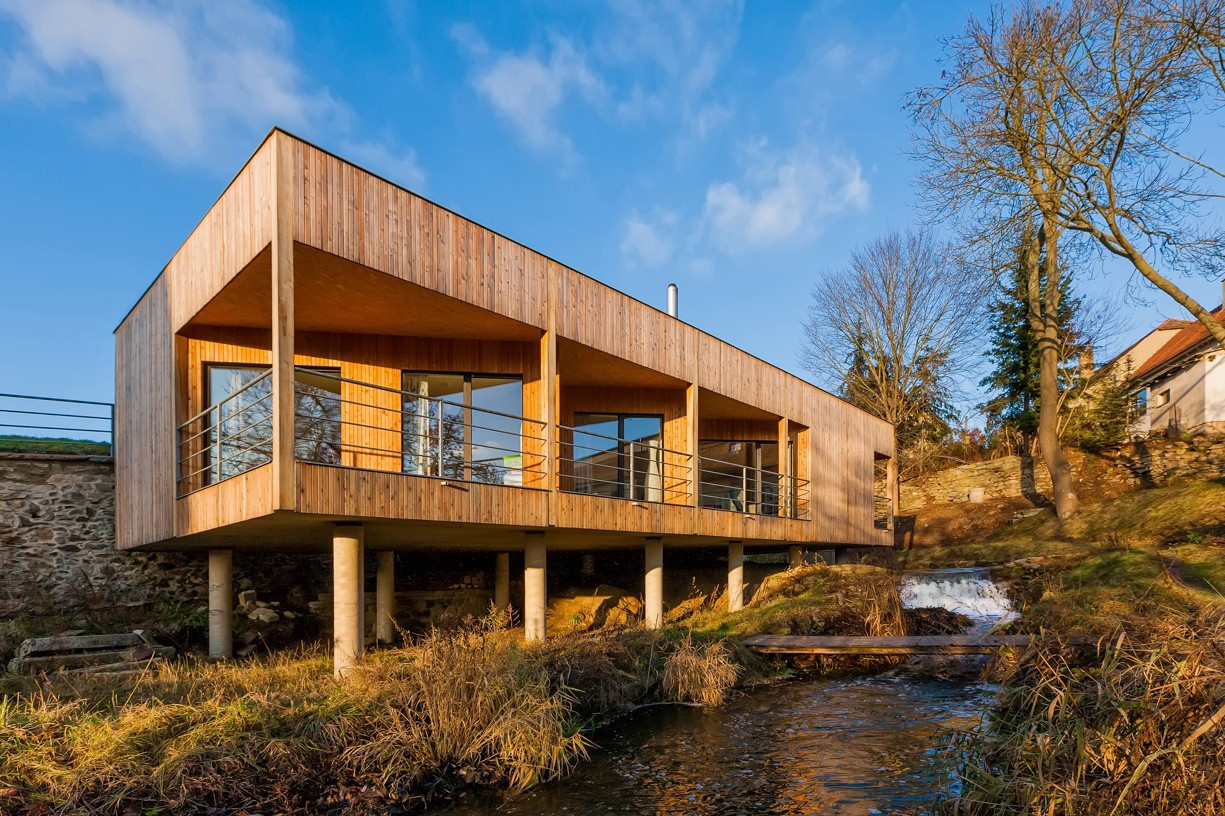 Pod dohledem barokní sochy Anděla Strážce, na místě bývalých mlýnských domků stojí rodinný dům Jiřího Ondráčka, architekta z telčského studia ARCHOO. Jednoduchý kvádr dřevostavby efektivně využívá skromnou plochu pozemku s vodopádem, nad nímž se vznáší pomocí subtilních betonových sloupů. Stavba, která byla nominována na Cenu za architekturu 2018, je povedeným příkladem souladu historie lokality, současné architektury a přírody s živým prvkem vodopádu.