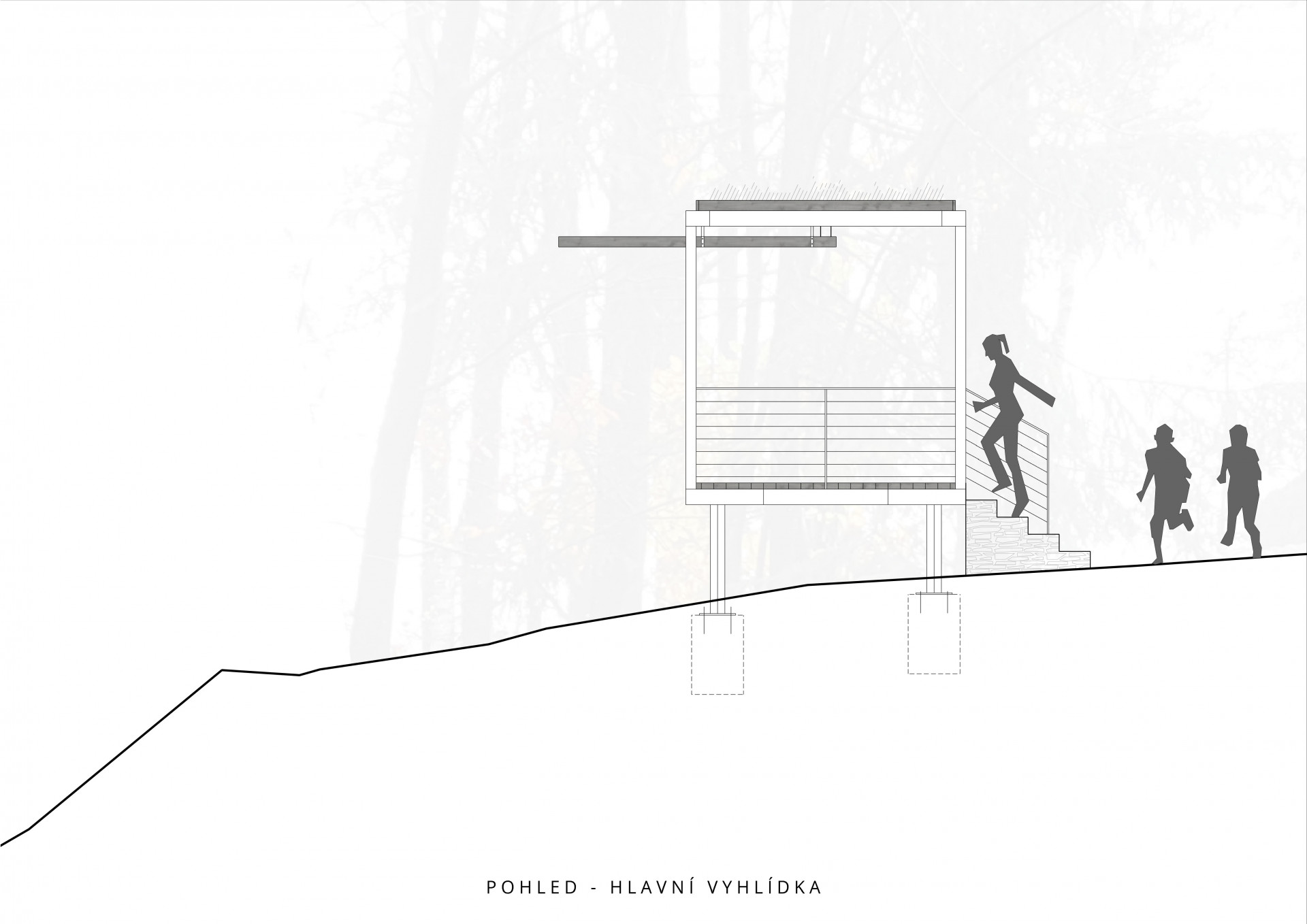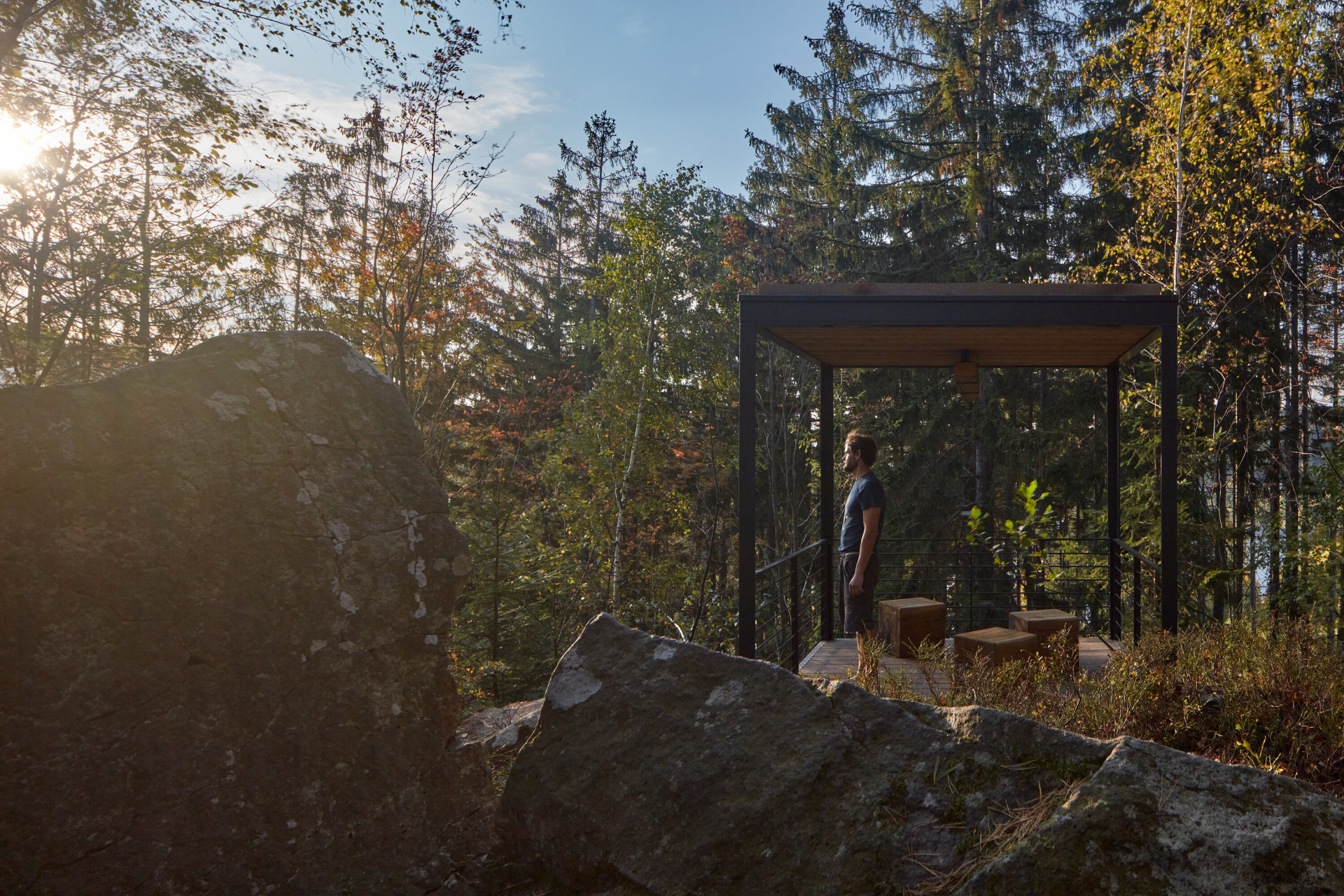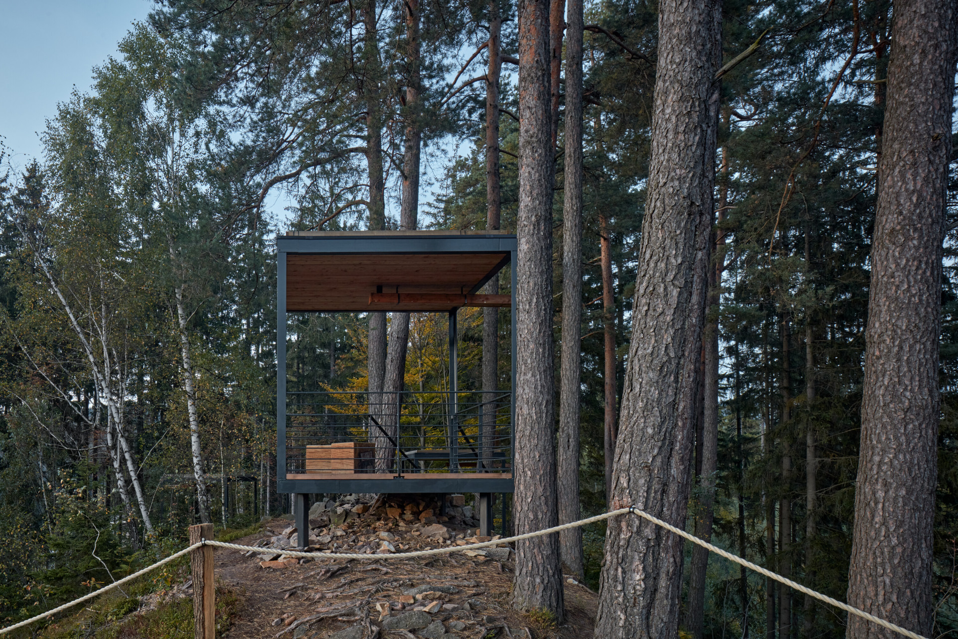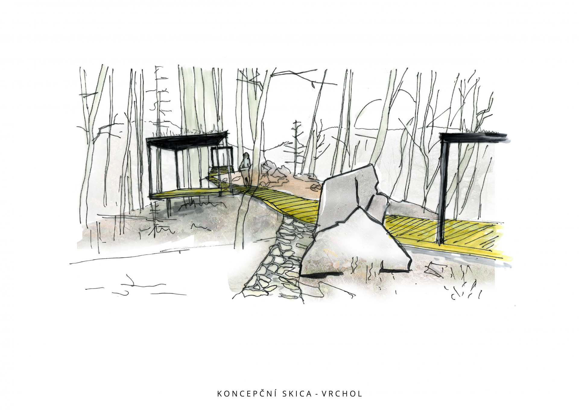„V místě sedla pod skalnatým vrcholkem návštěvníci vystoupají na malou vyhlídkovou piknikovou platformu. Inspirací zde byly staré zarostlé ruiny kamenných základů rozeseté po Beskydech, dokladující osídlení a hospodaření předků v nejzapadlejších koutech krajiny,“ dodávají autoři s tím, že se snažili pracovat primárně s lokálními přírodními materiály. Přístřešky s ocelovou konstrukcí tak mají podlahy a stropy z masivních fošen, lavičky jsou vyrobené z dubu a pro stezky a opěrné zídky byl využit kámen a šotolina přímo z lomu.