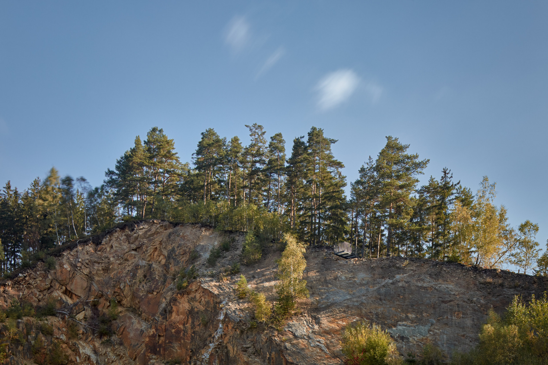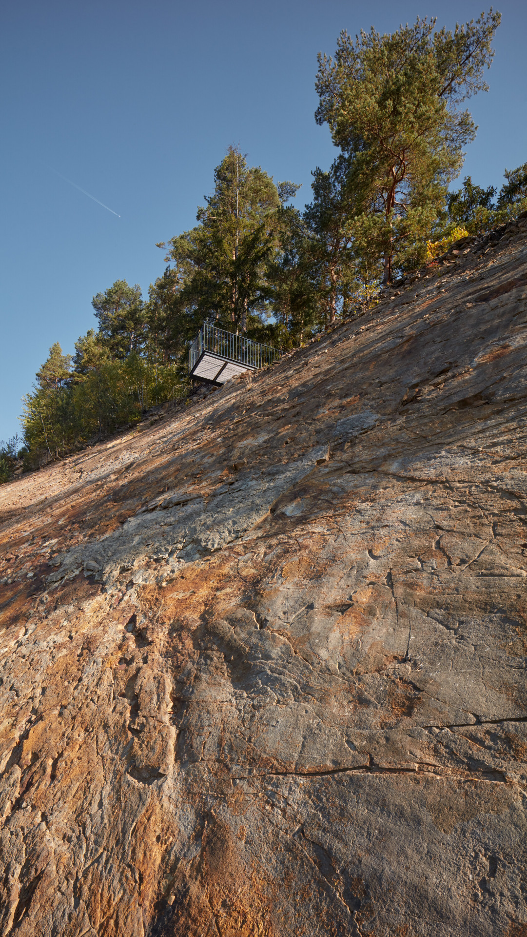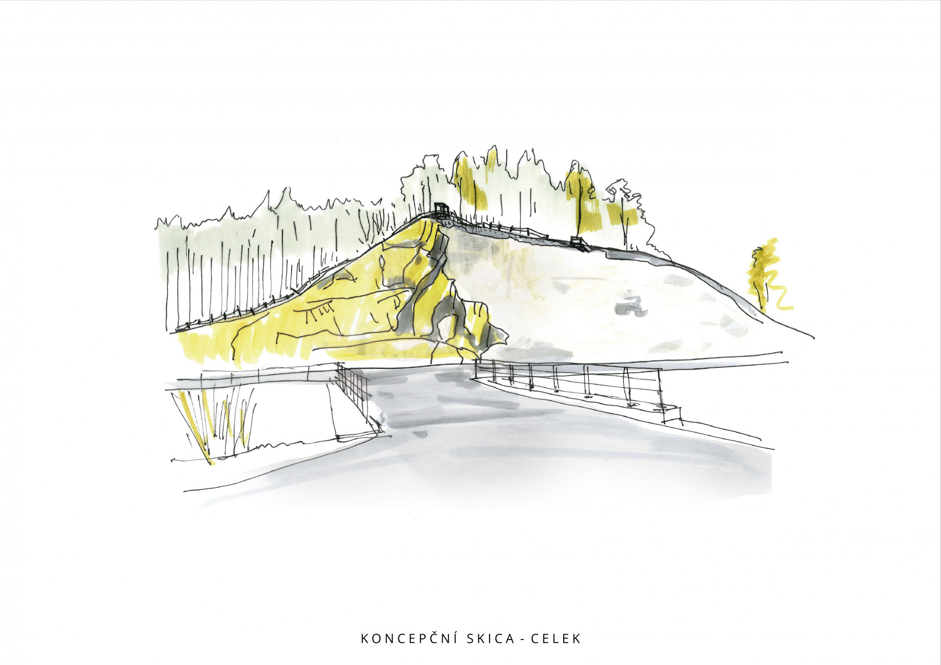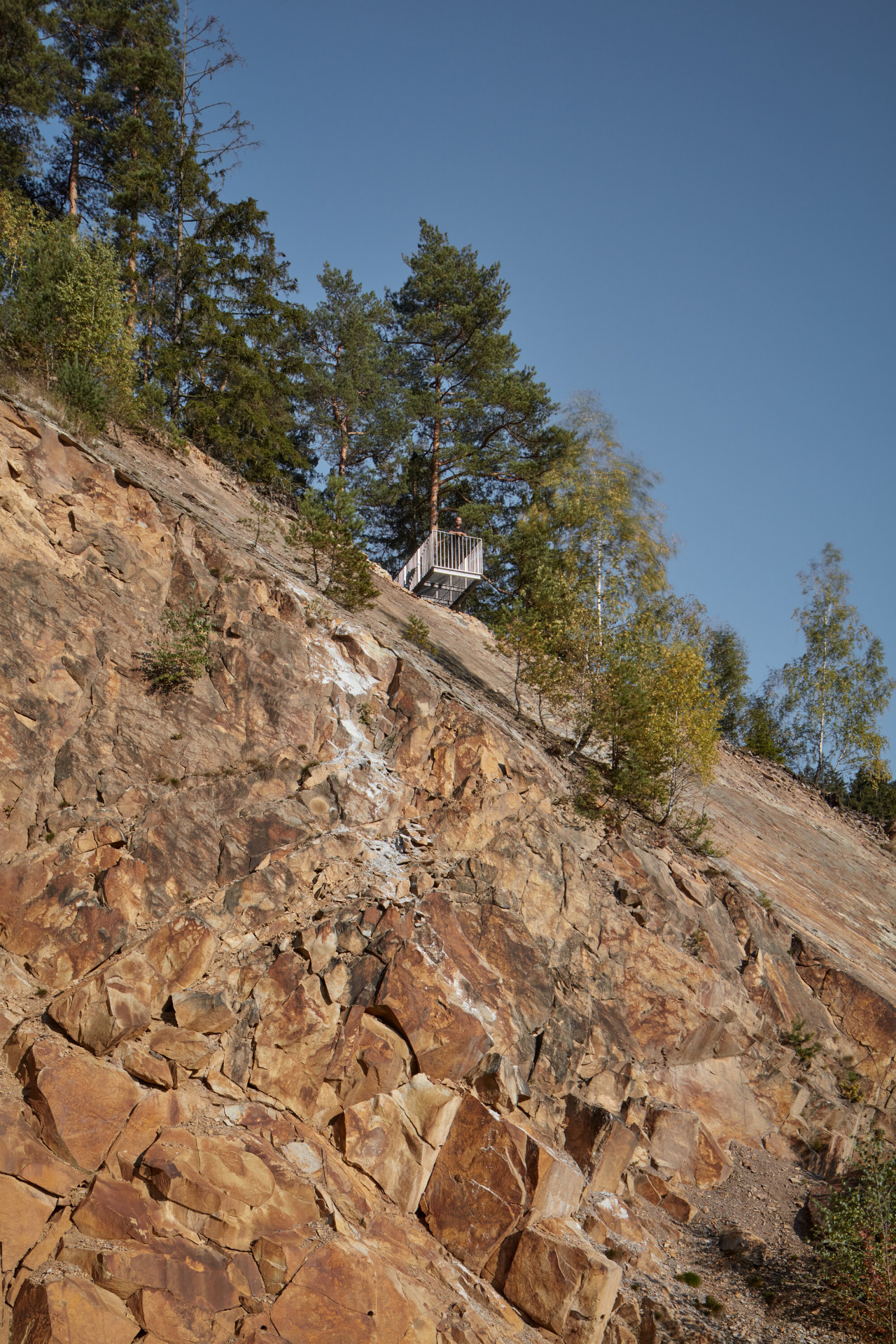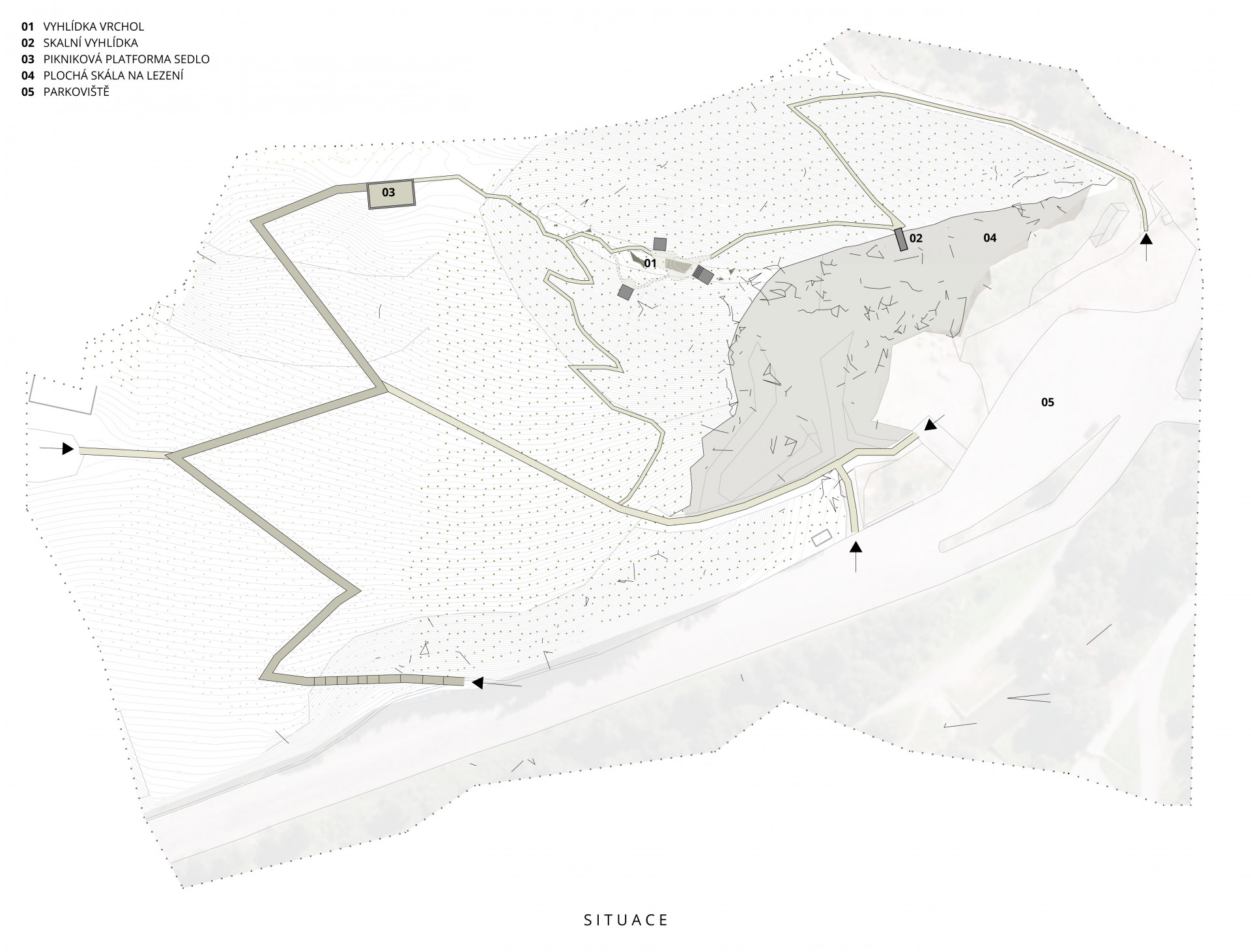 „Svahy a vrcholek kopce je nyní dostupný třemi vyhlídkovými stezkami, které propojují hlavní místa výhledů a vytvářejí novou okružní cestní síť, jež se napojuje na blízkou komunikaci a přilehlé parkoviště před kamenolomem,“ popisují architekti.