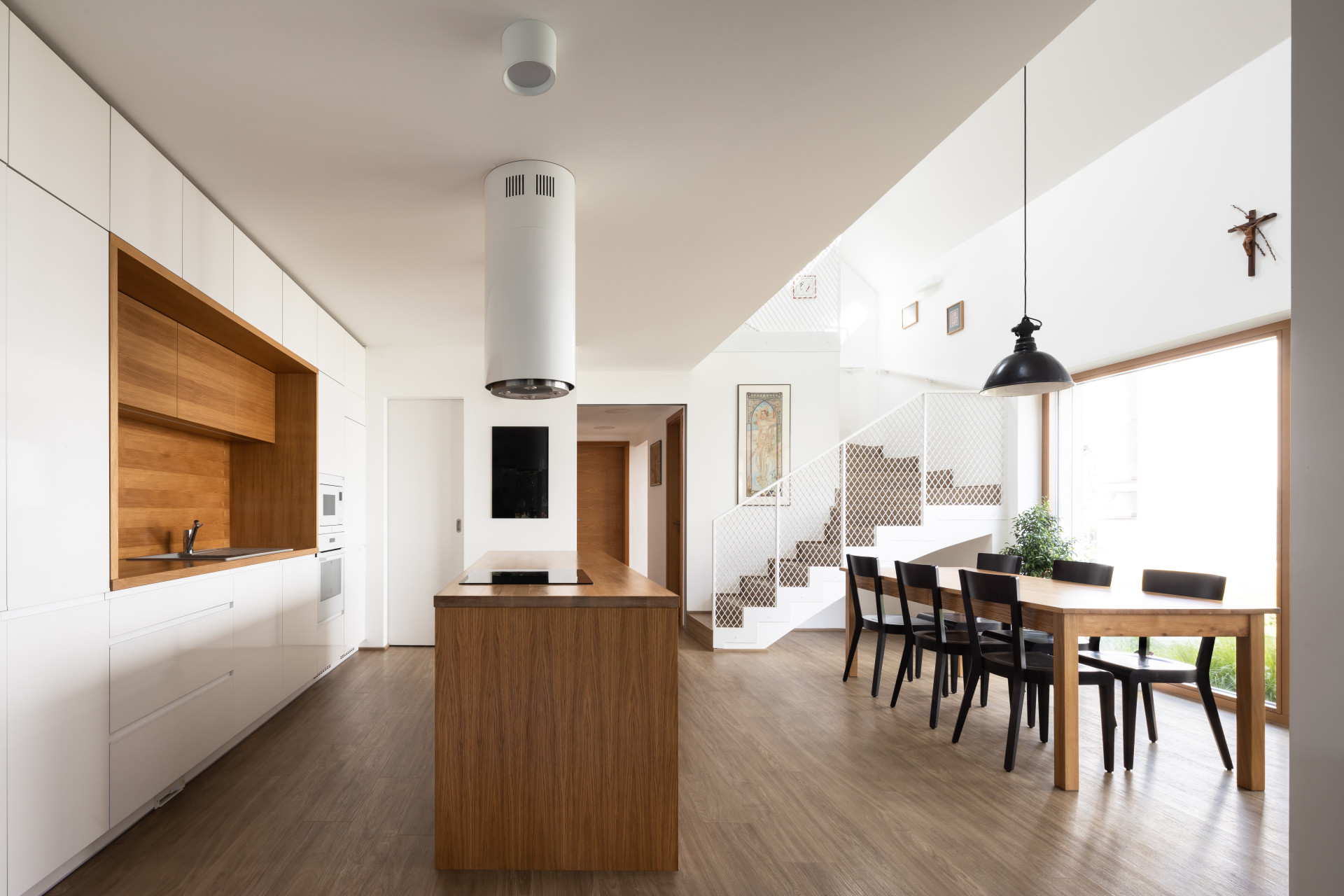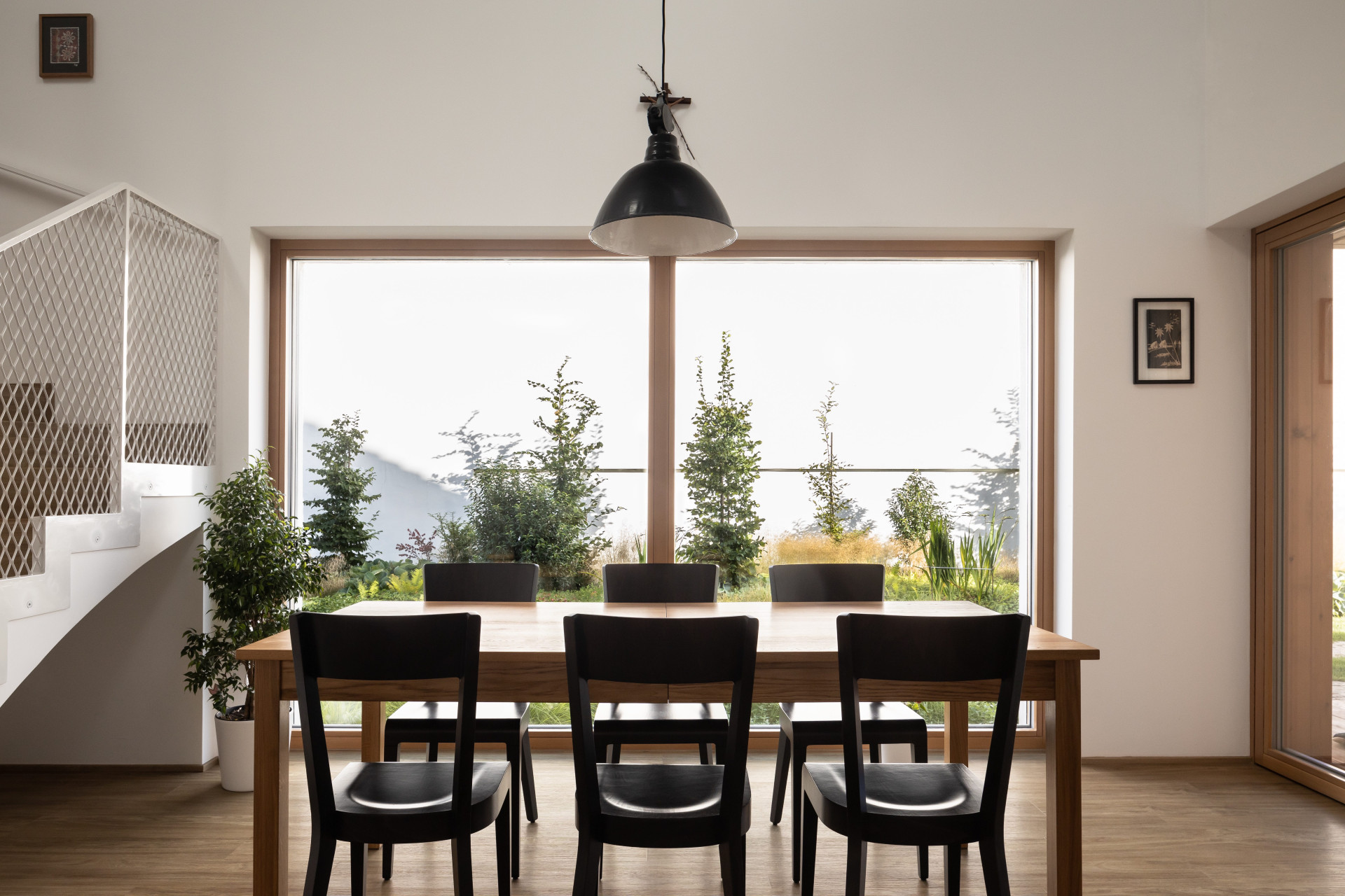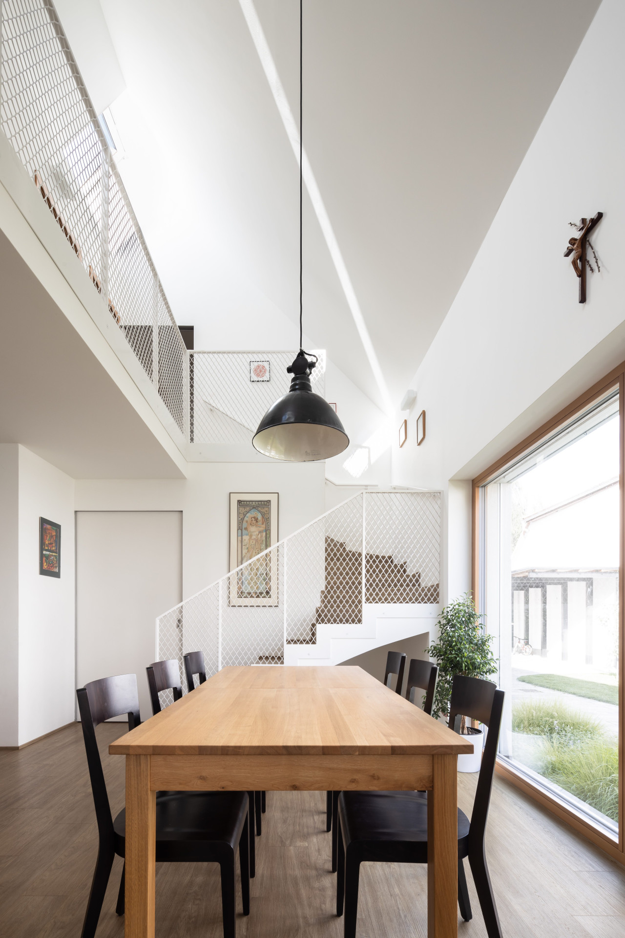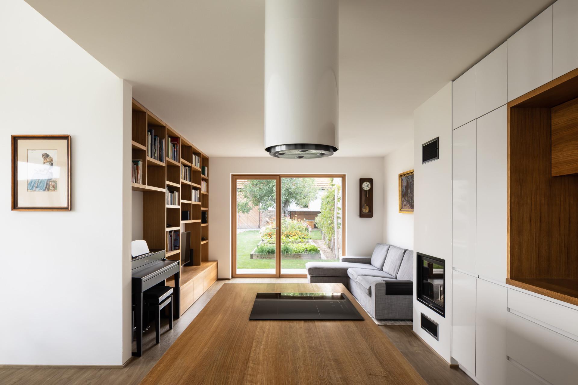 „Náves v Dolních Dubňanech pomalu ztrácí svůj původní charakter. Okolní stavby, které se do ní orientují a udávají tvář jejímu prostoru, nerespektují její měřítko a obraz. Současný dům nemusí vytvářet pitoreskní chaloupku, ale nesmí svým měřítkem, charakterem a umístěním uškodit výrazu návsi,“ říkají architekti Radek Pasterný a David Bureš z ateliéru CL3. Sami přitom potřebovali, stejně jako tomu bylo v případě domů v okolí, navrhnout větší objekt, než by bylo pro místní zástavbu příznačné. Na podlouhlém pozemku proto nakonec vyrostly novostavby dvě – první menší, směřující do návsi, druhá delší a širší, která v sobě obsahuje hlavní obytné prostory využívané pětičlennou rodinou.