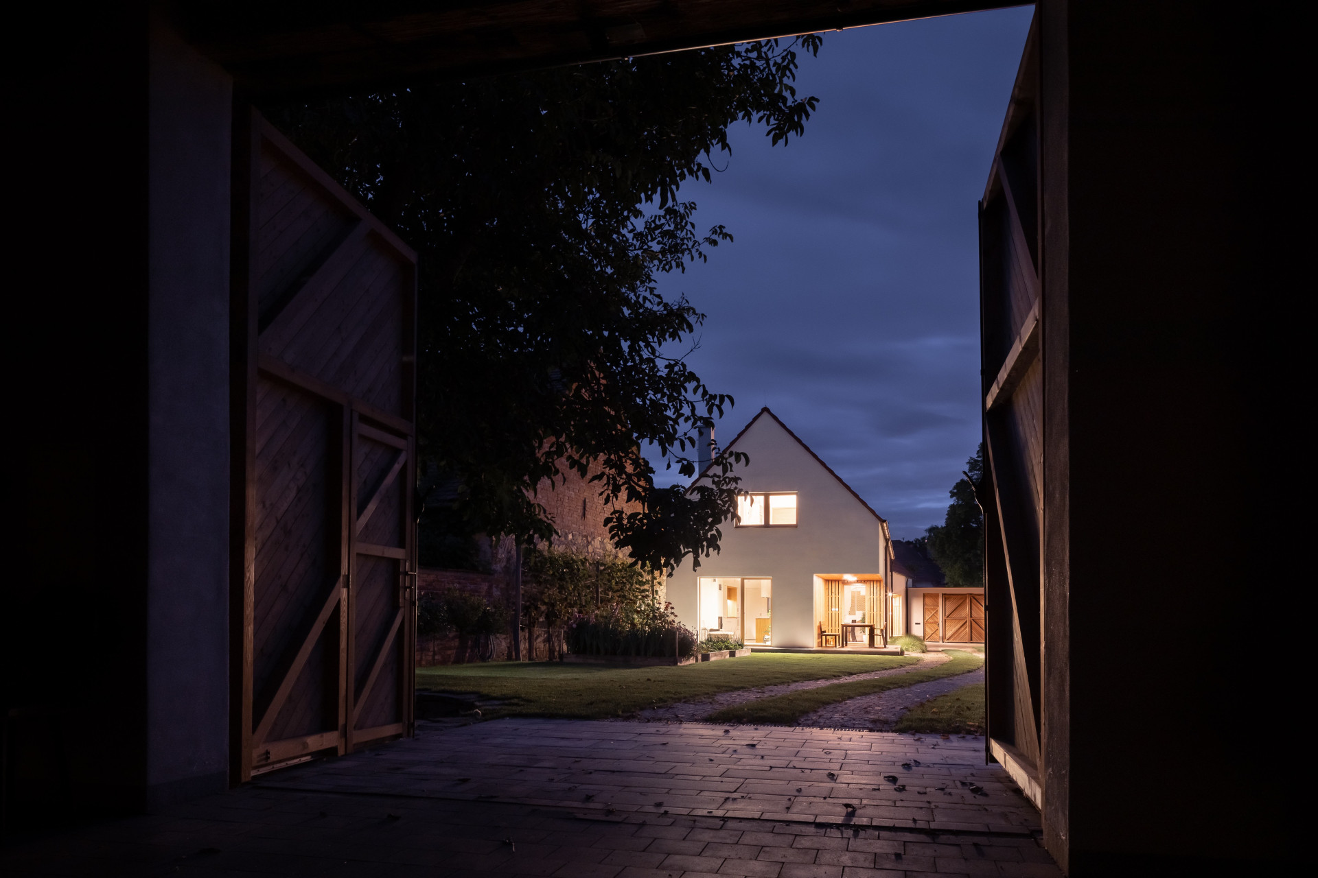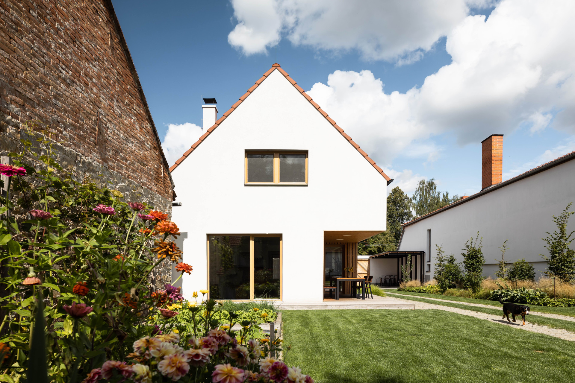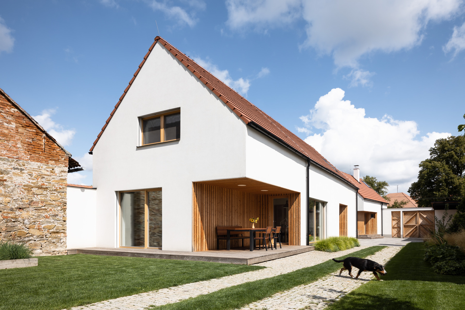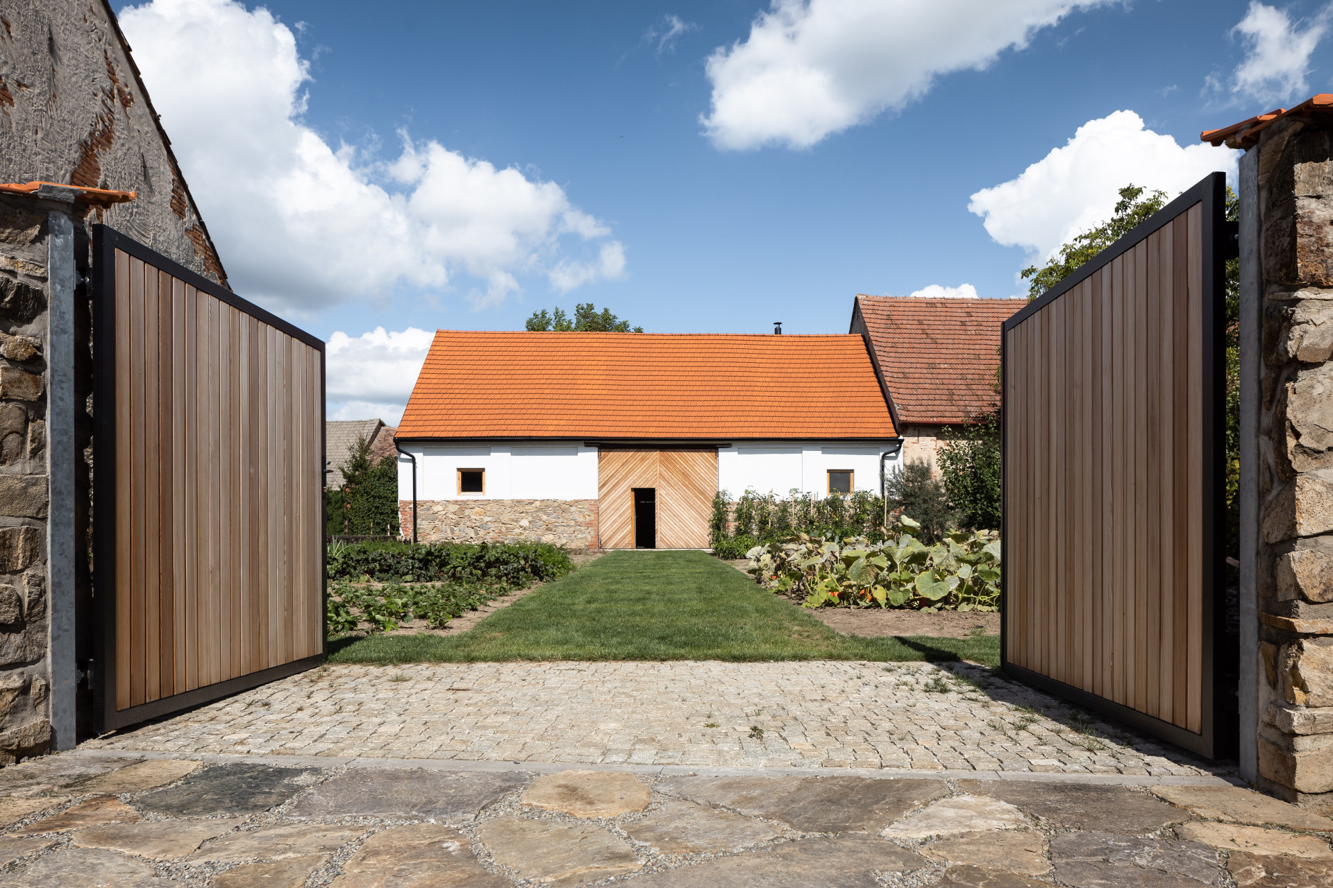 Na parcele ve skutečnosti stojí objekty hned tři, pozemek uzavírá původní zrekonstruovaná stodola. „Parcela nabízí klasické členění úzkého pozemku na návsi v regionu – předzahrádka, dům, dvůr, stodola, zahrada, humna. V rámci pozemku samotného jsme pak chtěli zachovat jeho průjezdnost z návsi až na humna. Bereme tuto možnost jako výsadu, kterou je zde potřeba zachovat,“ říkají architekti.