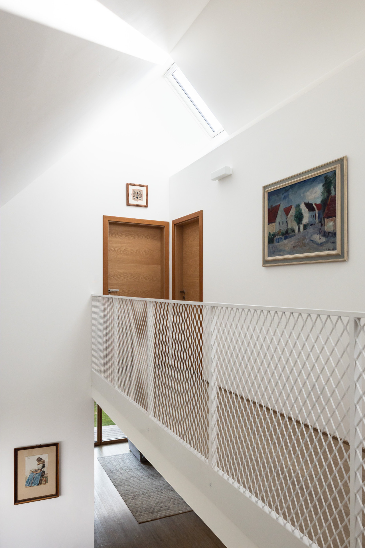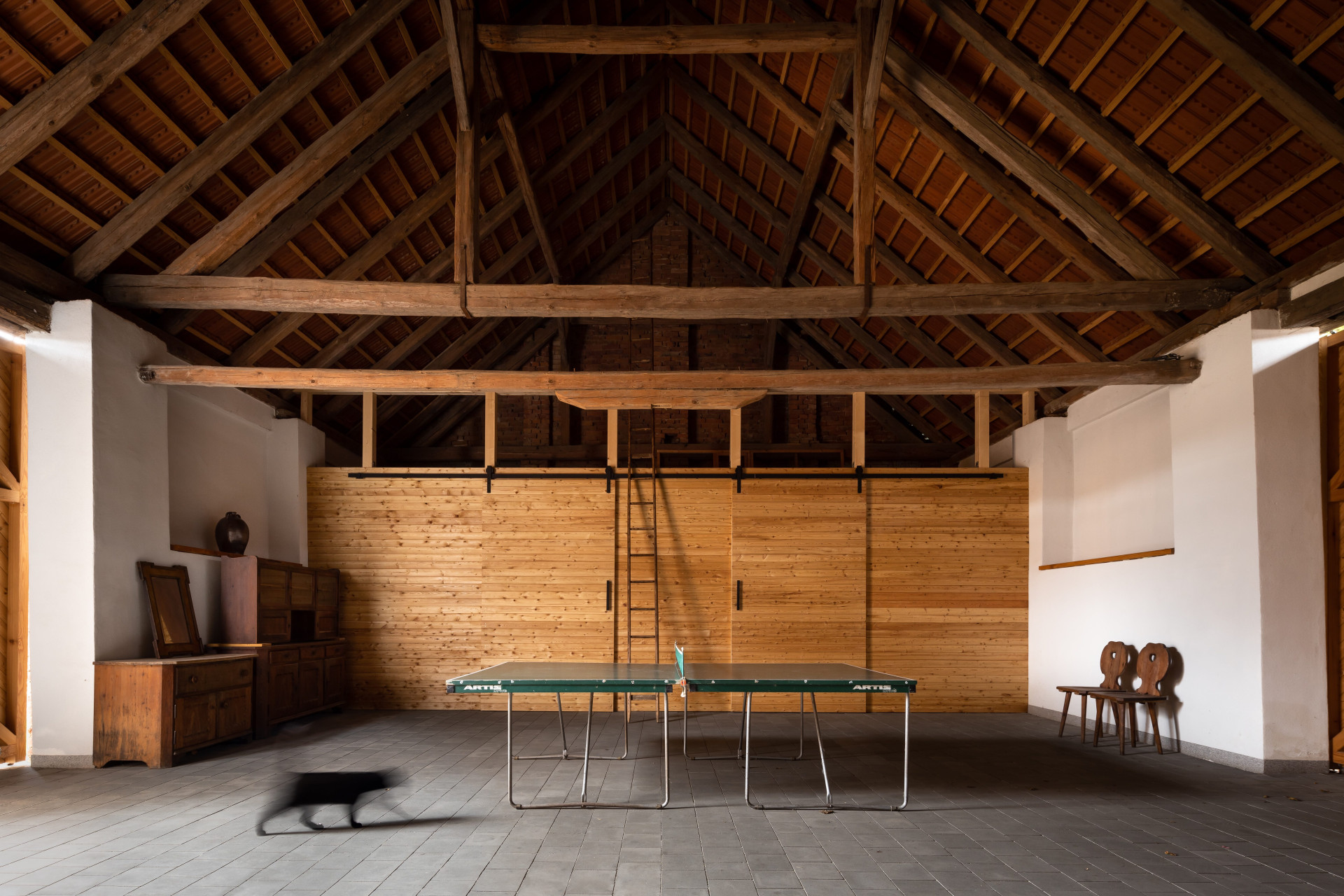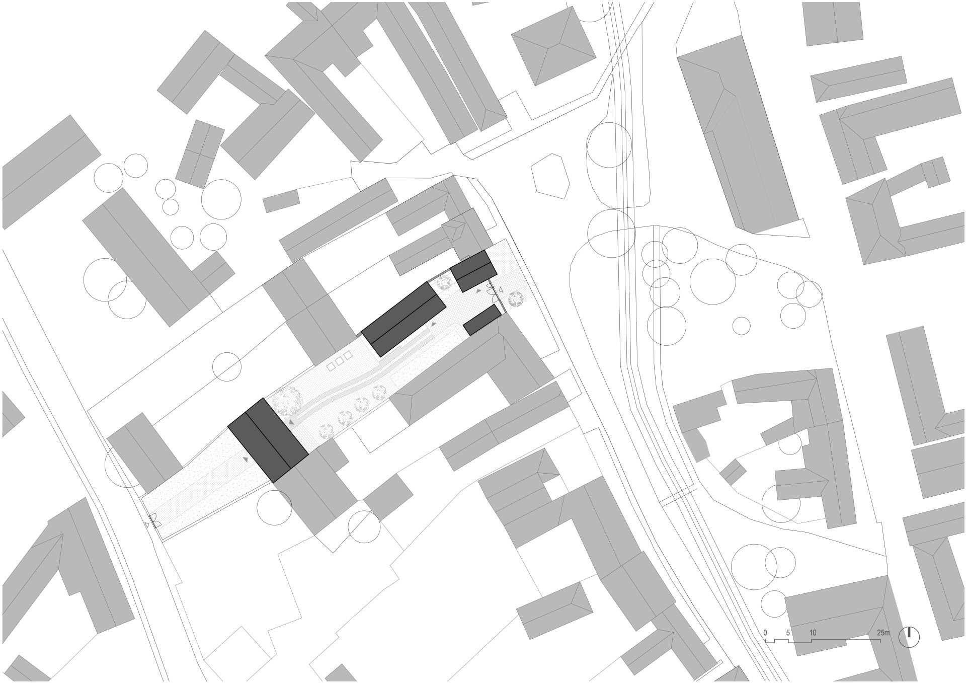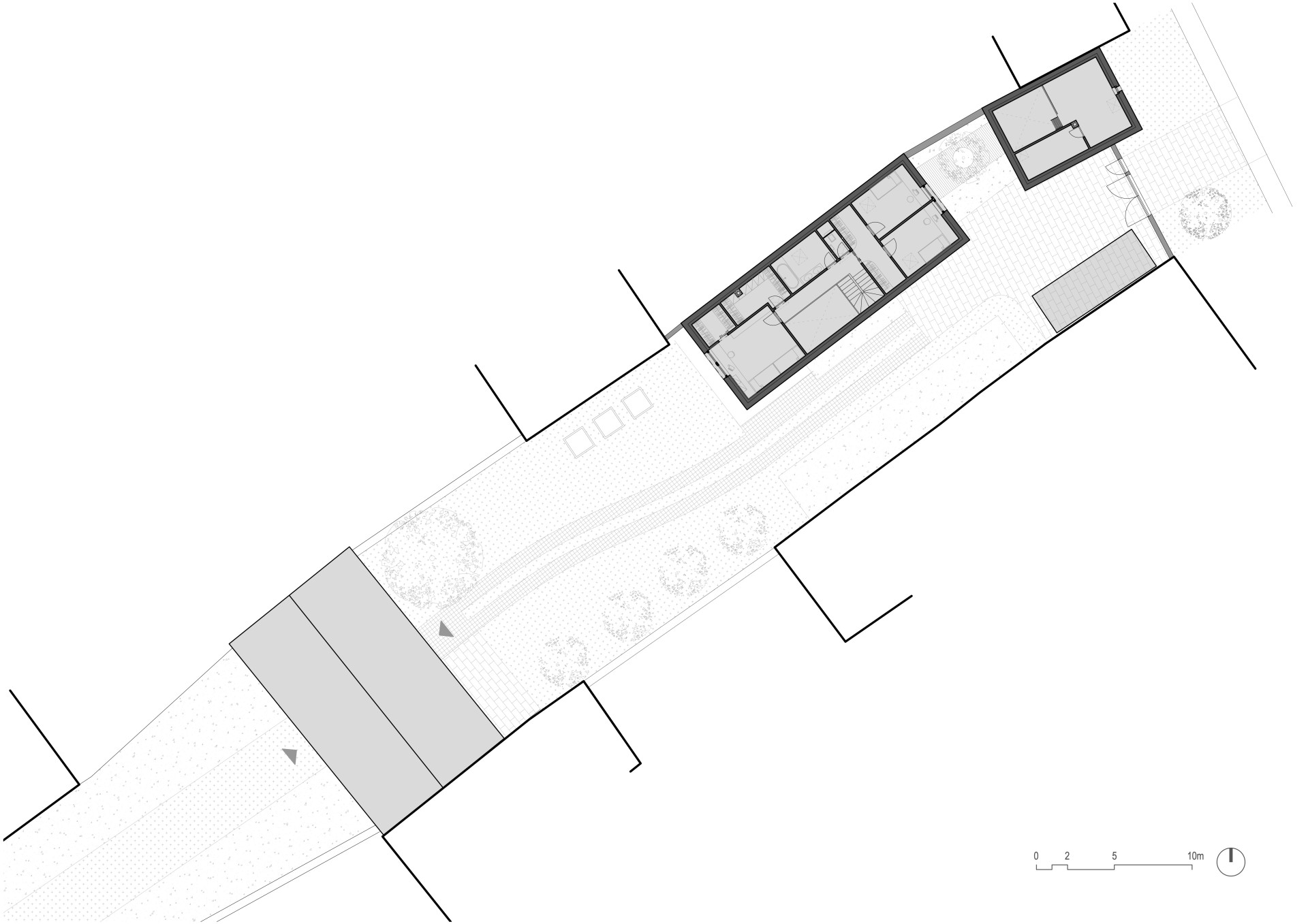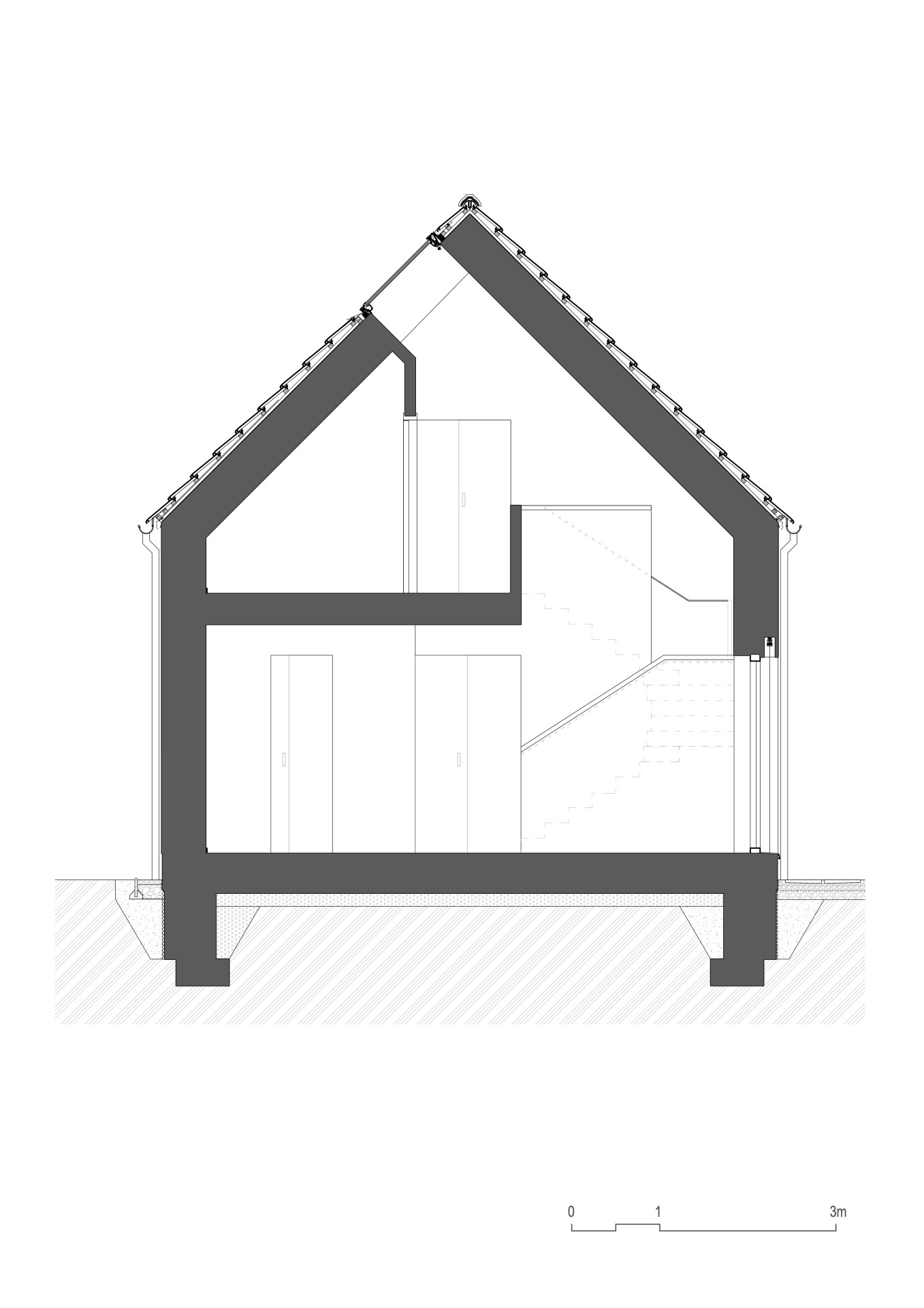 Na parcele ve skutečnosti stojí objekty hned tři, pozemek uzavírá původní zrekonstruovaná stodola. „Parcela nabízí klasické členění úzkého pozemku na návsi v regionu – předzahrádka, dům, dvůr, stodola, zahrada, humna. V rámci pozemku samotného jsme pak chtěli zachovat jeho průjezdnost z návsi až na humna. Bereme tuto možnost jako výsadu, kterou je zde potřeba zachovat,“ říkají architekti.