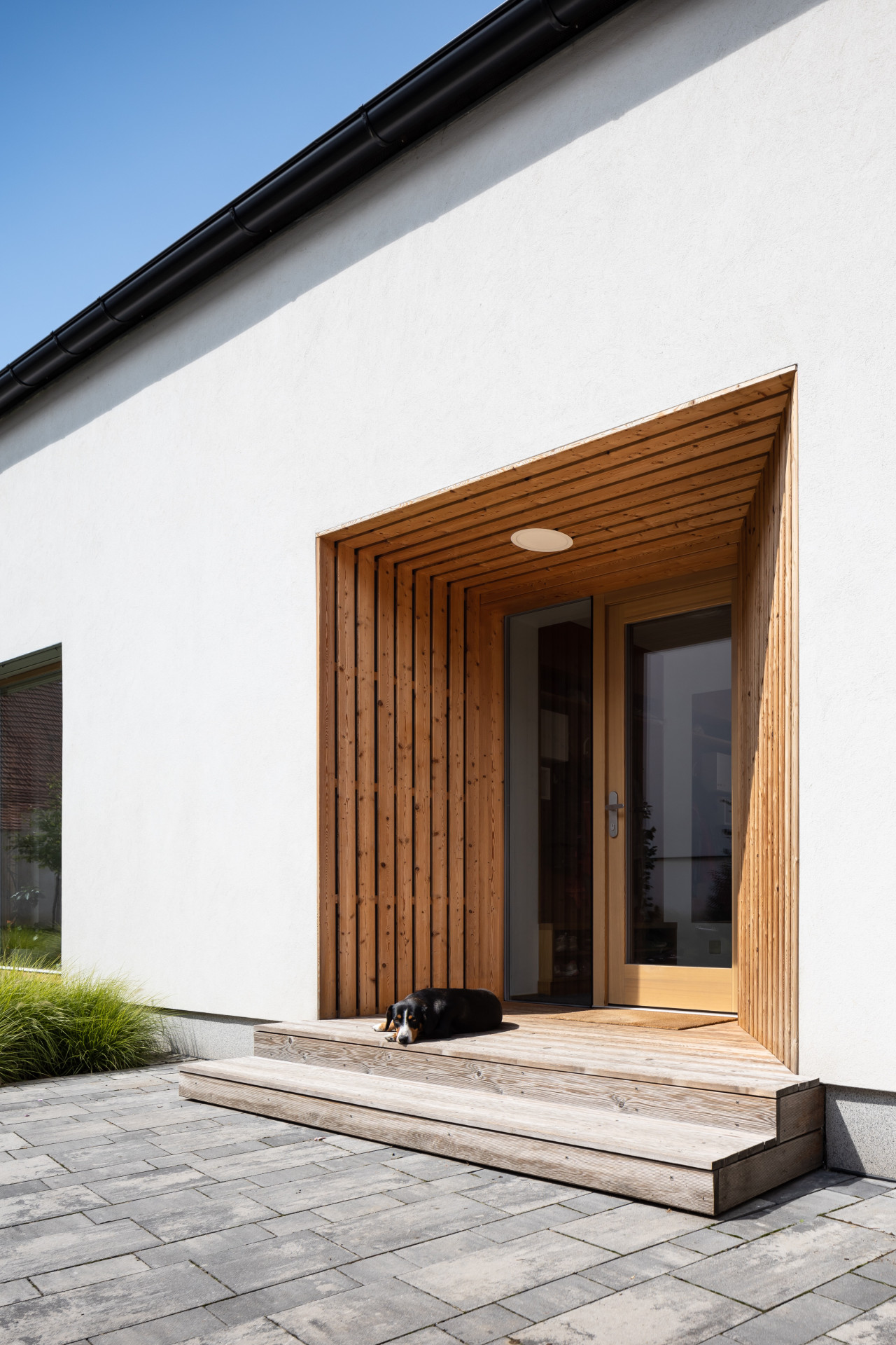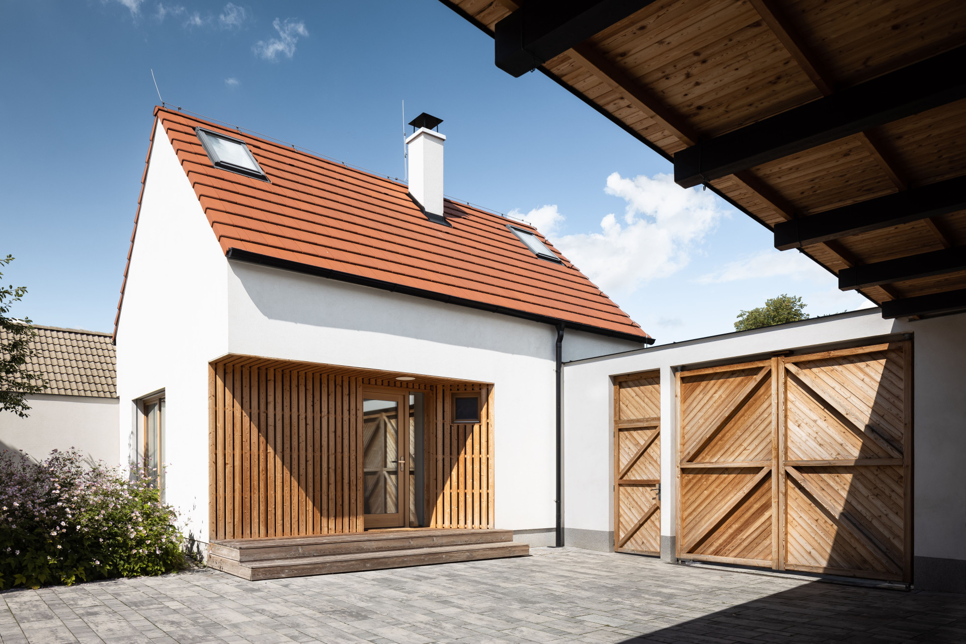 Siluety domů pohledově vytvořily harmonické seskupení nejen navenek, ale také uvnitř pozemku. Do hmot domů jsou zapasované kryté vstupy a terasa s posezením. Všechna taková místa jsou pak zvýrazněna dřevěným obložením. Přírodní materiál v kombinaci s bílými omítkami a červenou střechou na místě působí stejně patřičně jako tvar a skladba domů. „Bílá hladká omítka s červenou střechou s pálenou krytinou tento dojem umocňují a ukazují na propojení současných materiálových řešení se starými způsoby stavění. Vyříznuté objemy obložené dřevem jsou chápany jako přechod mezi exteriérem a interiérem domu, respektive dvorem,“ odůvodňují volbu materiálů architekti.