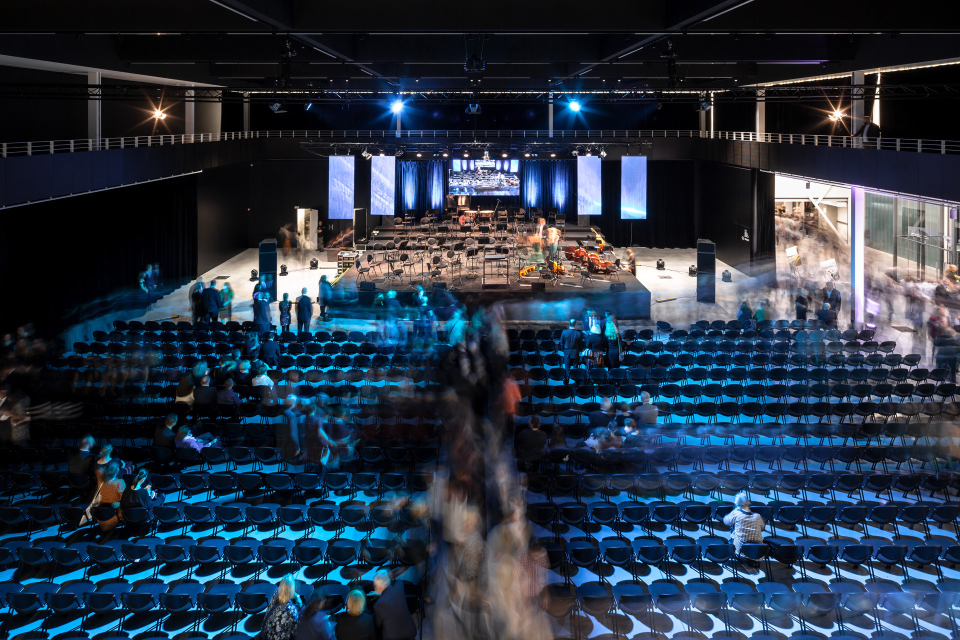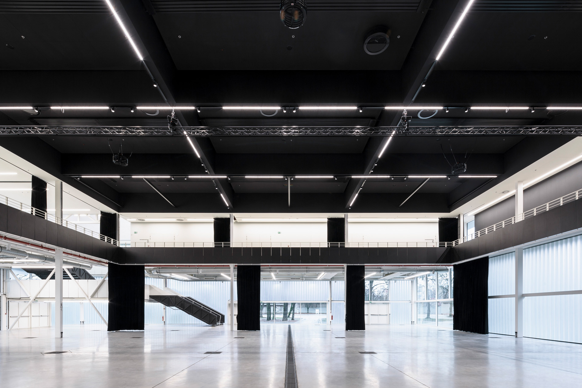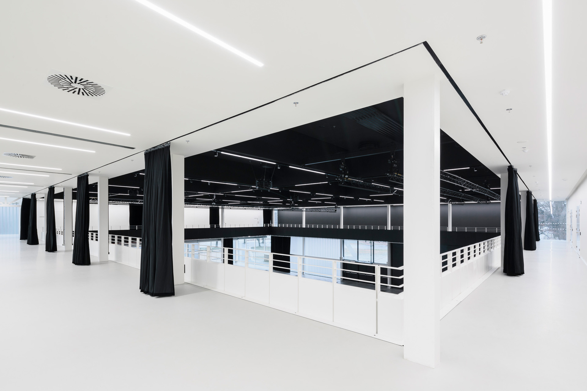 Interiérům dominuje vedle odhalené konstrukce zejména jednoduché černo-bílé ladění. Právě hlavní halu architekti navrhli jako celo-černou, světlo do ní přivádí především rozsáhlé skleněné plochy, které zároveň umožňují propojit interiér s exteriérem. Výhodou černé haly je ale také to, že se od svého okolí může kompletně izolovat, a to díky těžkým závěsům. „Jakmile jsou rozhrnuté, vniká okolní zeleň přímo do nitra sálu, jakmile se zatáhnou, vzniká naopak dokonalý blackbox,“ vysvětlují architekti.