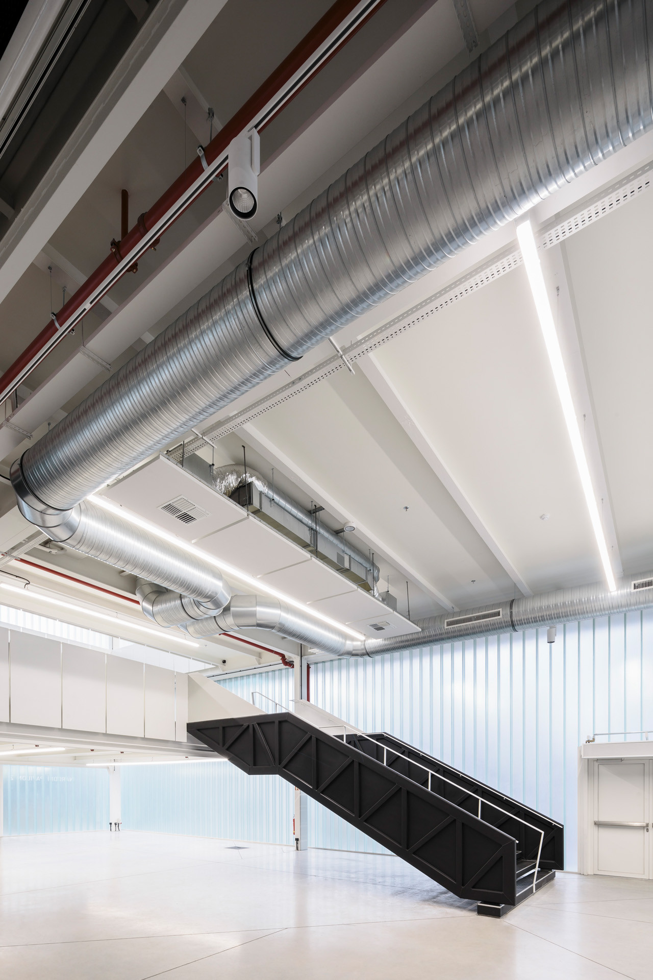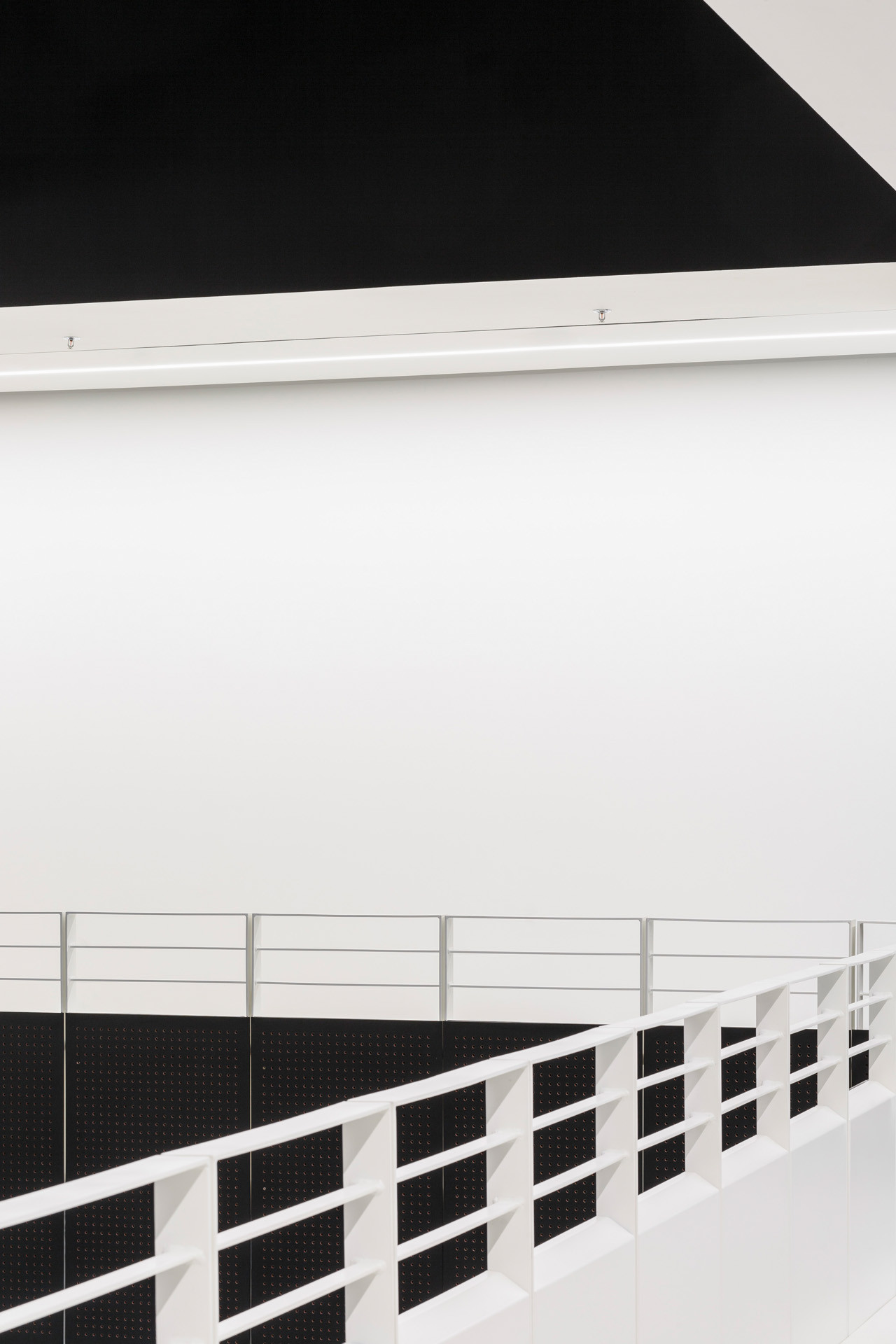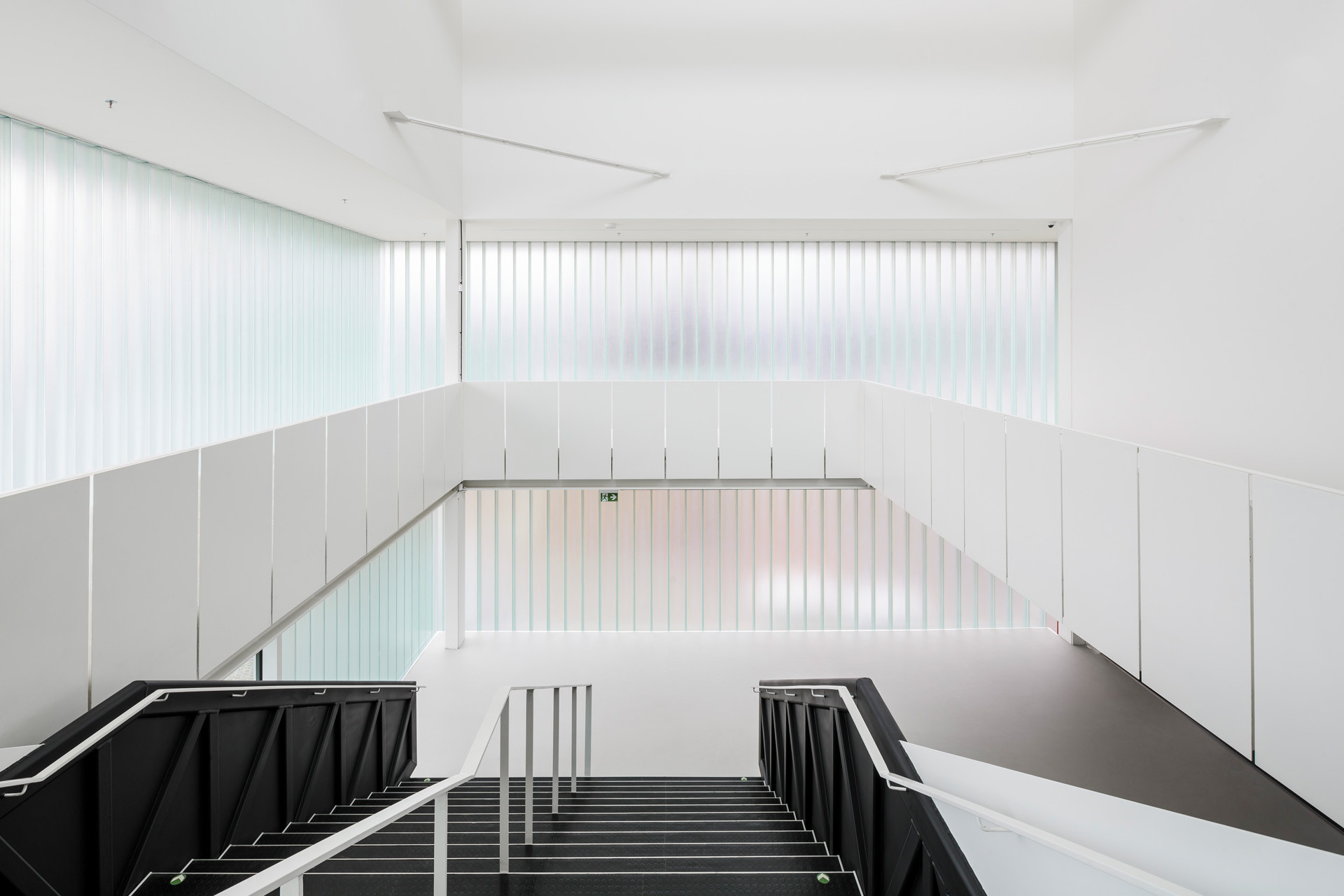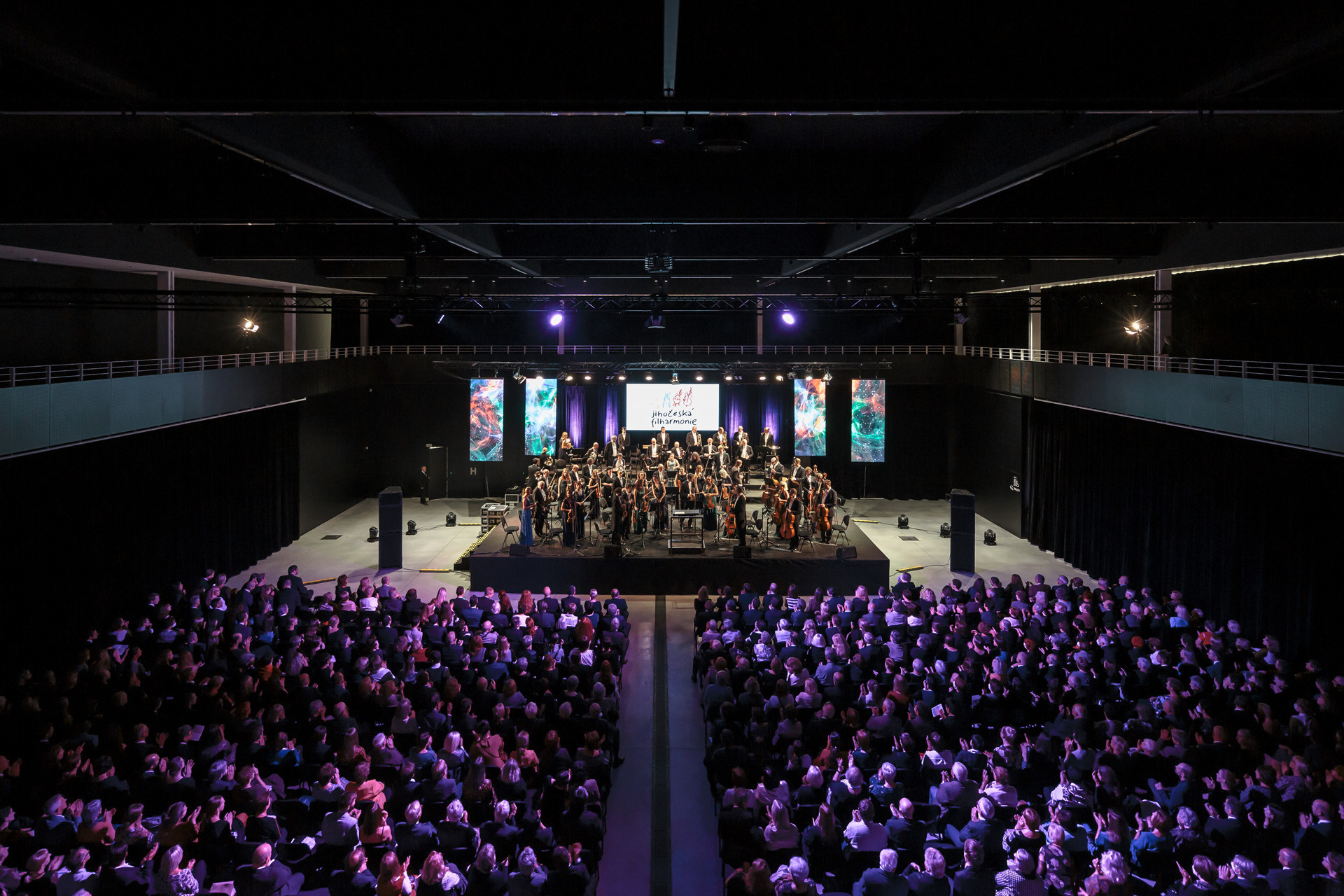 Interiérům dominuje vedle odhalené konstrukce zejména jednoduché černo-bílé ladění. Právě hlavní halu architekti navrhli jako celo-černou, světlo do ní přivádí především rozsáhlé skleněné plochy, které zároveň umožňují propojit interiér s exteriérem. Výhodou černé haly je ale také to, že se od svého okolí může kompletně izolovat, a to díky těžkým závěsům. „Jakmile jsou rozhrnuté, vniká okolní zeleň přímo do nitra sálu, jakmile se zatáhnou, vzniká naopak dokonalý blackbox,“ vysvětlují architekti.
