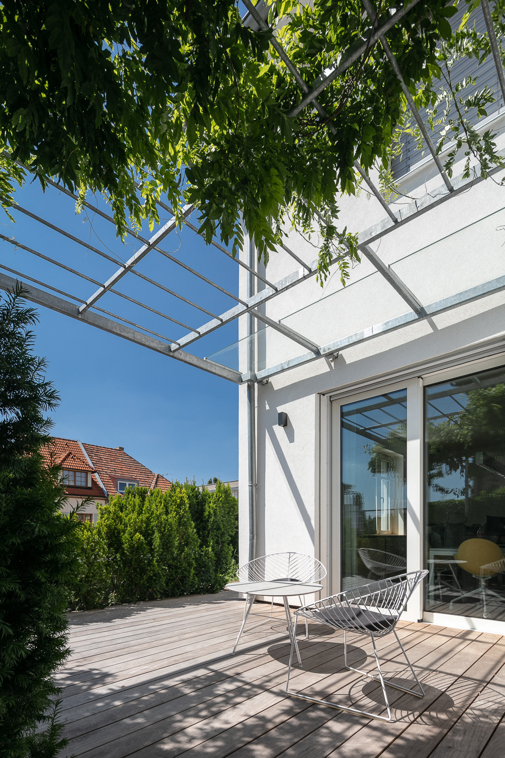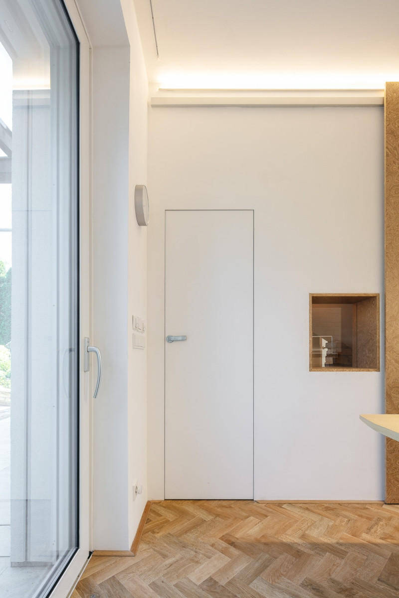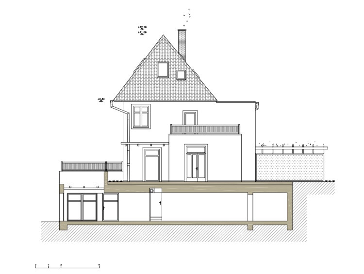 Polovina pražského dvojdomu ze 40. let minulého století prošla celkovou proměnou na sídlo rodinné firmy. Pojetím všech zásahů architekti ze studia Raketoplán navázali na umírněný charakter domu. Jížní část dvojdomu získala novou bílou fasádu a došlo také k rozšíření oken, která umožnila propojení interiéru s exteriérem. Hlavní pracovní místnost tak získala přímý vstup na venkovní terasu, z kanceláře šéfa pak lze vejít do východní zahrady. Reprezentativnost kanceláří podtrhují kvalitní přírodní materiály a povrchy.