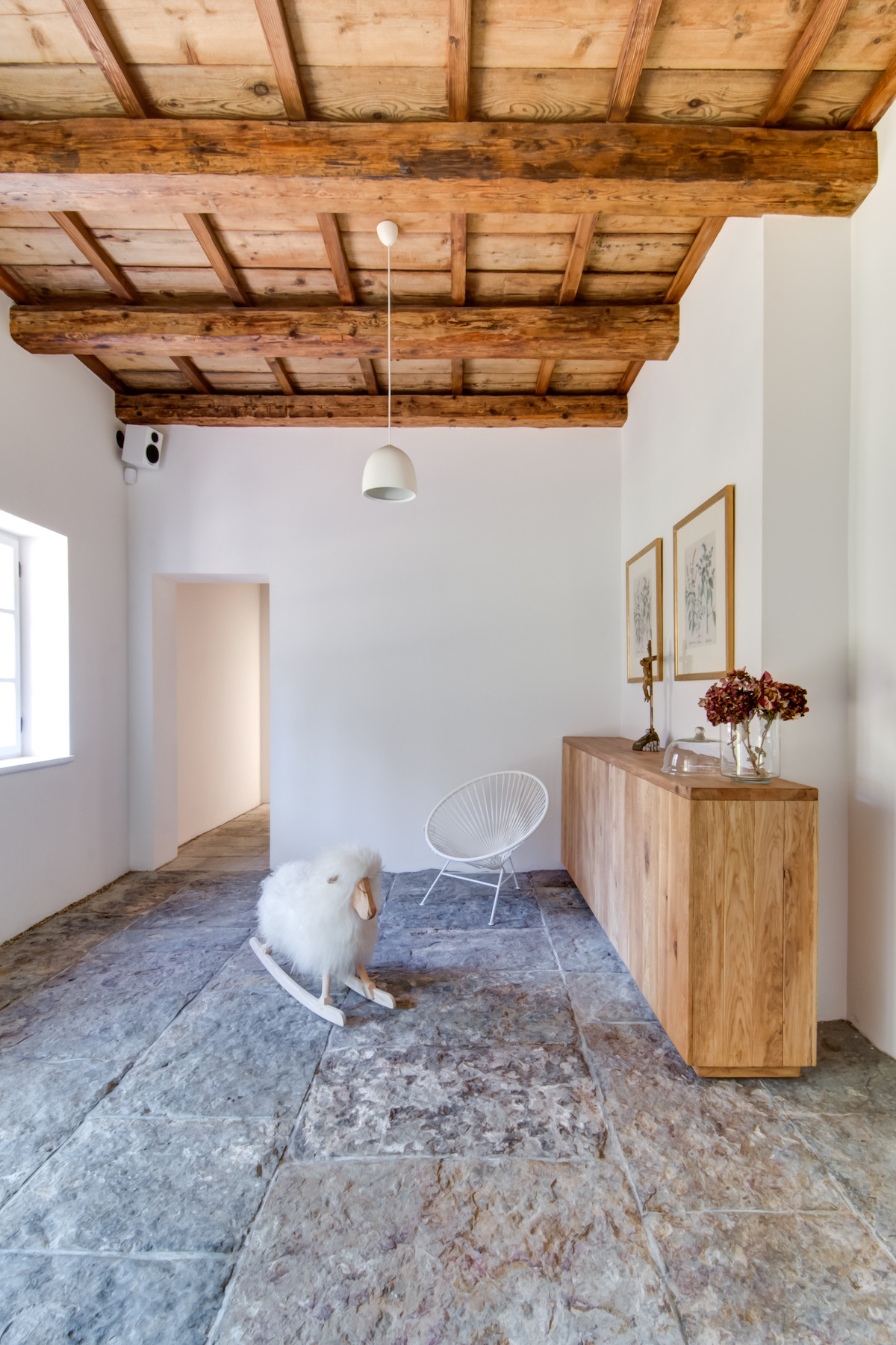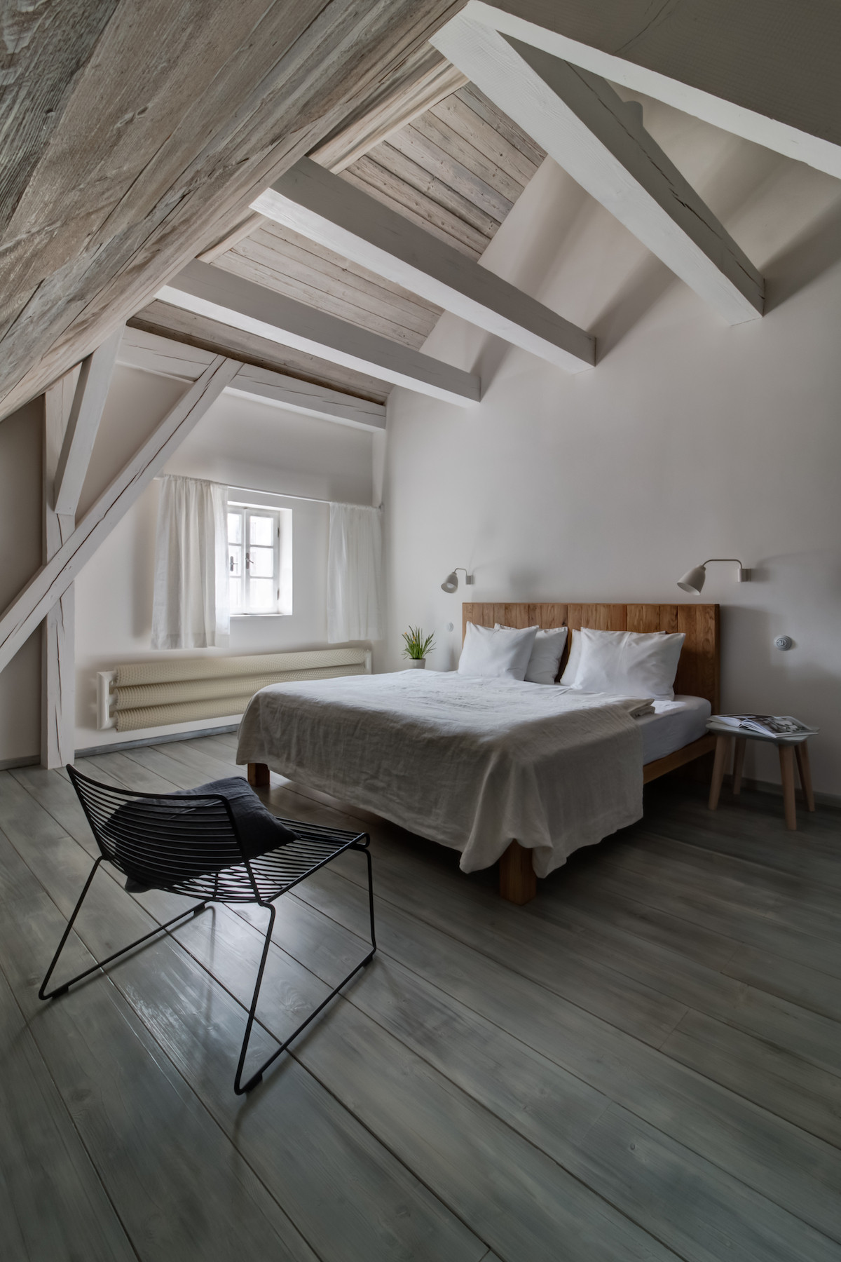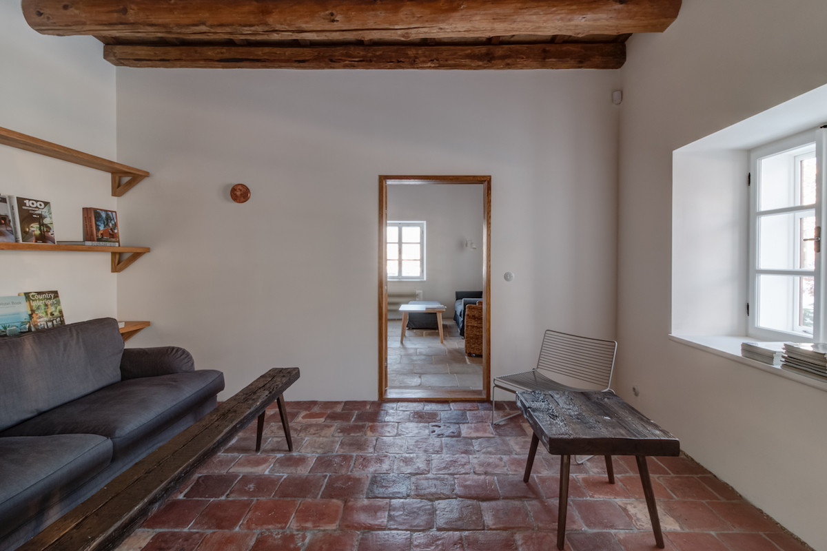 Mezi plůtky ctí udržitelnost v pravém slova smyslu. Na stavbu totiž byly maximálně využity lokální materiály. Poškozené trámy stropní kostry v přízemí nahradilo staré dřevo s přírodní povrchovou úpravou. V dříve neobývaném podkroví se zrestauroval a na bílo natřel krov. Opuka a kameny ze zaniklých domů a dvorů v širokém okolí pokryly podlahu v přízemí. Právě hrubé kamenné desky s výrazným reliéfem dominují jinak jemnému interiéru. V podkroví se zase hosté prochází po masivních smrkových prknech.