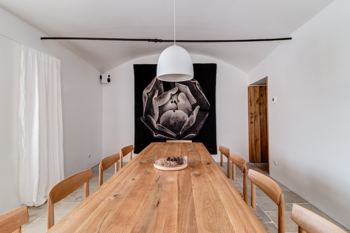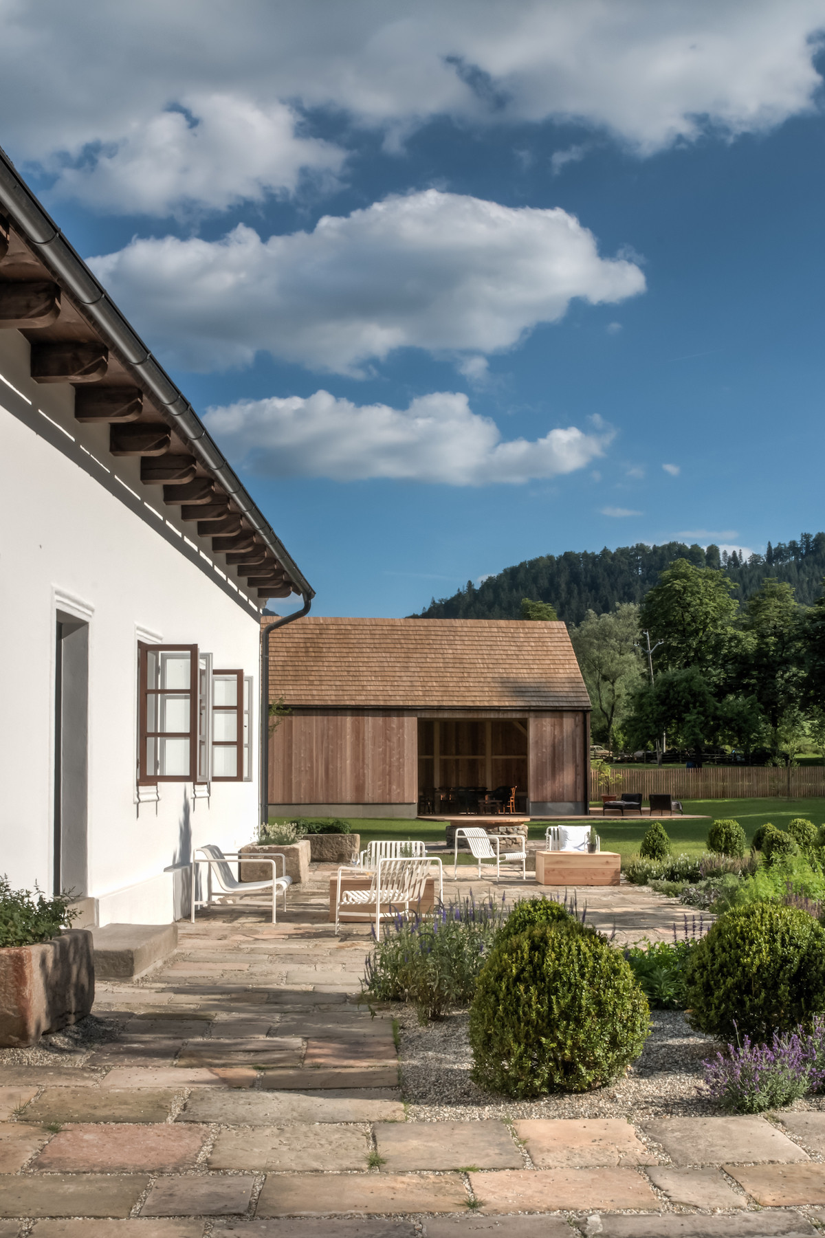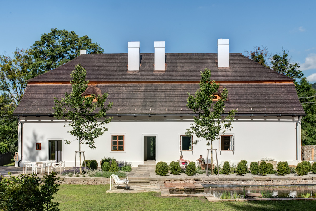 Působivému výsledku v podobě butikového hotelu, oploceného tradičními laťkovými plůtky a zídkami z místního kamene, předcházela rozsáhlá rekonstrukce. Obnovou trvající dva roky prošla původní šindelová střecha, štuková fasáda, špaletová okna a kamenné dvory. K objektu patří také zahrada osázená lokálními stromy a bylinami, stodola přeměněná na zimní zahradu a nádrž sloužící jako přírodní bazén. Nově přibyla ještě jedna stodola využívaná jako letní ložnice a sklad.