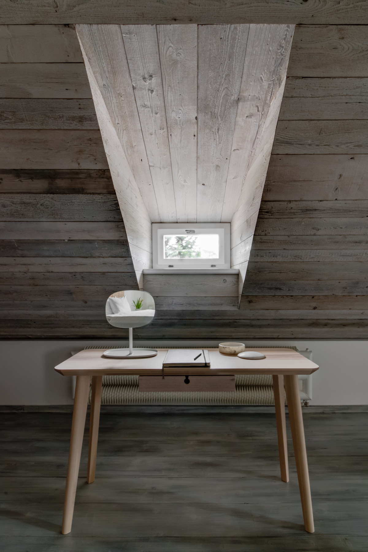 Z koncepce pokračování a respektu k tradici nevybočuje ani nábytek. Z dílny místních truhlářů vzešly svlakové dveře, atypická kuchyňská kredenc, jídelní stoly a masivní postele. Jídelnu zdobí gobelín od Petra Nikla znázorňující květ netřesku, který má podle tradice chránit horské chalupy před bleskem. Zmrzlina a sekt se podává ve skle od Františka Víznera. Místo televize tu najdete kvalitní zvukotechniku a knihovnu se sbírkou publikací o českém a zahraničním designu a architektuře.
