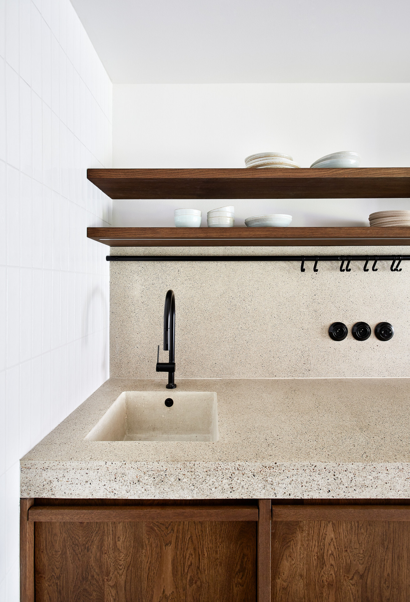 Při návrhu byly použity dva hlavní principy. První princip sleduje interiéry chalup a venkovských domů. Materiálové řešení, kuchyně, vestavné skříně i krbové těleso odkazují na tradiční české řemeslo, které je ovšem provedeno moderně. Tyto prvky bytu si tak zachovávají svou estetiku a snadno se udržují. Druhým principem je aplikování nadčasové a odolné betonové stěrky na podlahy. Výběr tohoto materiálu byl vzhledem k uvažované vytíženosti objektu nutností.