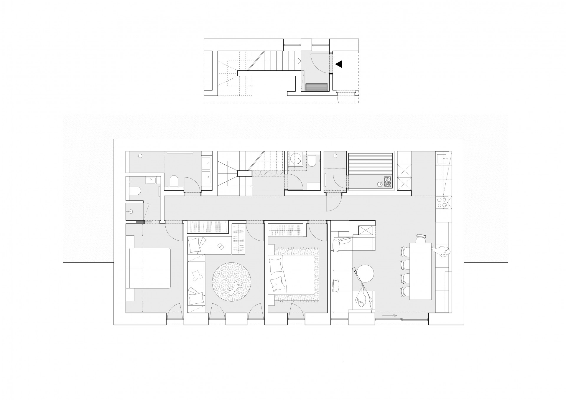 Byt se nachází v přízemí nového apartmánového domu v Jizerských horách, díky čemuž mají majitelé přímé propojení interiéru s okolní horskou krajinou. „Do apartmánu se vstupuje z druhého patra malou předsíní, která navazuje na dvouramenné schodiště. Tuto cestu přes předsíň a sestoupení po schodech do nižšího patra přímo do nitra bytu lze chápat jako jakýsi filtr,“ popisuje architektka Markéta Bromová.