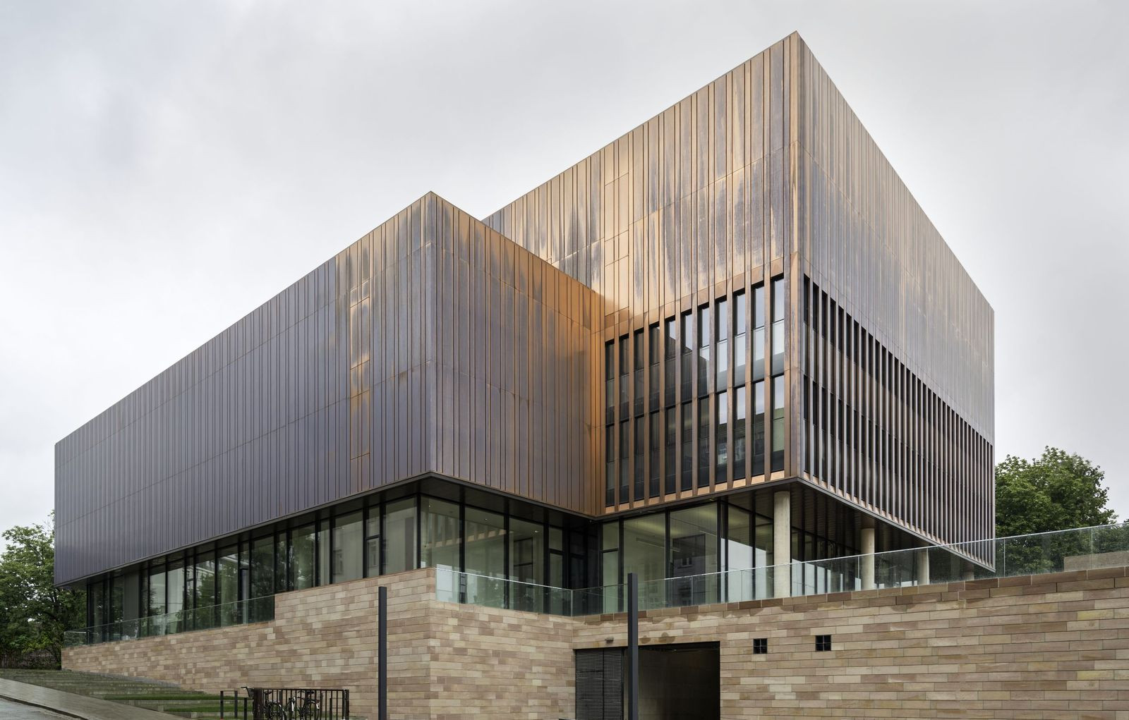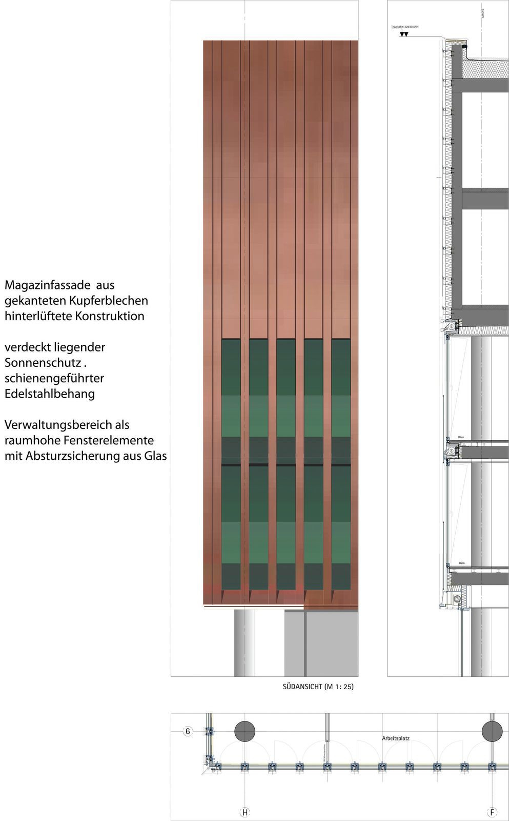 Podstavec z armované ocelové konstrukce je obložen načervenalým pískovcem, tvořícím pokračování stávající pískovcové zdi a usazujícím budovu do jejího krajinného kontextu. Obvodové stěny archivu mají lesklou měděnou fasádu se subtilní vertikální strukturou. Přírodní kovový povrch stále přirozeně oxiduje a mění barvu, až nakonec vznikne sametový, tmavě hnědý vzhled.