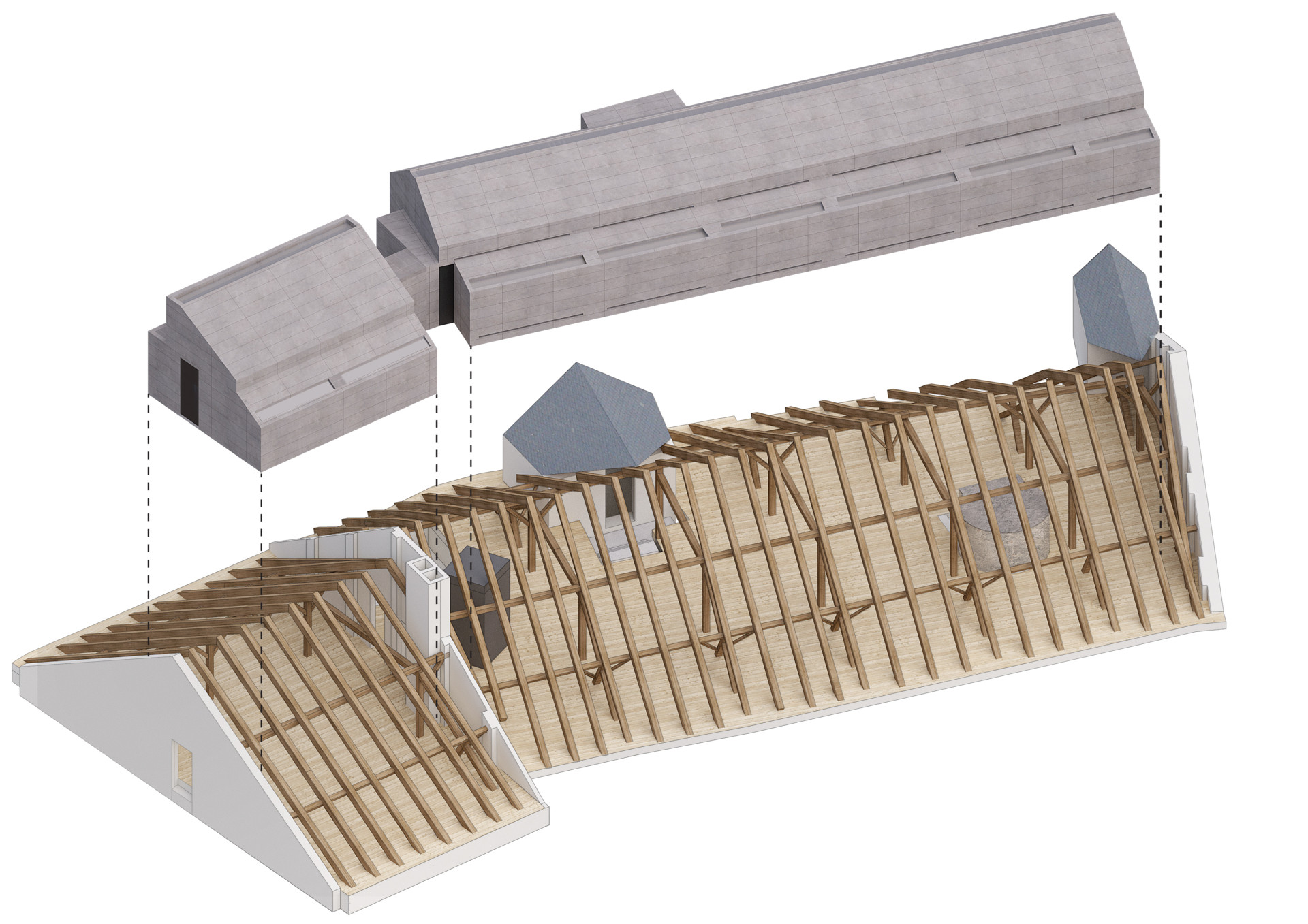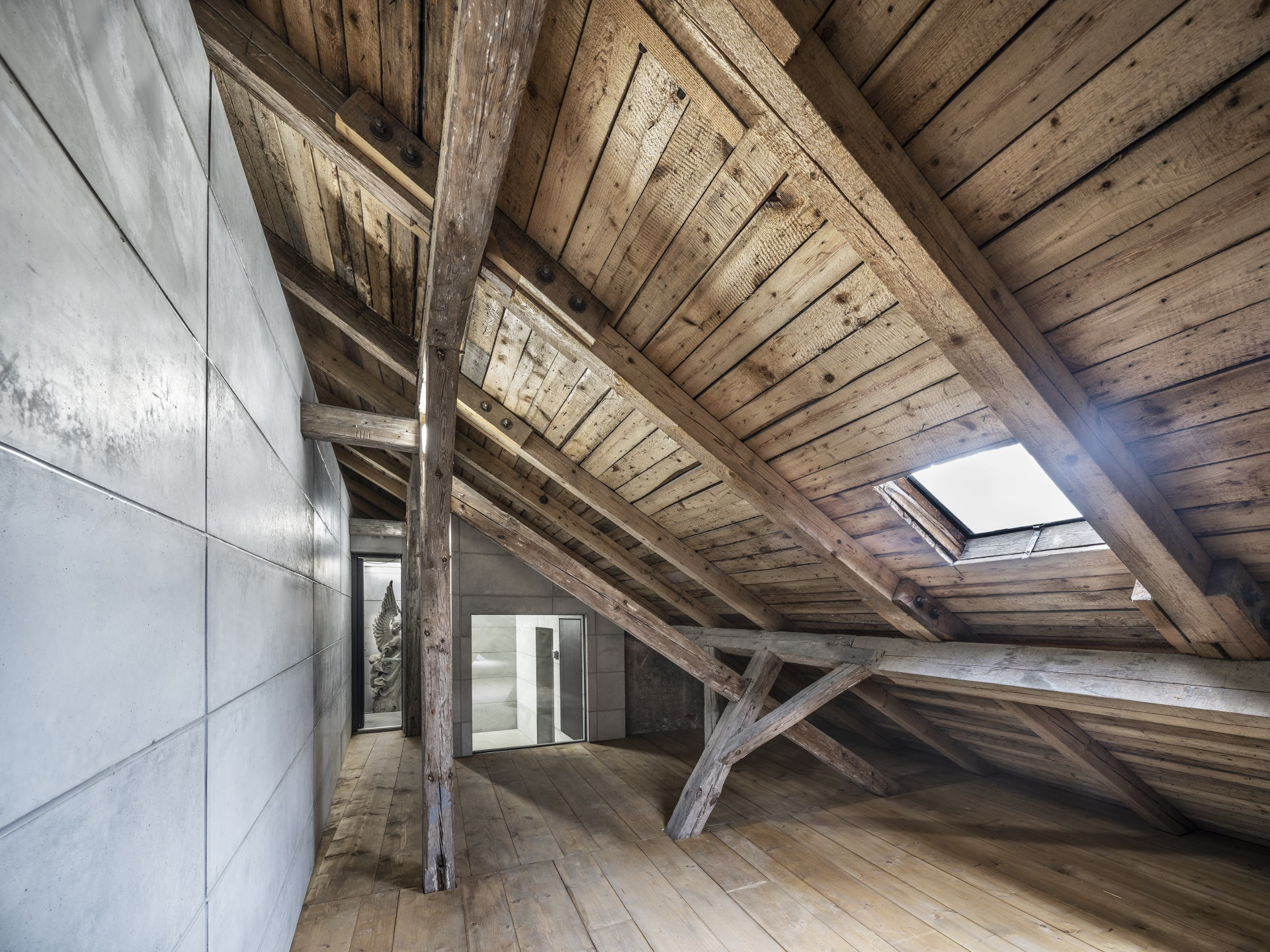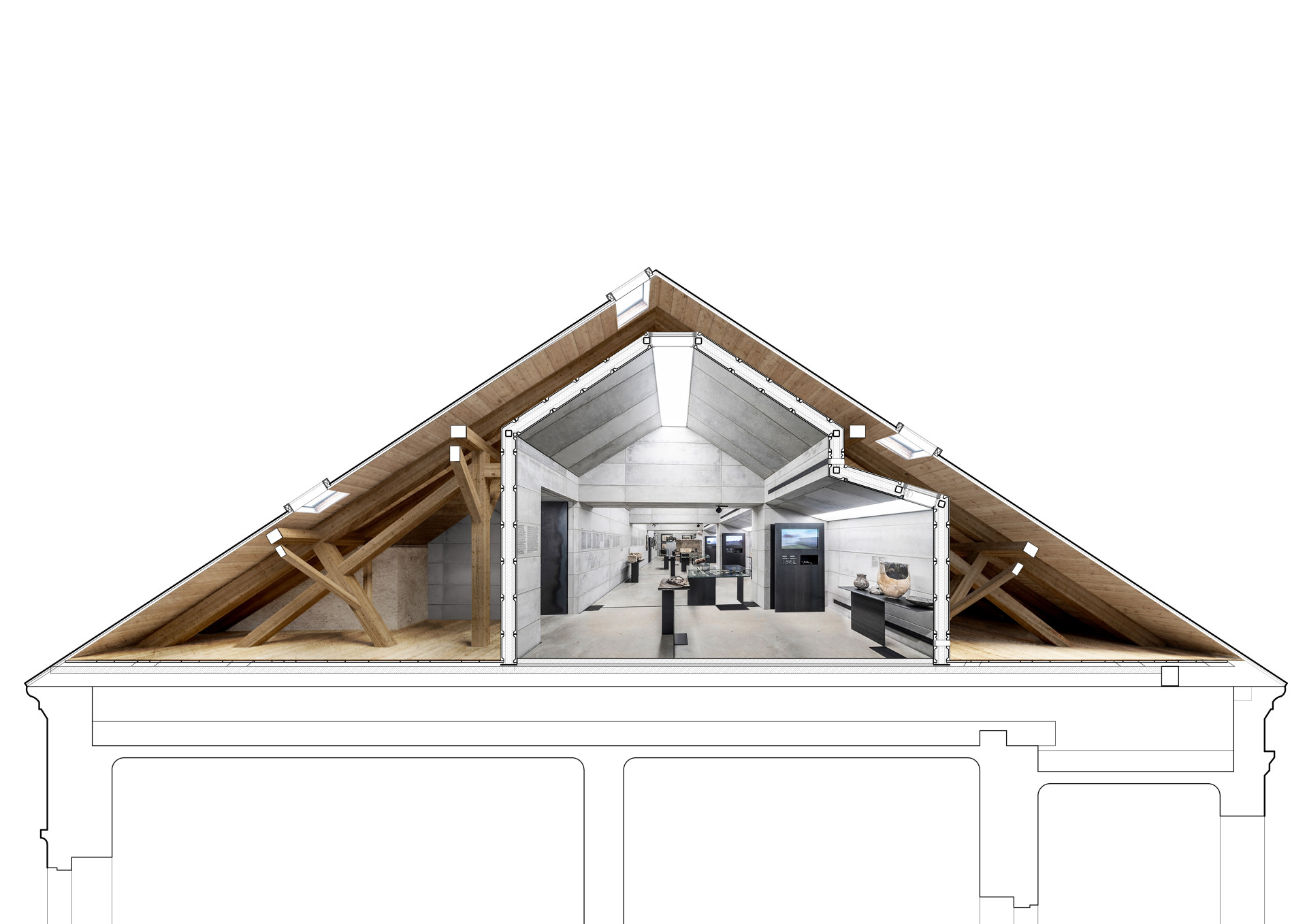 Vložené těleso kopíruje sklon krovu s tím, že si udržuje odstup od historických konstrukcí. Funguje jako dům navržený do venkovní prostředí – kromě hydroizolačních požadavků, které zajišťuje stávající střecha, splňuje všechny tepelně-technické parametry a má integrované vytápění, vzduchotechniku, chlazení i osvětlení.