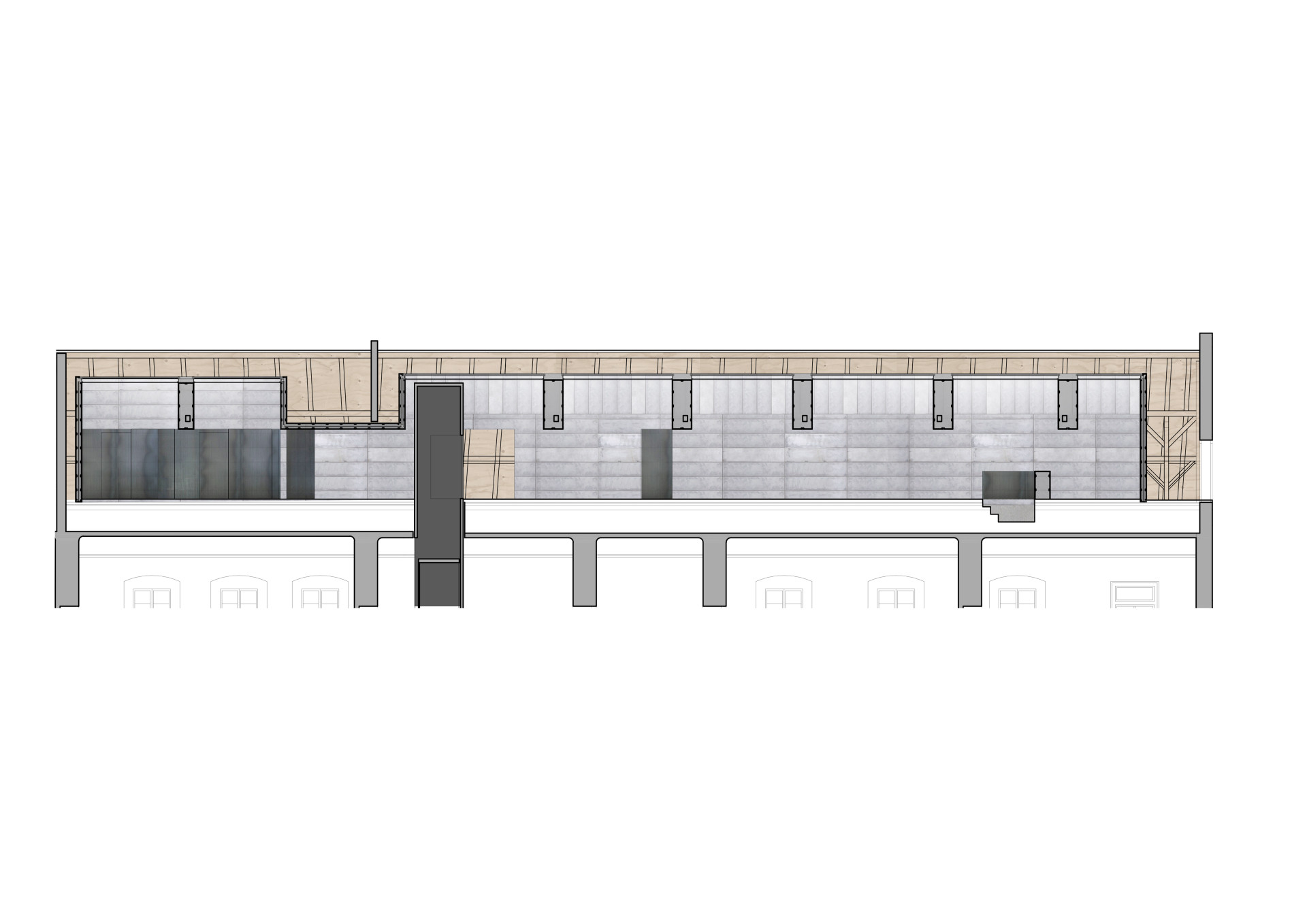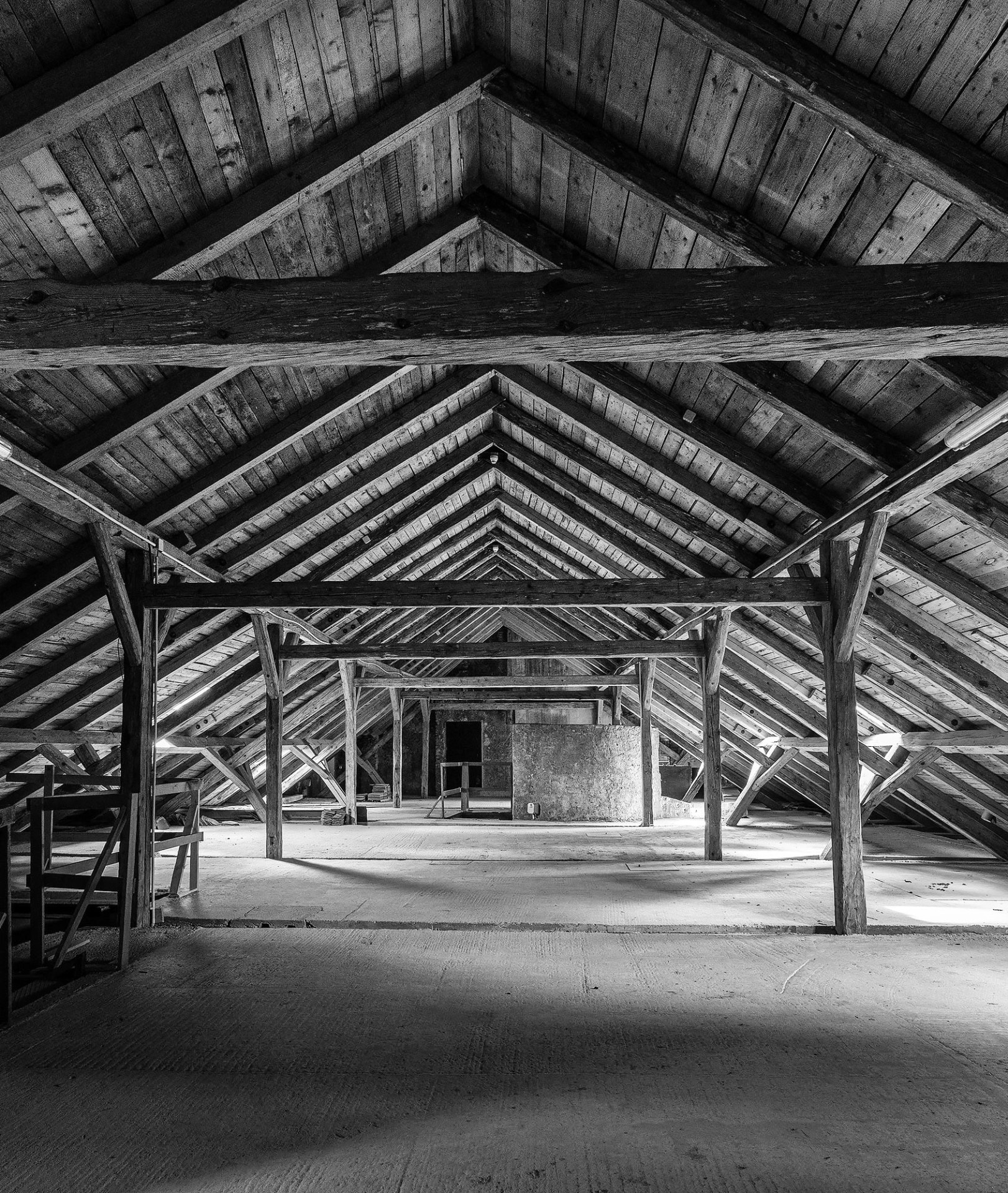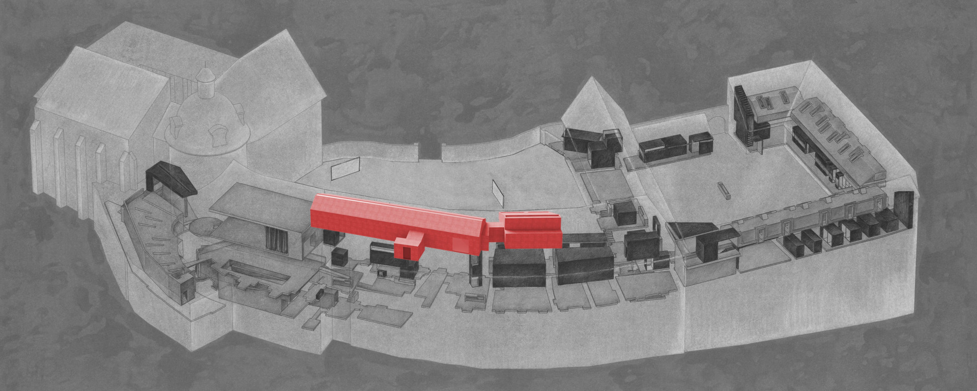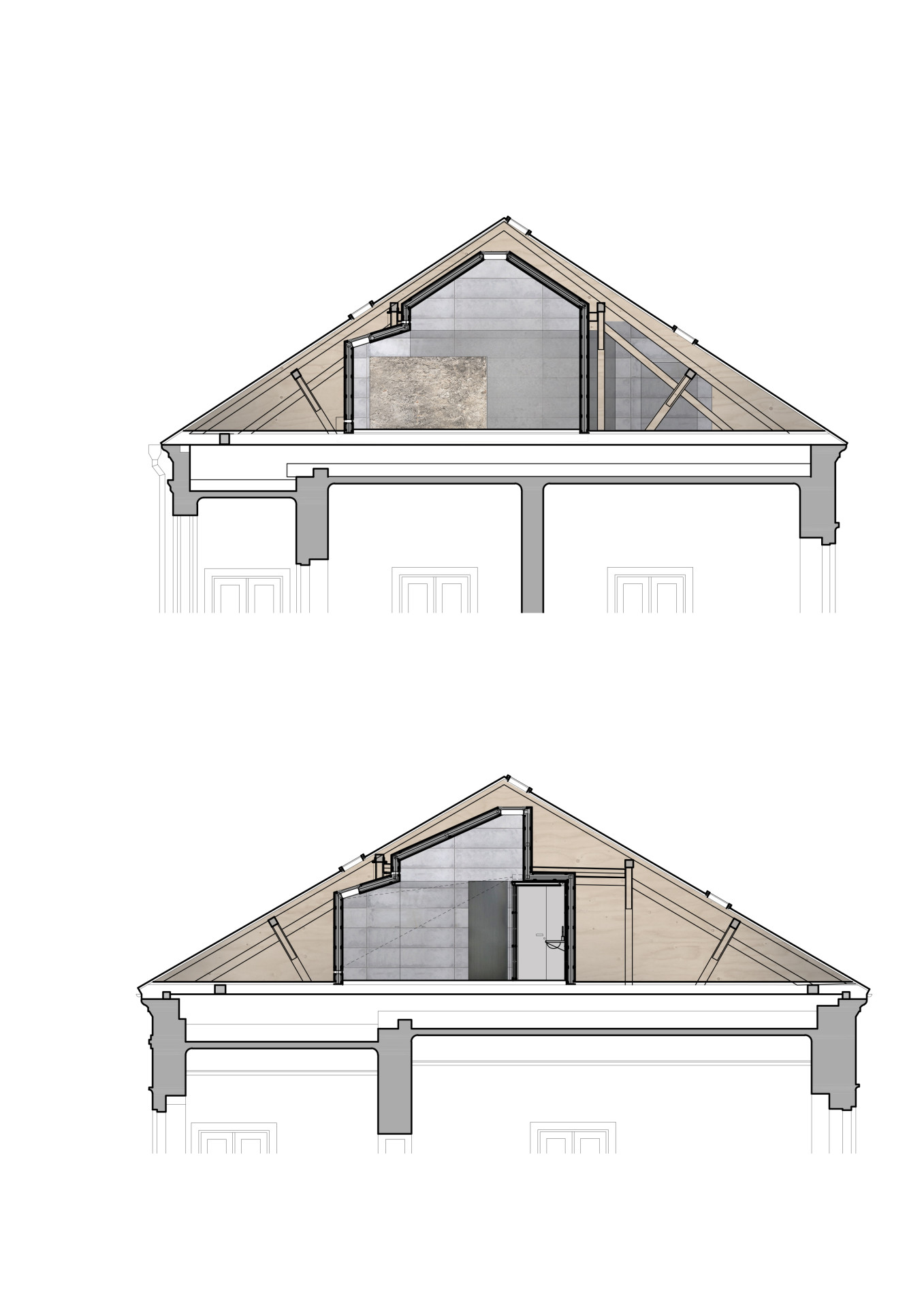 Vložené těleso kopíruje sklon krovu s tím, že si udržuje odstup od historických konstrukcí. Funguje jako dům navržený do venkovní prostředí – kromě hydroizolačních požadavků, které zajišťuje stávající střecha, splňuje všechny tepelně-technické parametry a má integrované vytápění, vzduchotechniku, chlazení i osvětlení.