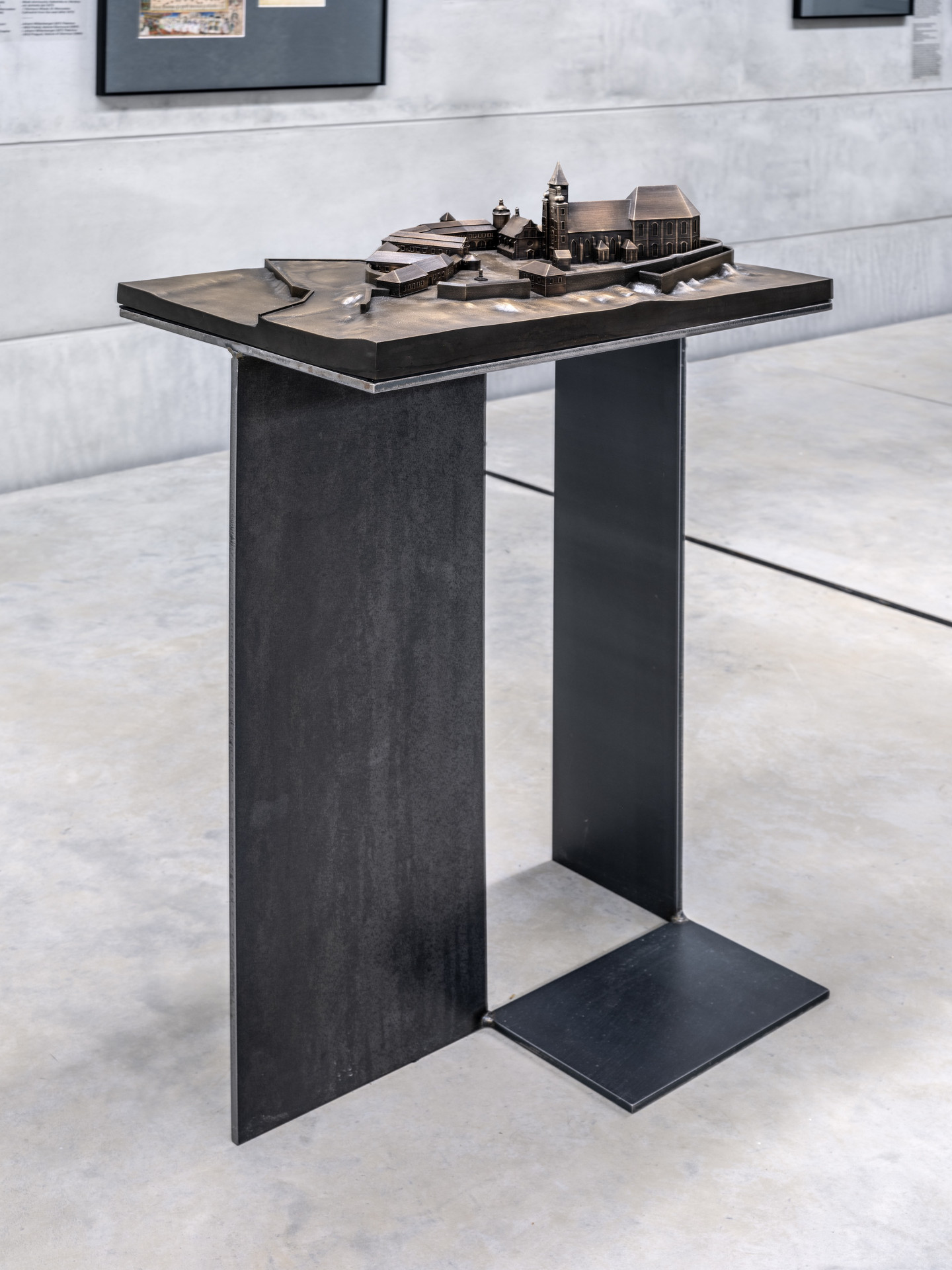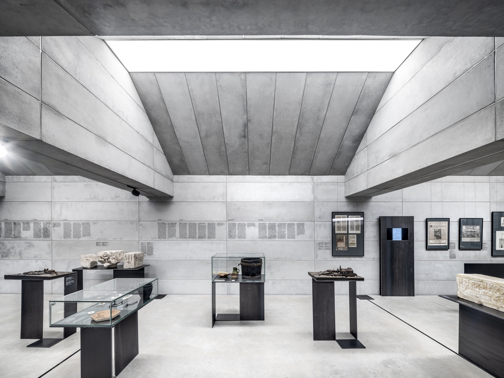 Nový objekt nabízí dostatek svislých stěn pro vystavování. Další exponáty stojí v prostoru na kovových soklech, najdeme tu archeologické nálezy nebo faksimilie Olomouckého horologia z 12. století. Stojany pro digitální média jsou vyrobené také z kovu a celá expozice tak působí sjednoceně. Kromě exponátů lze také díky proskleným otvorům v konstrukci nového betonového tělesa nahlédnout do vrchní část cihelné klenby nebo původního krovu.