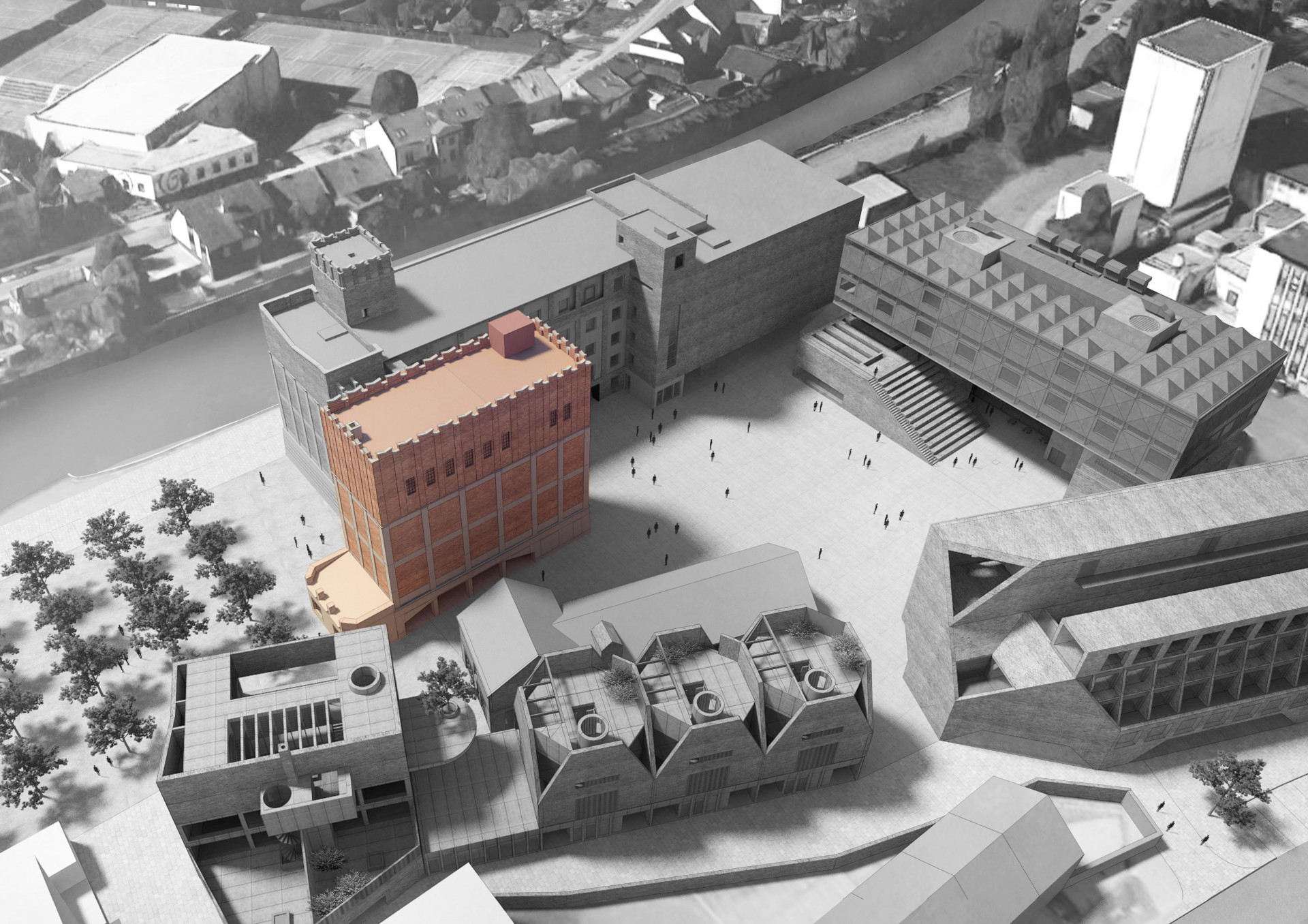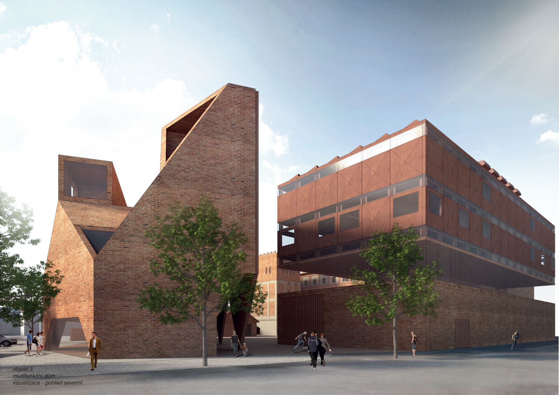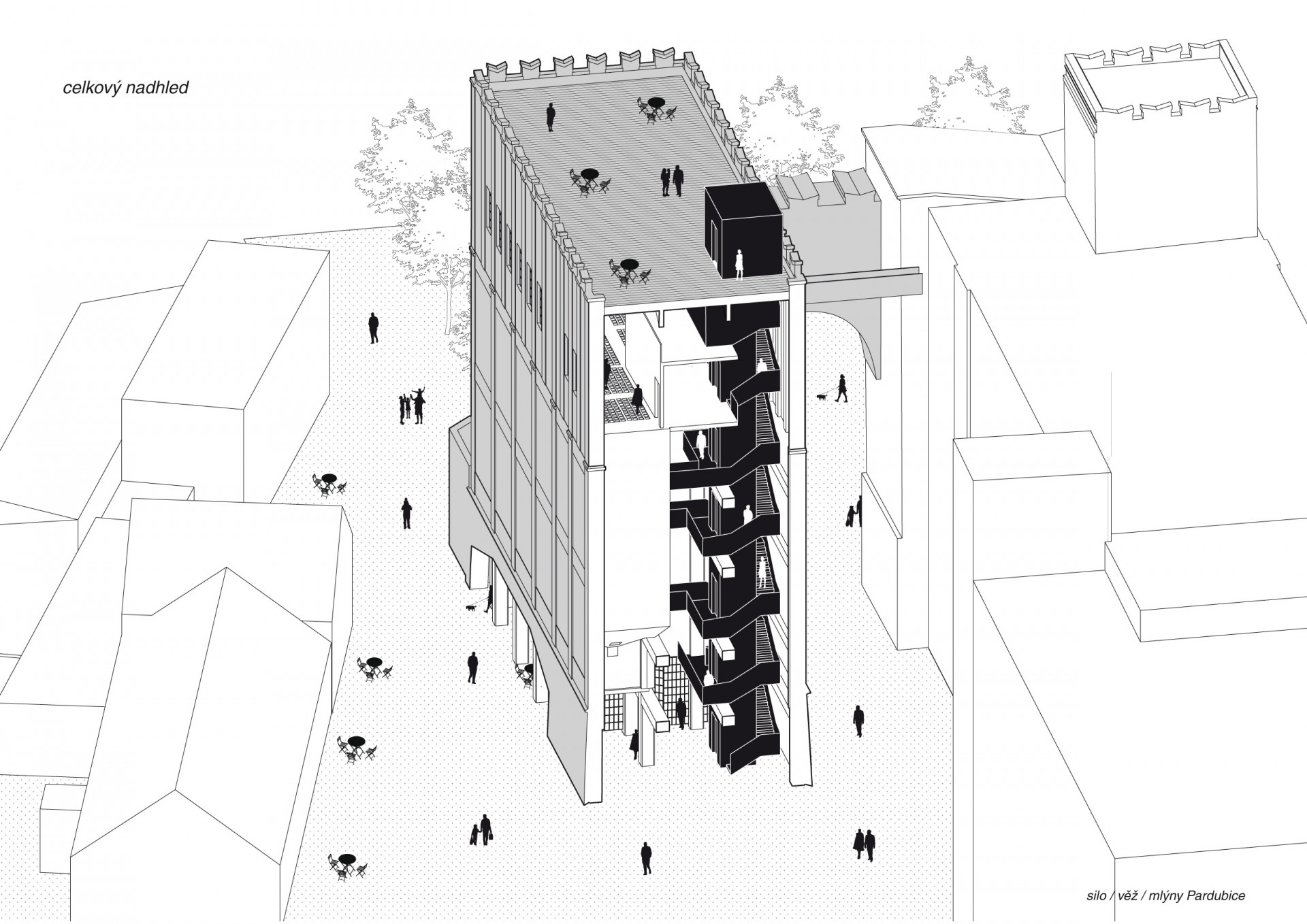I když budou v areálu mlýnů působit dvě přední galerijní instituce Pardubického kraje, nestane se pouze kulturním ostrovem. Jeho součástí totiž budou i stavby pro bydlení a práci. Zdenek Balík pro areál navrhl několik rodinných domů – většinou se bude jednat o novostavby, jeden ale vznikne i přestavbou menšího původního objektu. Východní stranu areálu nakonec dotvoří nová polyfunkční budova s byty, kancelářemi a obchodním parterem. „Z pohledu nově vzniklého náměstí, které je v prostoru zcela novým amfiteátrem, jej hmotově lemuje a uzavírá,“ říká o polyfunkční budově Zdenek Balík z ateliéru Zette.