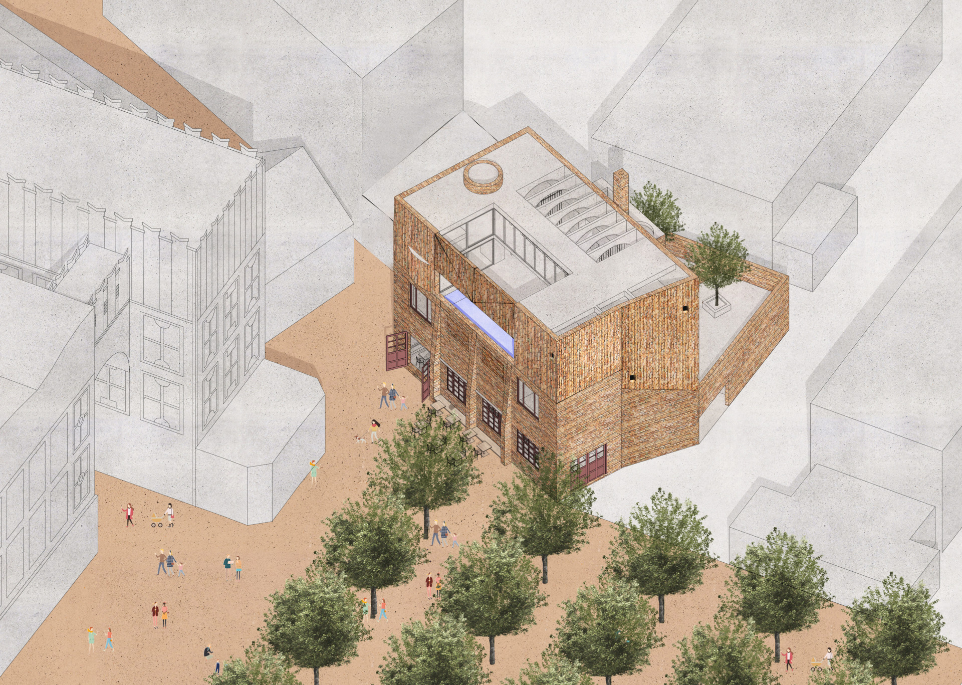 „Naprosto zásadní z hlediska oživení bývalých mlýnů je vznik nových veřejných prostor. Vytváříme dva veřejné prostory, které mají záměrně rozdílný charakter i funkci,“ vysvětluje Jan Šépka. Vedle menšího Mlýnského náměstí zde totiž vznikne i větší prostranství přímo před průčelím mlýnů, které bude osázené platany a bude sloužit ke konání nejrůznějších komunitních akcí, například trhů.