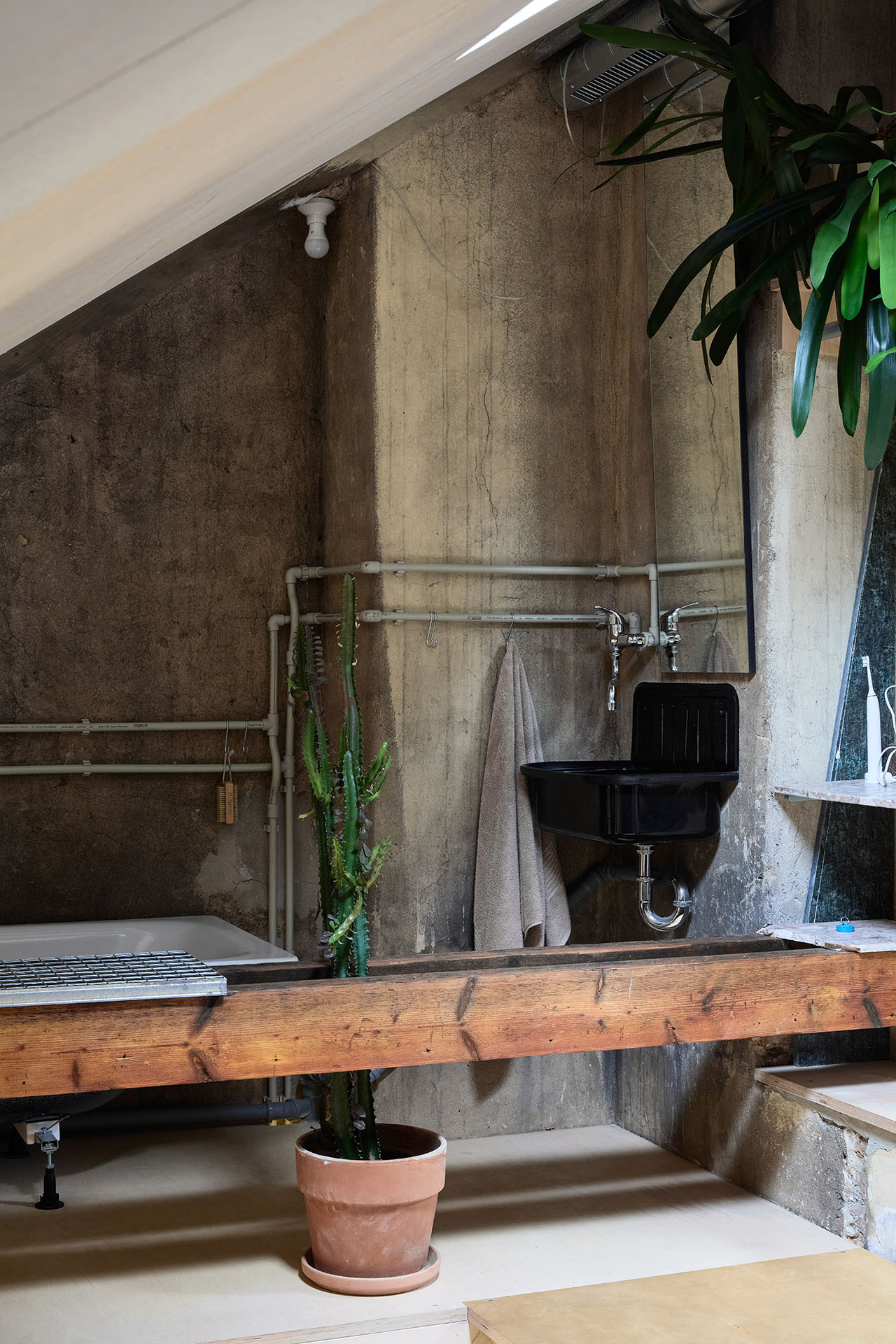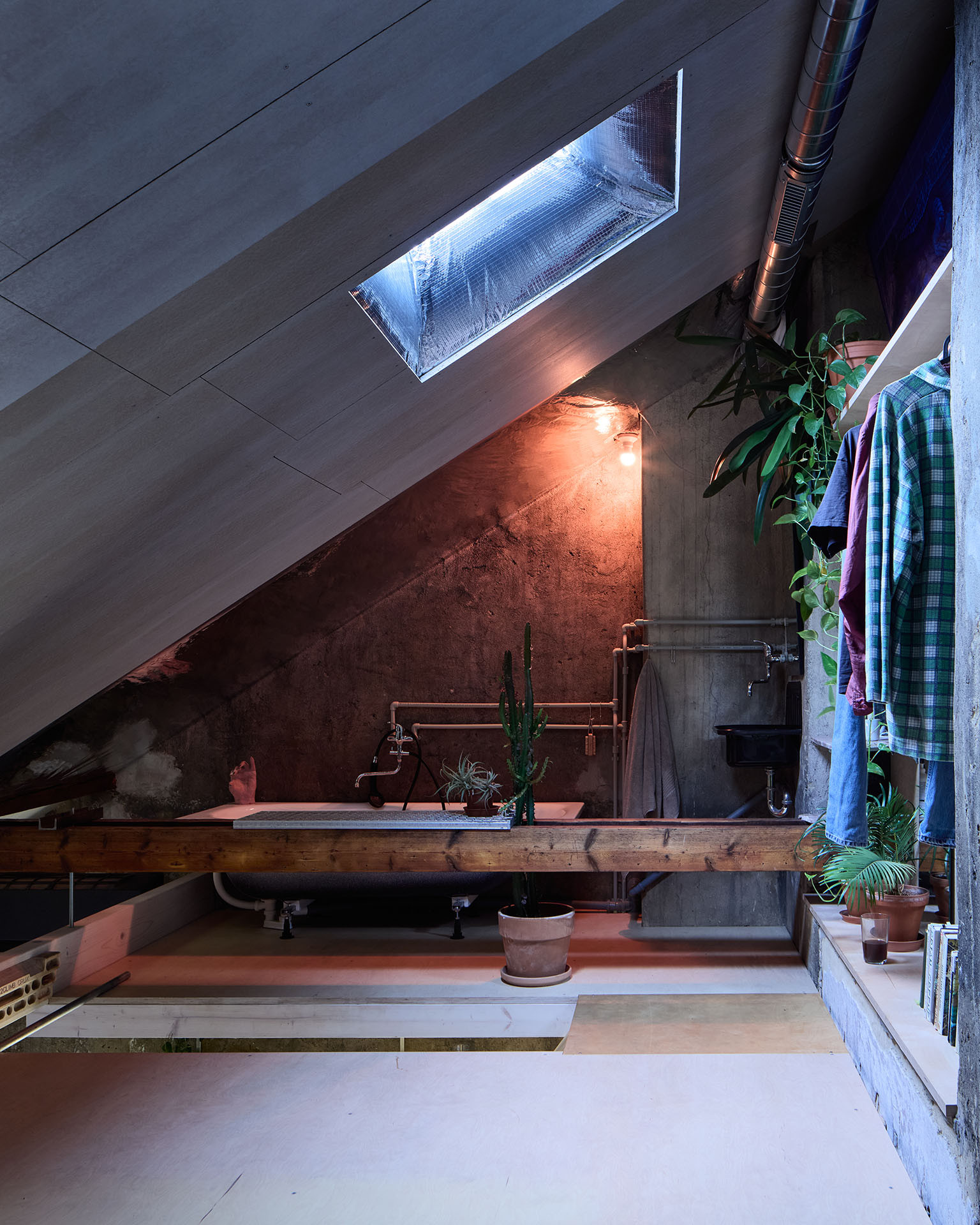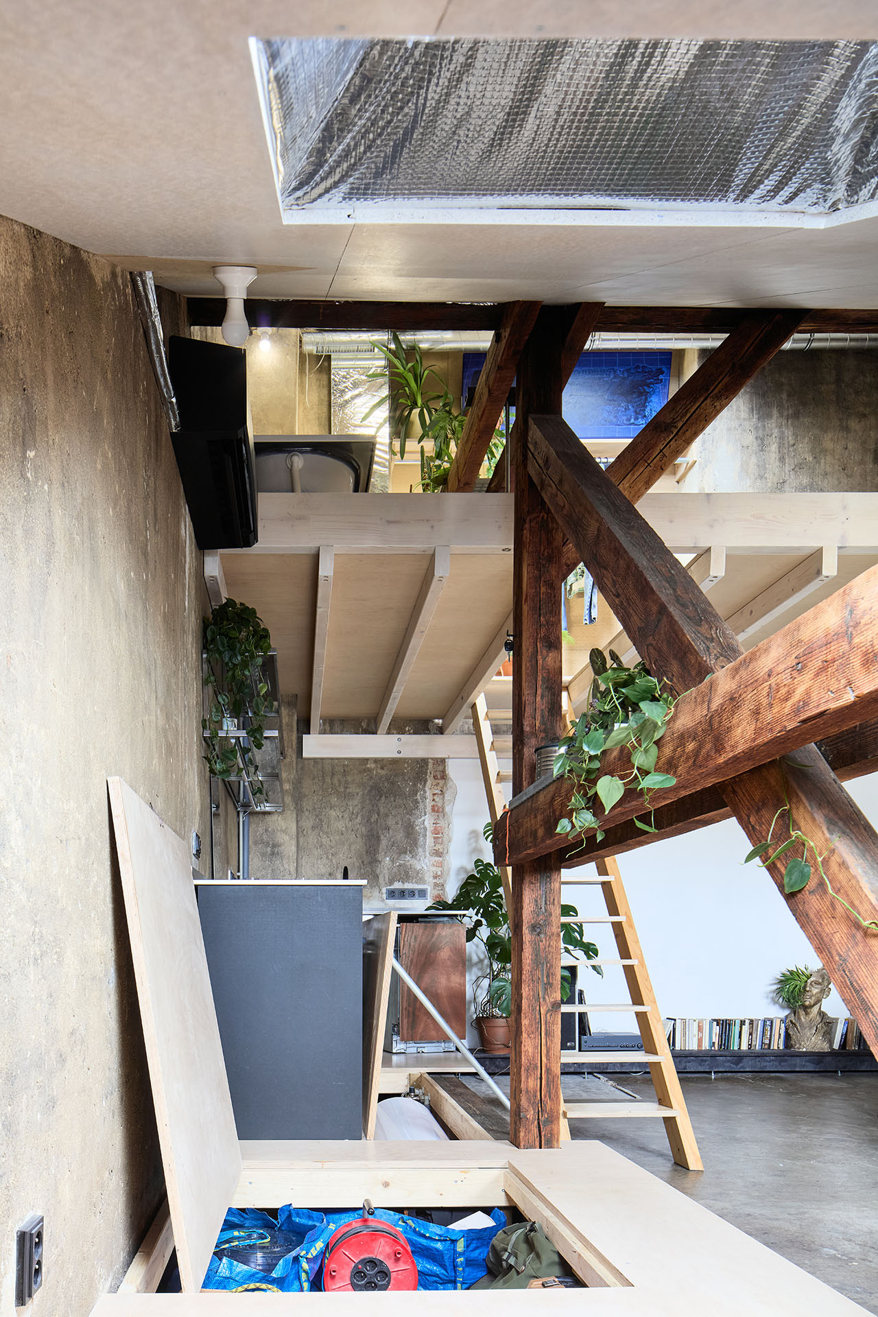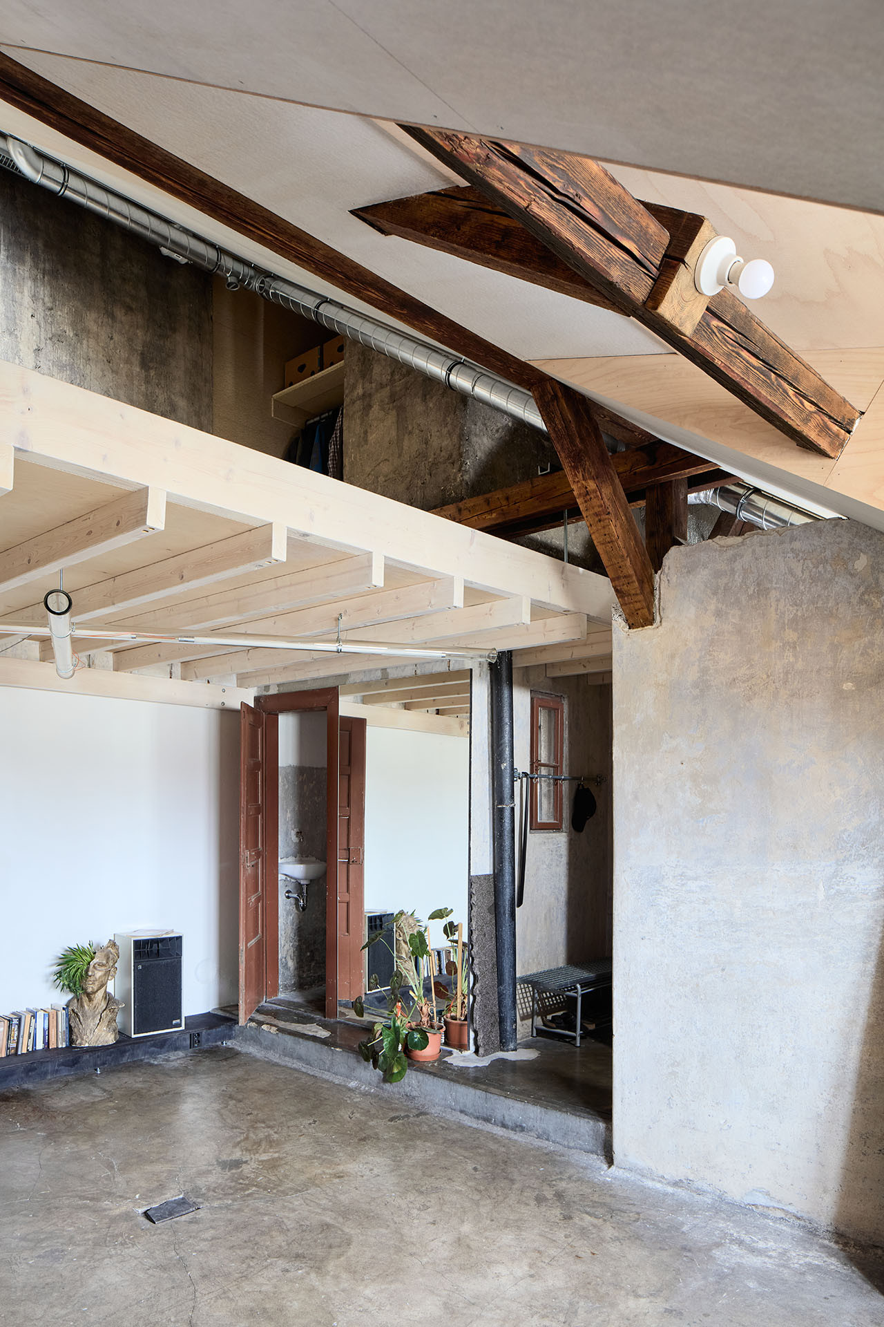 „Rekonstrukci jsme řešili svépomocí, což je pro nás v obdobném měřítku stavby zvládnutelná a zábavná kompenzace práce na počítači,“ říkají o ateliérovém bytě na půdě architekti ze studií totalbrutal a svobodová blaha. Výsledkem je bydlení, které by si u architektů běžný klient pravděpodobně neobjednal – a není to vůbec míněno negativně.