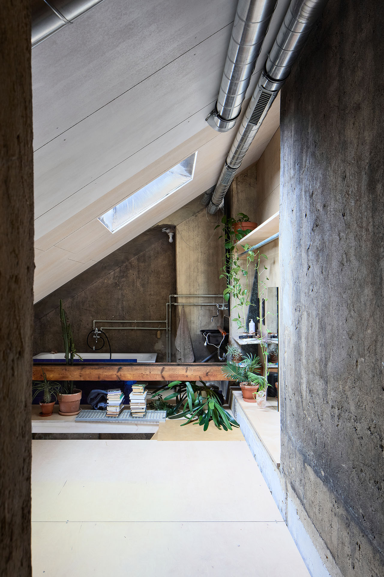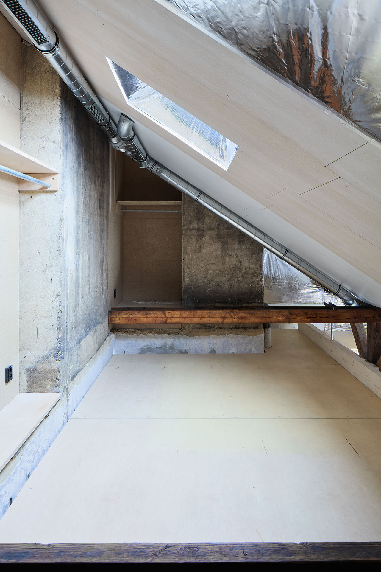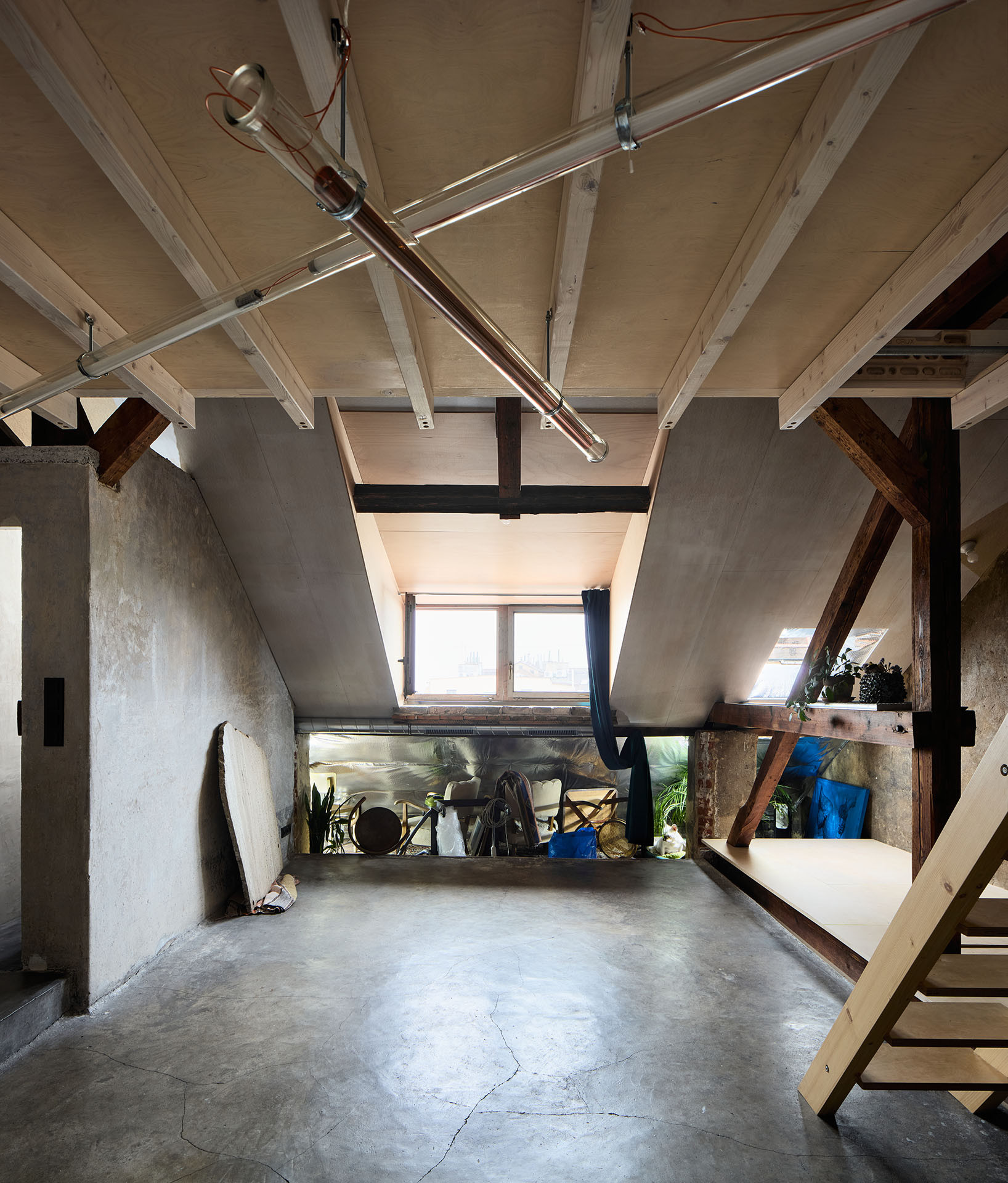 Přesto se ateliérový byt architektů pod střechou pražského činžáku od zmíněných realizací liší. Má totiž nezvykle surovou estetiku. Práce s „přiznanými materiály“ zde šla na absolutní dřeň. Vidět zůstaly nepohledové trubky rozvádějící vodu, DTD desky (tj. dřevotřískové desky) nebo reflexní parotěsná folie – v ostění oken odráží světlo a podkroví tím dělá jasnější. Vizuální stránka ateliéru tedy primárně podmiňuje funkčnost a praktičnost prostoru.