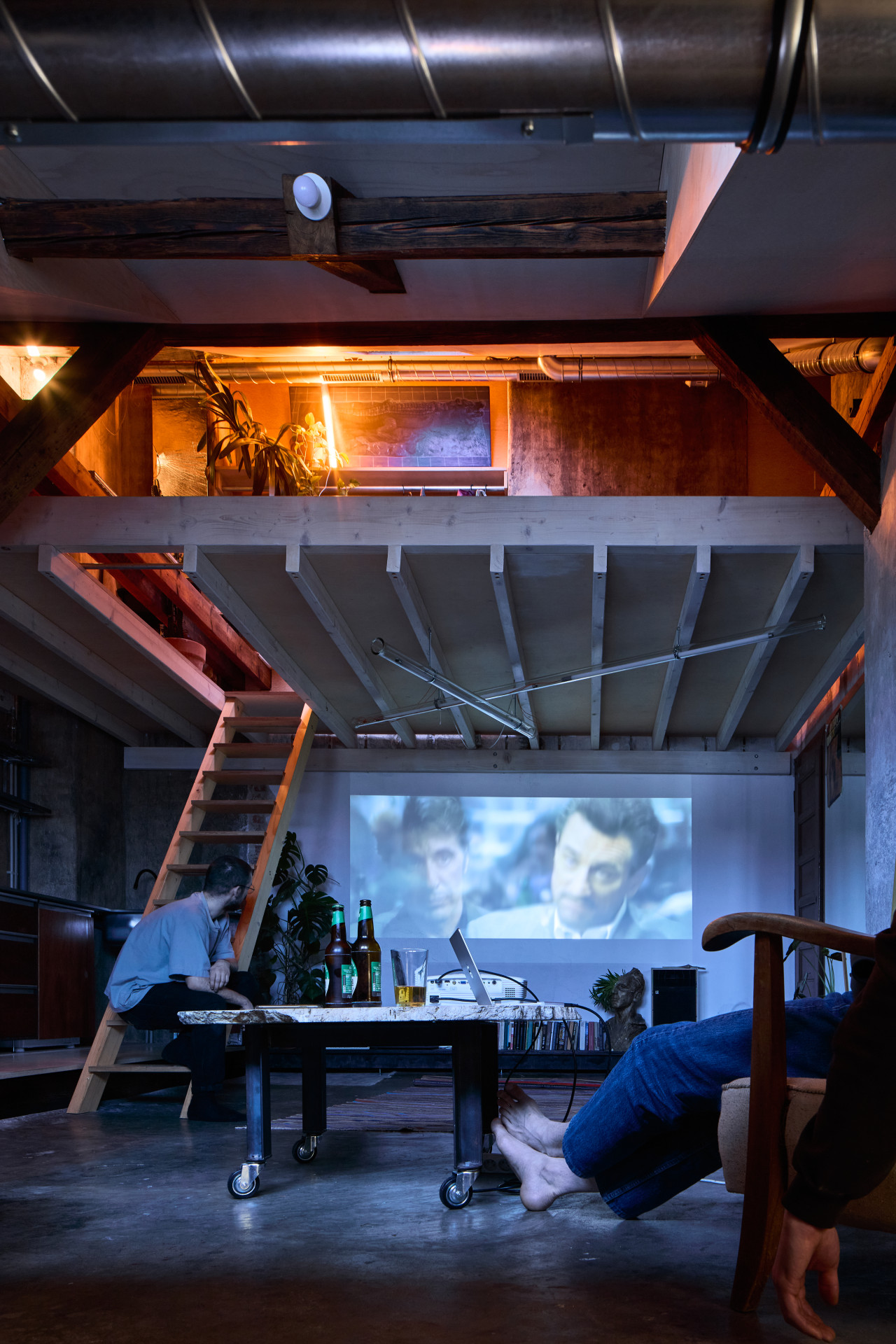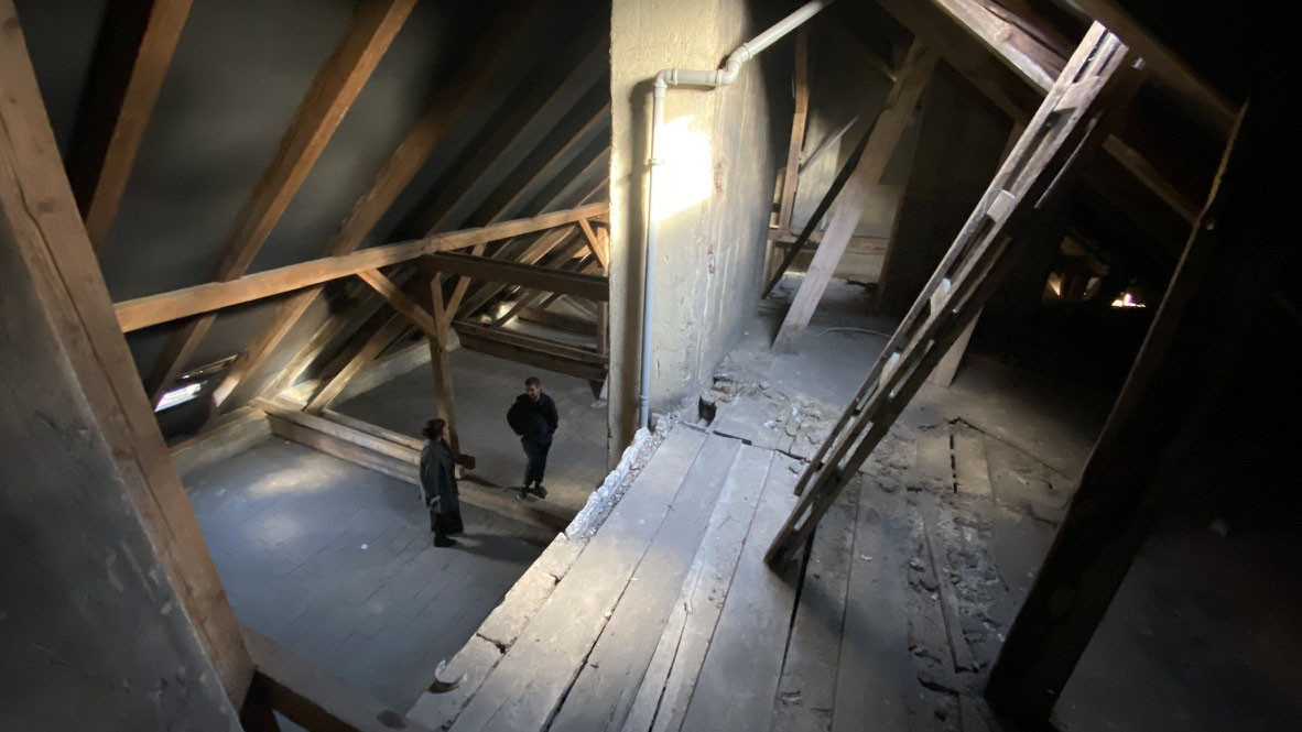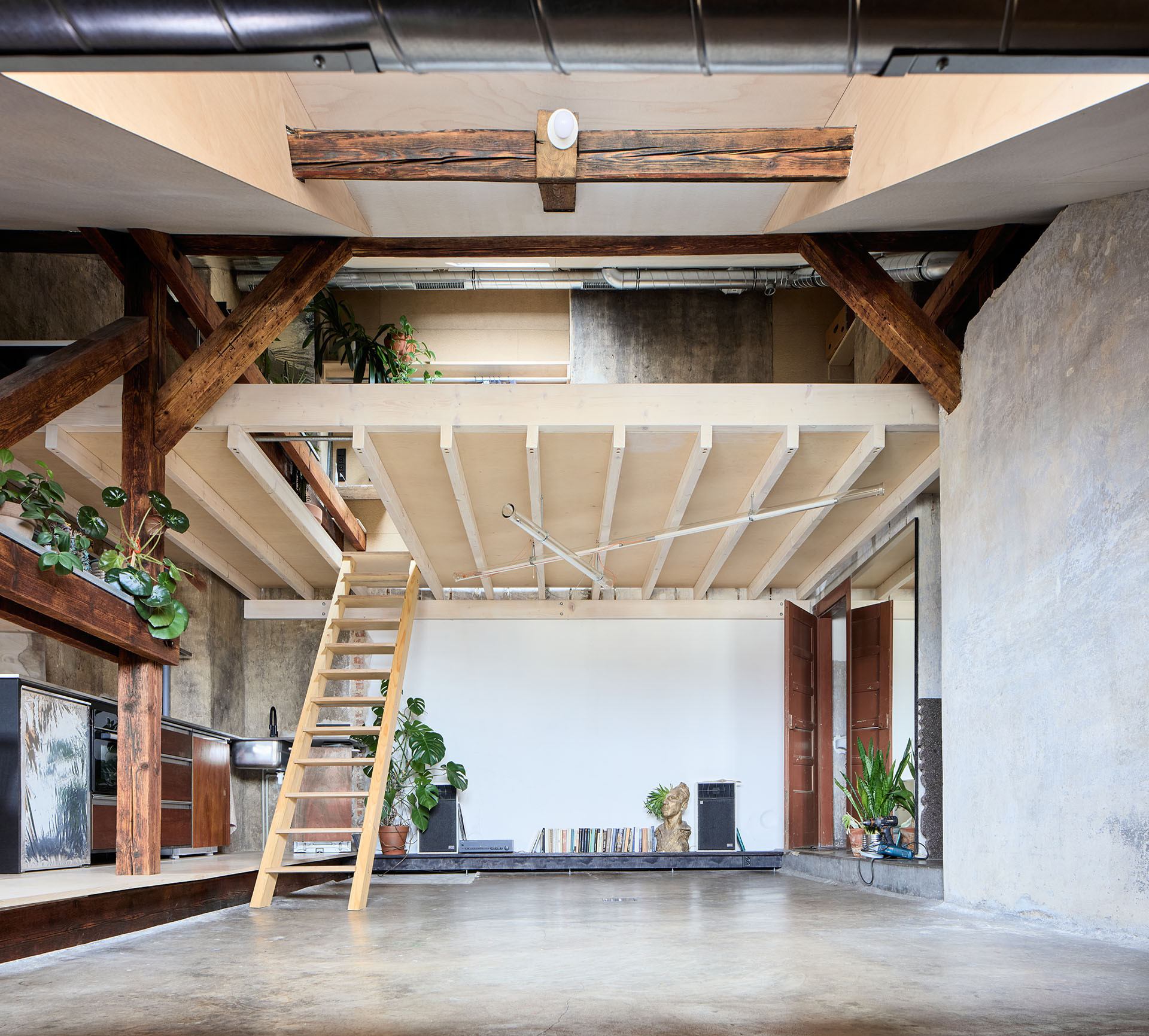 Kuchyně a světlo jsou ovšem jednotlivosti, největším zásahem se stalo vybudování mezipatra, je zavěšené do původního krovu a architekti říkají, že co možná nejcitlivěji. Jelikož je ateliér v šestém patře a nahoru nevede výtah, muselo se postavit z toho, co šlo nahoru vynést vlastníma rukama. Pro konstrukci se zvolily se dřevěné trámy, podlaha je z březové překližky. Rozdíly mezi starým krovem a novým mezipatrem finálně podtrhla povrchová úprava – nové dřevo dostalo bílou olejovou lazuru, zatímco to staré nesoucí střechu se ošetřilo lněnou fermeží.
